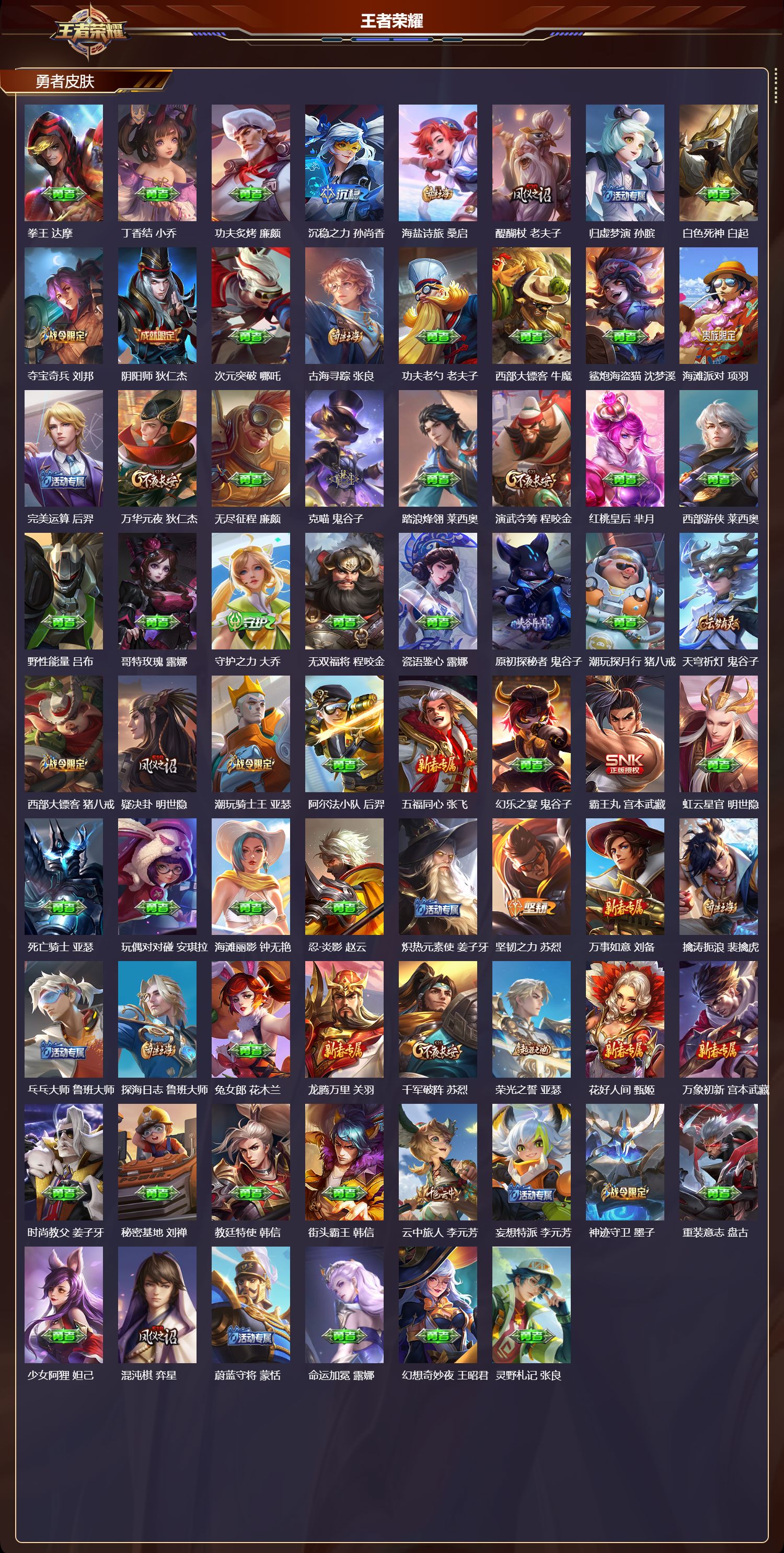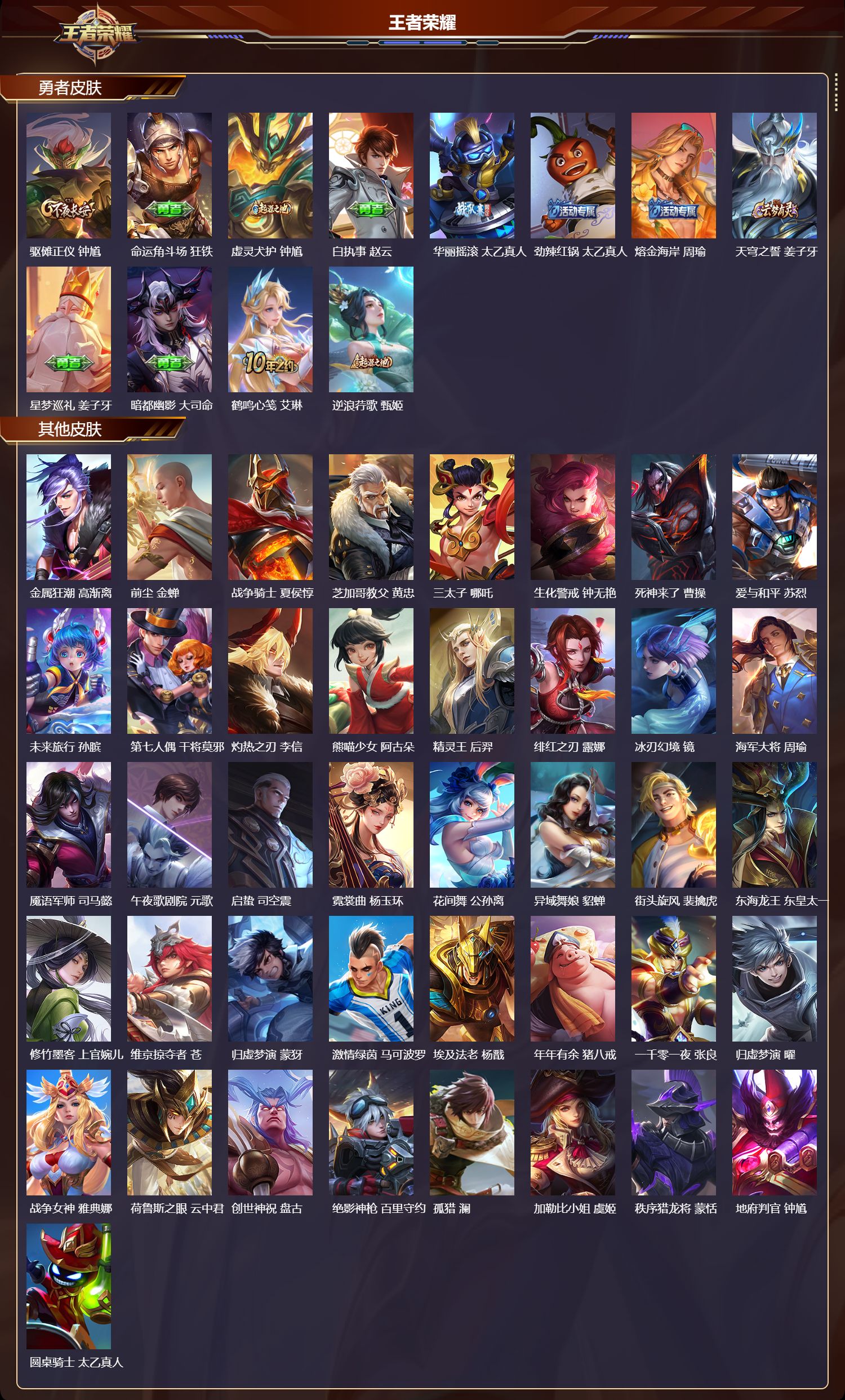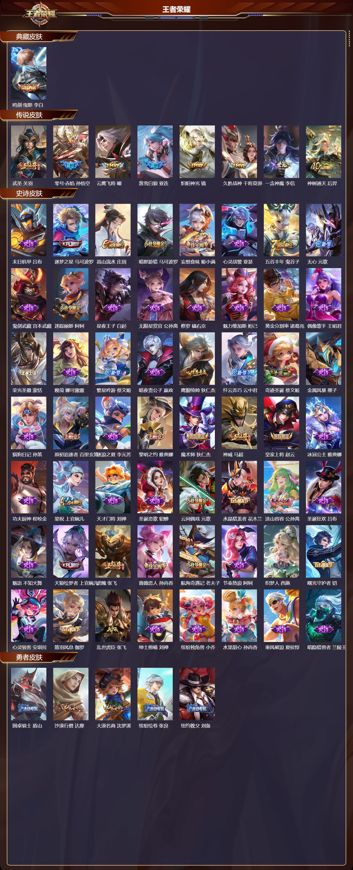 苹果qq/最强王者/193皮肤/126英雄/1典藏/0珍品无双/0无双/0珍品传说/8传说/56史诗/8稀有英雄【1 典藏皮肤】鸣剑·曳影 李白【8 传说皮肤】武圣 关羽零号·赤焰 孙悟空云鹰飞将 曜落雪白狼 亚连炽阳神光 镜久胜战神 干将莫邪一念神魔 李信神树通天 后羿【56 史诗皮肤】末日机甲 吕布逐梦之星 马可波罗高山流水 庄周暗影游猎 马可波罗妄想食味 姬小满心