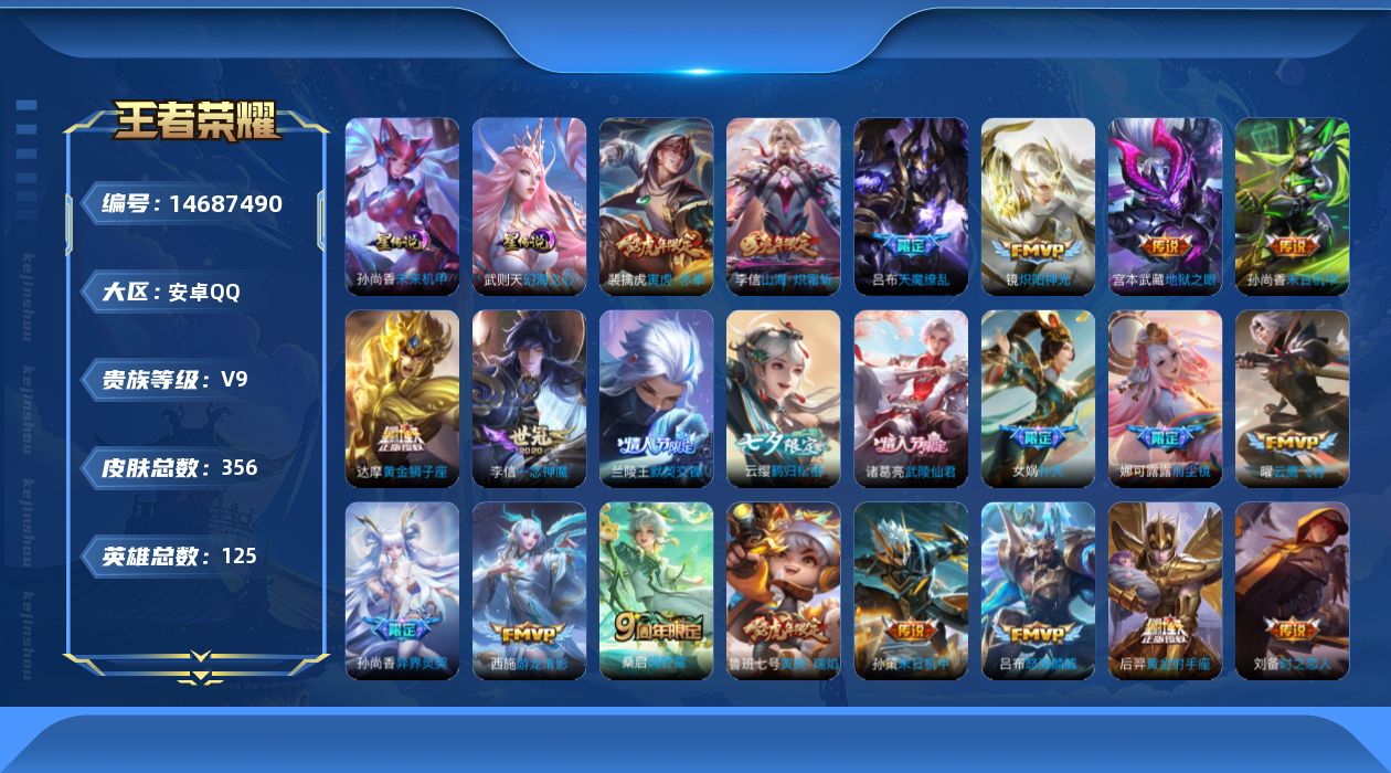 [14687490]v9-永恒钻石i段位-123英雄-356皮肤-37传说-126史诗cc8024 【荣耀典藏】:武则天英雄 【内测皮肤】:孙尚香蔷薇恋人,高渐离玩趣恶龙,狂铁特工战影 【传说皮肤】:狄仁杰超时空战士,武则天海洋之心,吕布天魔缭乱,宫本武藏地狱之眼,孙尚香末日机甲,诸葛亮武陵仙君,后羿黄金射手座,梦奇胖达荣荣,达摩黄金狮子座,虞姬云霓雀翎,张良黄金白羊座,貂蝉猫影幻舞,刘备时之恋人,李信一念神魔,曜云鹰飞将,孙悟空零号赤焰,虞姬启明星使,镜炽阳神光,铠绛天战甲,兰陵王默契交锋,西施游龙清影,王昭君乞巧织情,赵云淬星耀世,孙尚香异界灵契,鲁班七号寅虎瑞焰,裴擒虎寅虎赤拳,孙策末日机甲,女娲补天,孙策挚爱之约,大乔挚爱花嫁,娜可露露前尘镜,吕布怒海麟威,李信山海炽霜斩,项羽无限倾心,虞姬无限倾心,云缨鹤归松栖,桑启鸣野蒿 【限定皮肤】:白起狰,姜子牙天穹之誓,狄仁杰阴阳师,虞姬凯尔特女王,廉颇寅虎御盾,赵云皇家上将,墨子神迹守卫,嬴政白昼王子,孙尚香蔷薇恋人,孙尚香异界灵契,鲁班七号狮舞东方,鲁班七号寅虎瑞焰,庄周蜃楼王,庄周玄嵩,庄周高山流水,高渐离玩趣恶龙,钟无艳超时空战士,孙膑妖精王,孙膑寅虎展翼,扁鹊炼金王,扁鹊奇幻香踪,白起夜都怪侠,芈月重明,芈月白晶晶,芈月幻夜卜梦,吕布天魔缭乱,吕布猎兽之王,吕布御风骁将,周瑜赤莲之焰,元歌云间偶戏,元歌无心,夏侯惇朔风刀,甄姬女儿国国王,甄姬游园惊梦,甄姬落雪兰心,曹操烛龙,典韦穷奇,典韦蓝屏警告,马可波罗逐梦之星,马可波罗暗影游猎,狄仁杰魔术师,狄仁杰万华元夜,达摩星际陆战队,达摩沙漠行僧,项羽海滩派对,项羽霸王别姬,项羽无限倾心,老夫子醍醐杖,老夫子航海奇遇记,关羽冰锋战神,关羽百相守梦,程咬金演武夺筹,露娜一生所爱,王昭君午后时光,兰陵王默契交锋,兰陵王驯魔猎人,兰陵王金庭之子,花木兰默契交锋,娜可露露前尘镜,亚瑟潮玩骑士王,孙悟空大圣娶亲,孙悟空零号赤焰,孙悟空孙行者,牛魔御旌,牛魔奔雷神使,后羿辉光之辰,后羿圣弓游侠,张飞虎魄,李元芳银河之约,李元芳云中旅人,虞姬启明星使,虞姬无限倾心,钟馗神迹守卫,钟馗驱傩正仪,杨玉环遇见飞天,杨玉环寅虎心曲,杨戬潮玩骑兵,女娲朔望之晖,女娲补天,干将莫邪冰霜恋舞曲,干将莫邪真爱魔法,雅典娜单词大作战,雅典娜黎明之约,蔡文姬繁星吟游,太乙真人饕餮,东皇太一逐梦之光,鬼谷子原初探