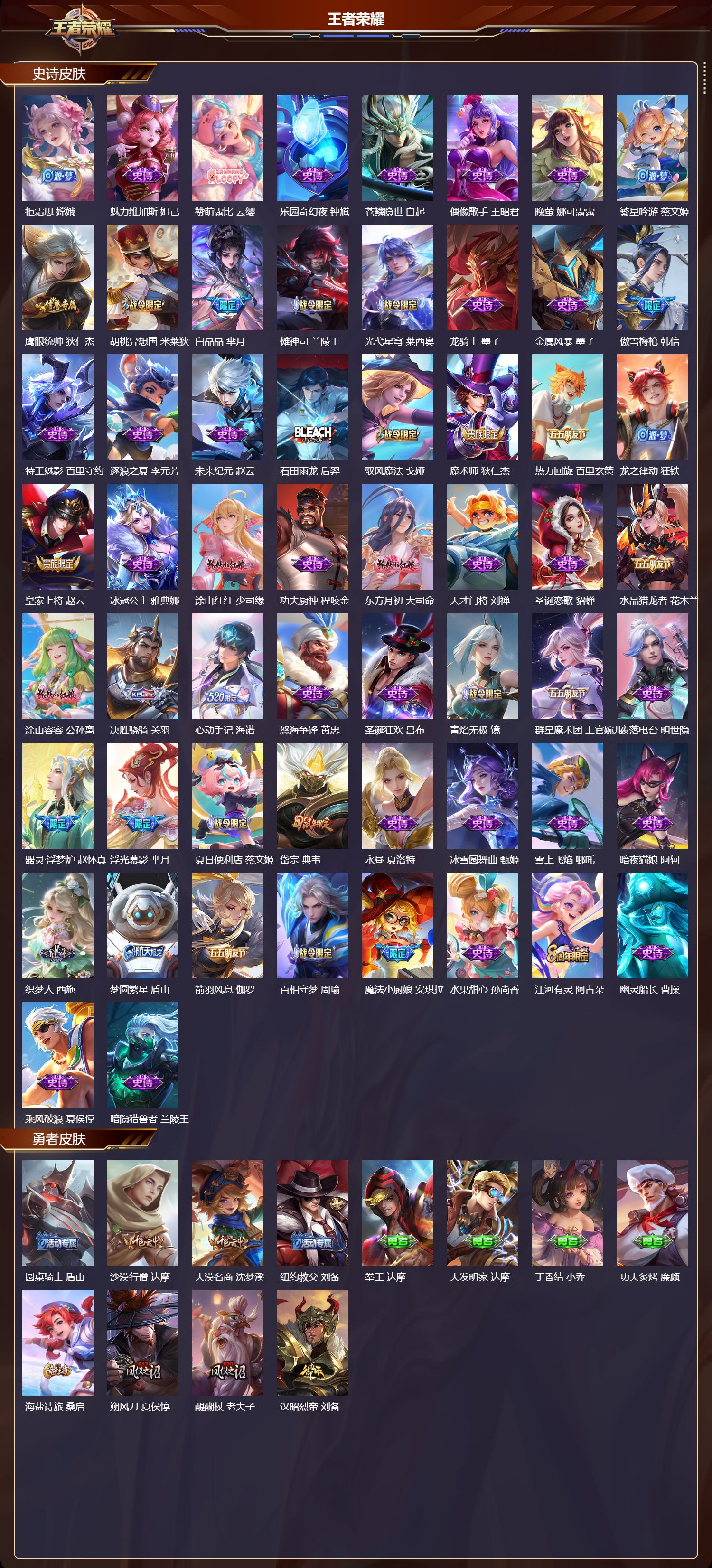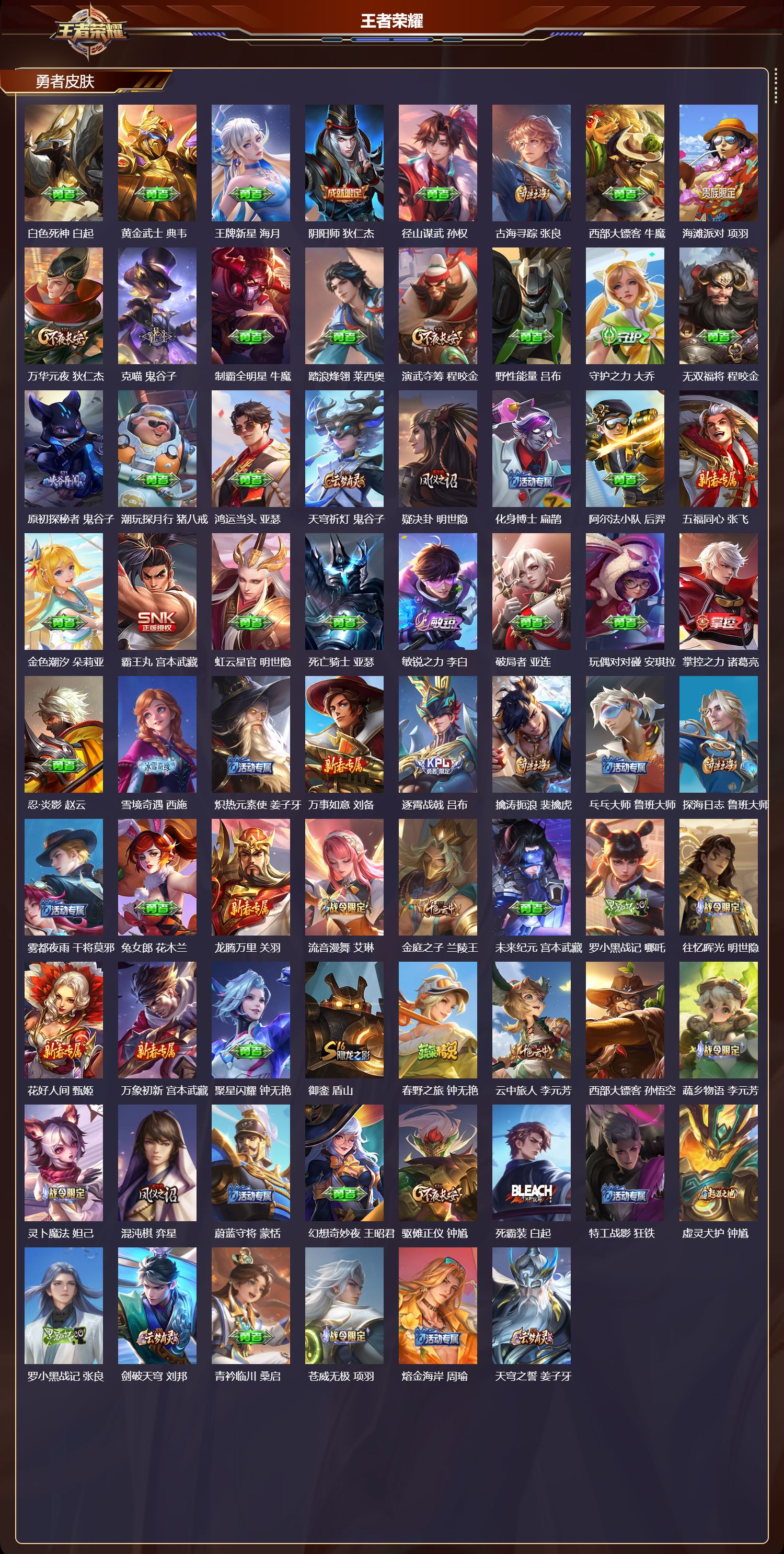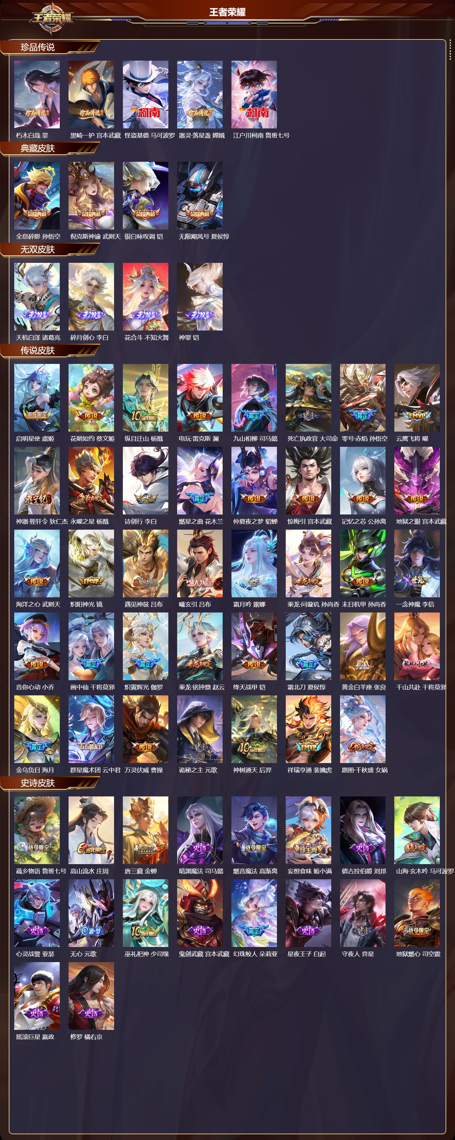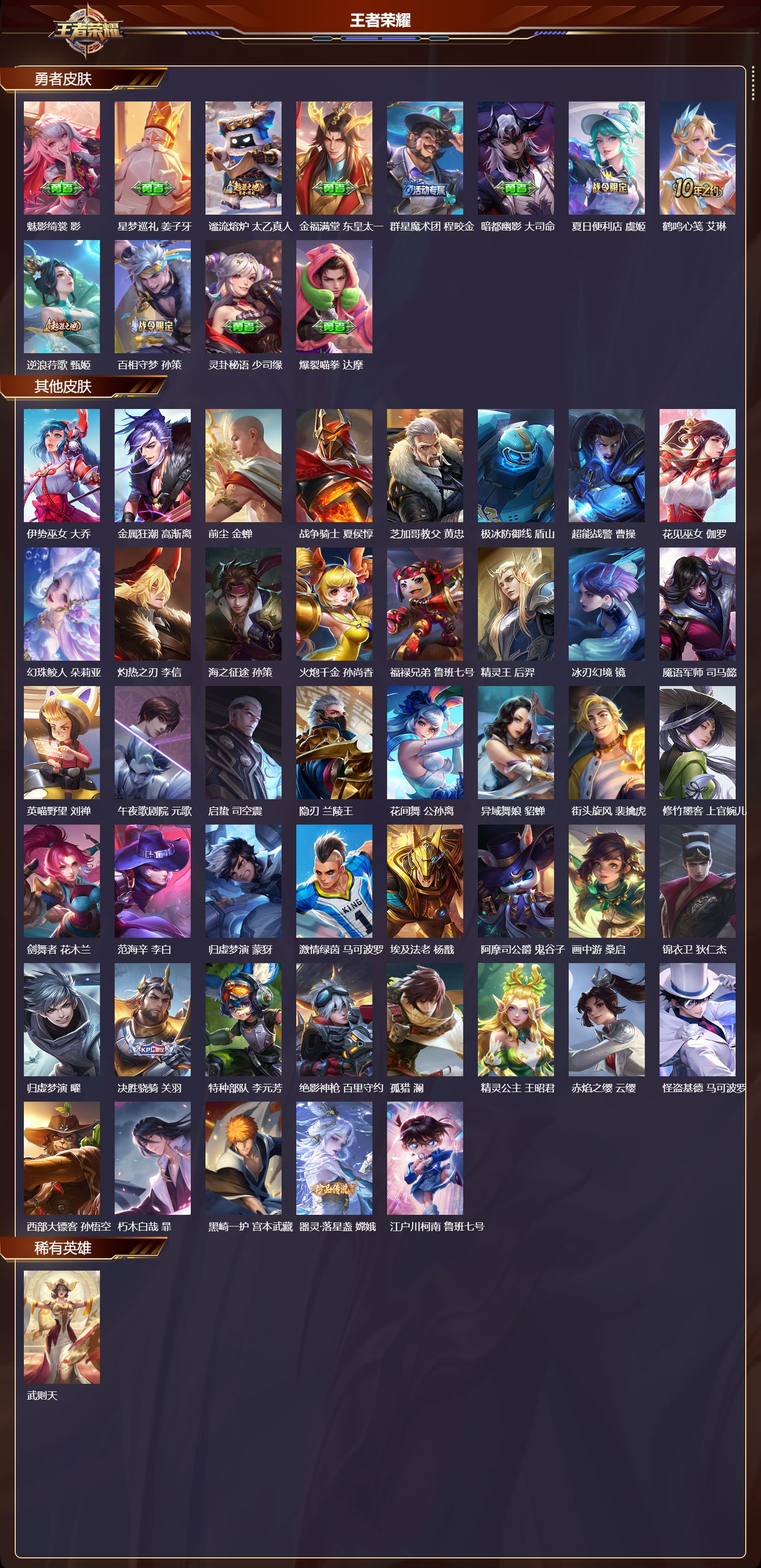 安卓qq/至尊星耀/260皮肤/128英雄/4典藏/0珍品无双/4无双/5珍品传说/39传说/76史诗/10稀有英雄【5 珍品传说】朽木白哉 暃黑崎一护 宫本武藏怪盗基德 马可波罗器灵·落星盏 嫦娥江户川柯南 鲁班七号【4 典藏皮肤】全息碎影 孙悟空倪克斯神谕 武则天银白咏叹调 铠无限飓风号 夏侯惇【4 无双皮肤】天机白泽 诸葛亮碎月剑心 李白花合斗 不知