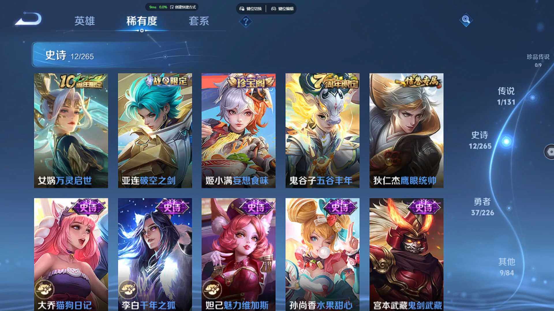 117英雄-59皮肤-安卓q-v0-至尊星耀v段位-117英雄-59皮肤-0典藏-0珍品无双-0无双-0珍品传说-1传说-12史诗 【传说皮肤】:达摩黄金狮子座 【限定皮肤】:姜子牙天穹之誓,狄仁杰阴阳师,达摩沙漠行僧,兰陵王金庭之子,李元芳云中旅人,鬼谷子五谷丰年,苏烈千军破阵,沈梦溪大漠名商,裴擒虎擒涛扼浪,鲁班大师探海日志,桑启海盐诗旅,鬼谷子天穹祈灯,姬小满妄想食味,刘邦剑破天穹,周瑜熔金海岸 【赛季限定】