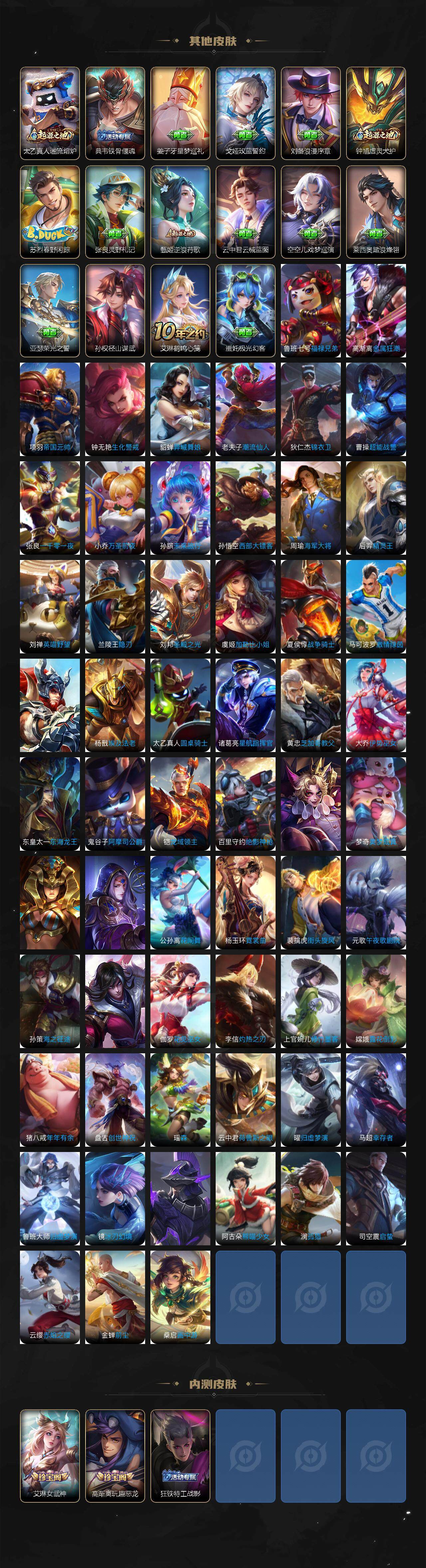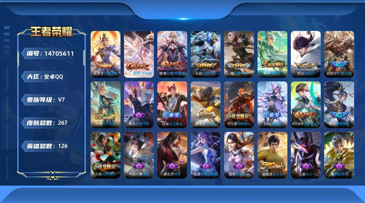 [14705611]安卓q-v7-最强王者段位-126英雄-267皮肤-1典藏皮肤-7传说-64史诗 【英雄全皮】:孙权全皮,蒙恬全皮,金蝉全皮,戈娅全皮,空空儿全皮 【荣耀典藏】:花木兰九霄神辉 【传说皮肤】:虞姬愿照岁时盈,桑启鸣野蒿,李信山海炽霜斩,李白诗剑行,马超无双飞将,孙悟空零号赤焰,曜云鹰飞将 【限定皮肤】:姜子牙天穹之誓,狄仁杰阴阳师,赵云皇家上将,庄周高山流水,高渐离死亡摇滚,高渐离玩趣恶龙,钟无艳超时空战士,元歌云间偶戏,元歌无心,甄姬落雪兰心,马可波罗山海玄木吟,狄仁杰魔术师,狄仁杰万华元夜,达摩沙漠行僧,项羽海滩派对,老夫子醍醐杖,程咬金演武夺筹,韩信傲雪梅呛,兰陵王金庭之子,亚瑟潮玩骑士王,孙悟空零号赤焰,孙悟空孙行者,李元芳匿光侦查者,李元芳云中旅人,钟馗驱傩正仪,干将莫邪真爱魔法,雅典娜单词大作战,雅典娜黎明之约,太乙真人华丽摇滚,鬼谷子原初探秘者,鬼谷子五谷丰年,苏烈千军破阵,弈星混沌棋,沈梦溪大漠名商,裴擒虎李小龙,裴擒虎擒涛扼浪,李信山海炽霜斩,上官婉儿梁祝,嫦娥暖冬兔眠,西施玲珑珍味,鲁班大师探海日志,桑启海盐诗旅,金蝉唐三藏,暃星界游侠,戈娅驭风魔法,艾琳女武神,艾琳流音漫舞,司空震地狱燃心,阿古朵江河有灵,张良古海寻踪,蒙恬荣光圣徽,鬼谷子天穹祈灯,沈梦溪龙舞盛年,刘邦剑破天穹,程咬金群星魔术团,刘备异域游侠,周瑜熔金海岸 【年限皮肤】:马可波罗山海玄木吟,李信山海炽霜斩 【赛季限定】:狄仁杰万华元夜,达摩沙漠行僧,老夫子醍醐杖,程咬金演武夺筹,兰陵王金庭之子,张良古海寻踪,李元芳云中旅人,钟馗驱傩正仪,雅典娜黎明之约,鬼谷子原初探秘者,苏烈千军破阵,弈星混沌棋,沈梦溪大漠名商,裴擒虎擒涛扼浪,鲁班大师探海日志,桑启海盐诗旅,鬼谷子天穹祈灯,蒙恬荣光圣徽,刘邦剑破天穹,姜子牙天穹之誓 【战令限定】:钟无艳超时空战士,元歌云间偶戏,甄姬落雪兰心,艾琳流音漫舞,亚瑟潮玩骑士王,干将莫邪真爱魔法,雅典娜单词大作战,嫦娥暖冬兔眠,西施玲珑珍味,司空震地狱燃心,暃星界游侠,戈娅驭风魔法 【史诗皮肤】:露娜紫霞仙子,赵云皇家上将,赵云未来纪元,甄姬冰雪圆舞曲,王昭君偶像歌手,狄仁杰魔术师,廉颇地狱岩魂,宫本武藏鬼剑武藏,孙尚香水果甜心,嬴政摇滚巨星,妲己女仆咖啡,墨子金属风暴,刘禅绅士熊喵,曹操幽灵船长,吕布末日机甲,张飞乱世虎臣,花木兰水晶猎龙者,夏侯