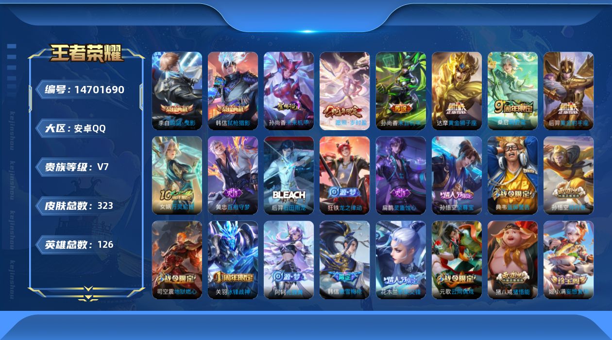 das7631 安卓q-v7-323皮肤2典藏6传说1星传说100史诗-可二次 未来机甲 【全皮英雄】 鬼谷子全皮 【典藏】 鸣剑曳影 弑呛猎影 【传说】 神树通天 愿照岁时盈 鸣野蒿 黄金狮子座 黄金射手座 末日机甲女 【热门】万灵启世 巫礼祀神 至尊宝 冰封战神 默契交锋女 傲
