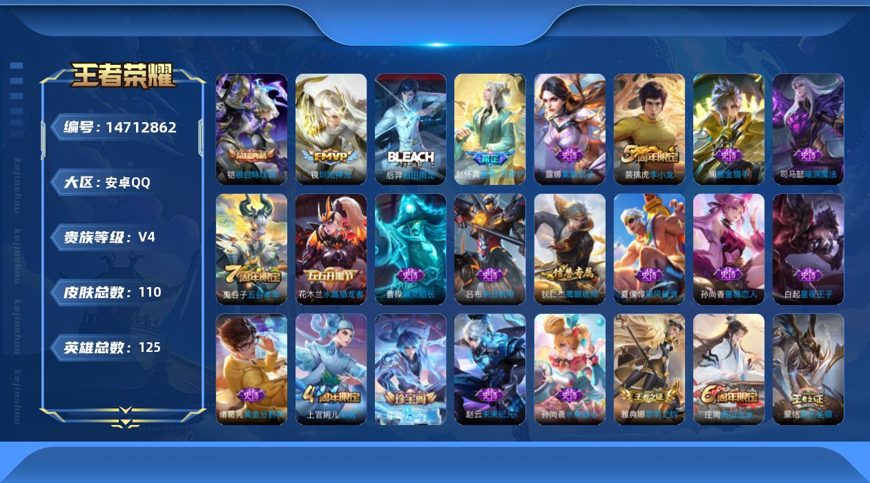[14712862]v4 1典藏 1传说 125英雄 110皮肤 可修改实名 【英雄全皮】:空空儿全皮 【稀有英雄】:大司命韩信韩跳跳夏洛特夏师傅艾琳橘右京橘子娜可露露鸟人不知火舞赵云金蝉唐僧戈娅 【荣耀水晶】:银白咏叹调倪克斯侍卫 【传说皮】:炽阳神光 【珍宝阁皮】:万物之道蔷薇恋人 【赛季/战令皮】:古海寻踪s33海盐诗旅s30擒涛扼浪s31探海日志s32天穹祈灯s34天穹之誓s36醍醐杖s20演武夺筹s23驱傩正仪s24千军破阵s25沙漠行僧s26金庭之子s27大漠名商s28云中旅人s29 【史诗皮】:器灵·浮梦炉石田雨龙紫霞仙子黄金分割率蒙恬荣光圣徽末日机甲-吕布乱世虎臣摇滚巨星水果甜心星夜王子幽灵船长暗渊魔法地狱岩魂缤纷独角兽乘风破浪逐浪之夏水晶猎龙者金属风暴鹰眼统帅魅力维加斯黎明之约赏金猎手未来纪元-赵云 【限定皮】:高山流水五谷丰年梁祝李小龙 【普通皮】:谧流熔炉功夫炙烤街头霸王鹤鸣心笺戏梦巡演逆浪荇歌死霸装虚灵犬护妄想特派尼罗河女神完美运算鬼谷子天穹祈灯s34蔚蓝守将五福同心花好人间归虚梦演-曜归虚梦演-西施海滩派对沉稳之力守护之力坚韧之力纽约教父特工战影乓乓大师万象初新黄金武士次元突破天使之翼哥特玫瑰红桃皇后西部大镖客牛魔阴阳师兔女郎死亡骑士忍·炎影秘密基地救世之瞳白色死神野性能量未来纪元-宫本武藏拳王虹云星官孤猎幸存者剑舞者冰刃幻境踏雪寻梅三太子金属狂潮福禄兄弟东海龙王激情绿茵精灵王赤焰之缨启蛰森午夜歌剧院街头旋风花间舞绝影神呛帝国元帅超能战警前尘碧珀绯影画中游幻泉雾影-海月