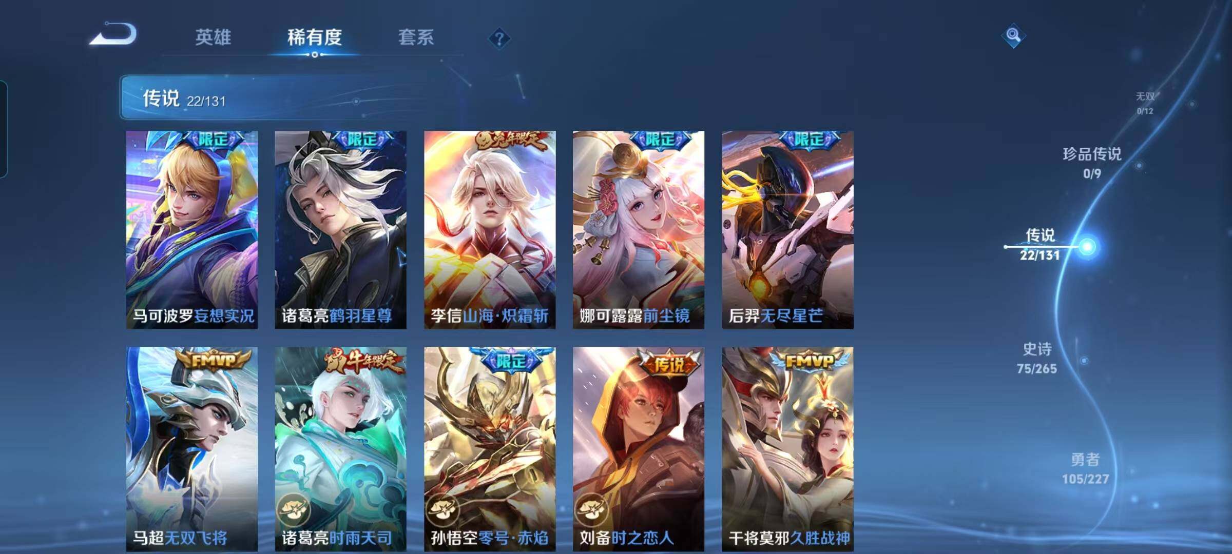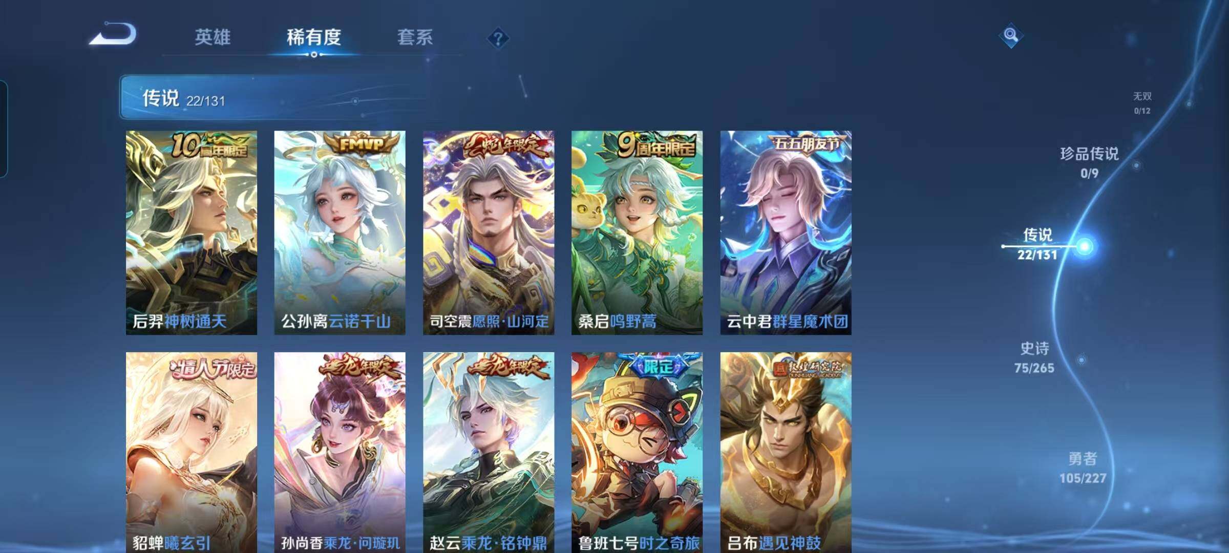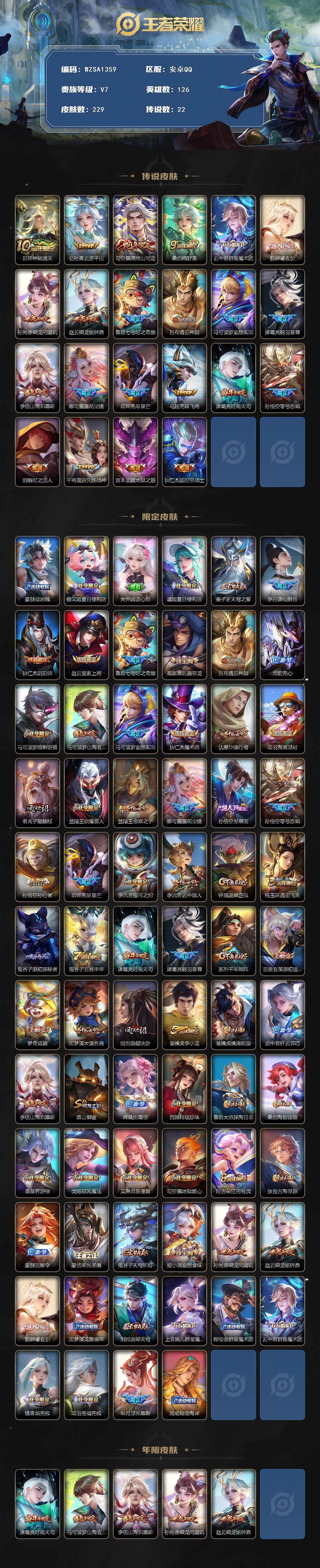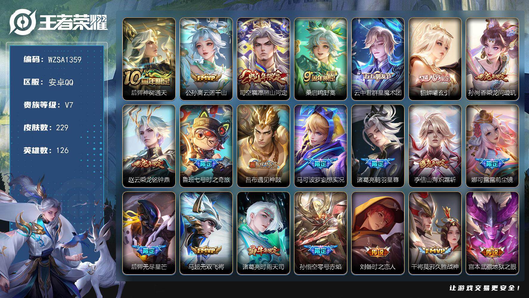 【wzsa1359】贵族7/皮肤229/传说22/史诗75/英雄126/司空震全皮/后羿神树通天/云诺千山/司空震-愿照·山河定/桑启-鸣野蒿/云中君-群星魔术团/貂蝉-曦玄引/孙尚香-乘龙·问璇玑/赵云-乘龙·铭钟鼎/鲁班七号-时之奇旅/吕布-遇见神鼓/马可波罗-妄想实况/诸葛亮-鹤羽星尊/李信-山海·炽霜斩/娜可露露-前尘镜/后羿-无尽星芒/马超-无双飞将/诸葛亮-时雨天司/孙悟空-零号·