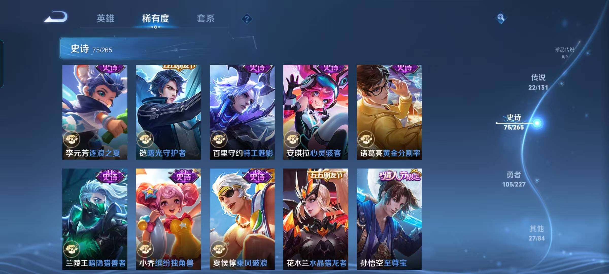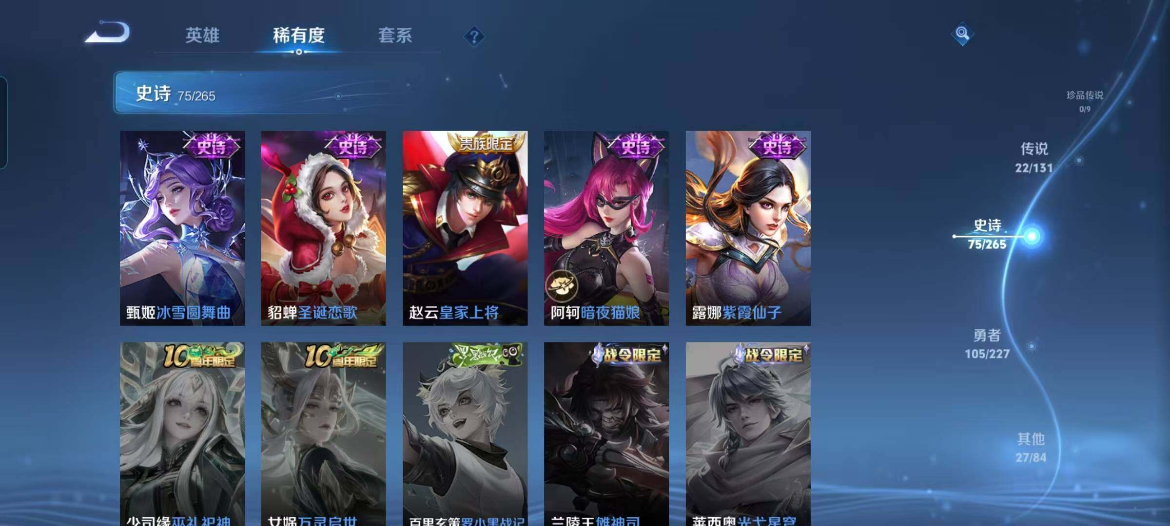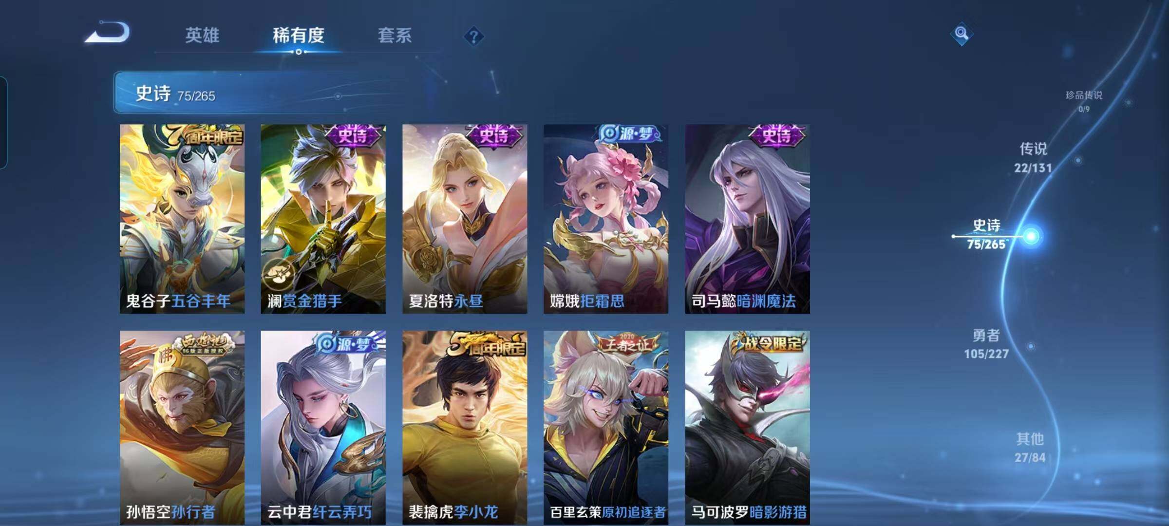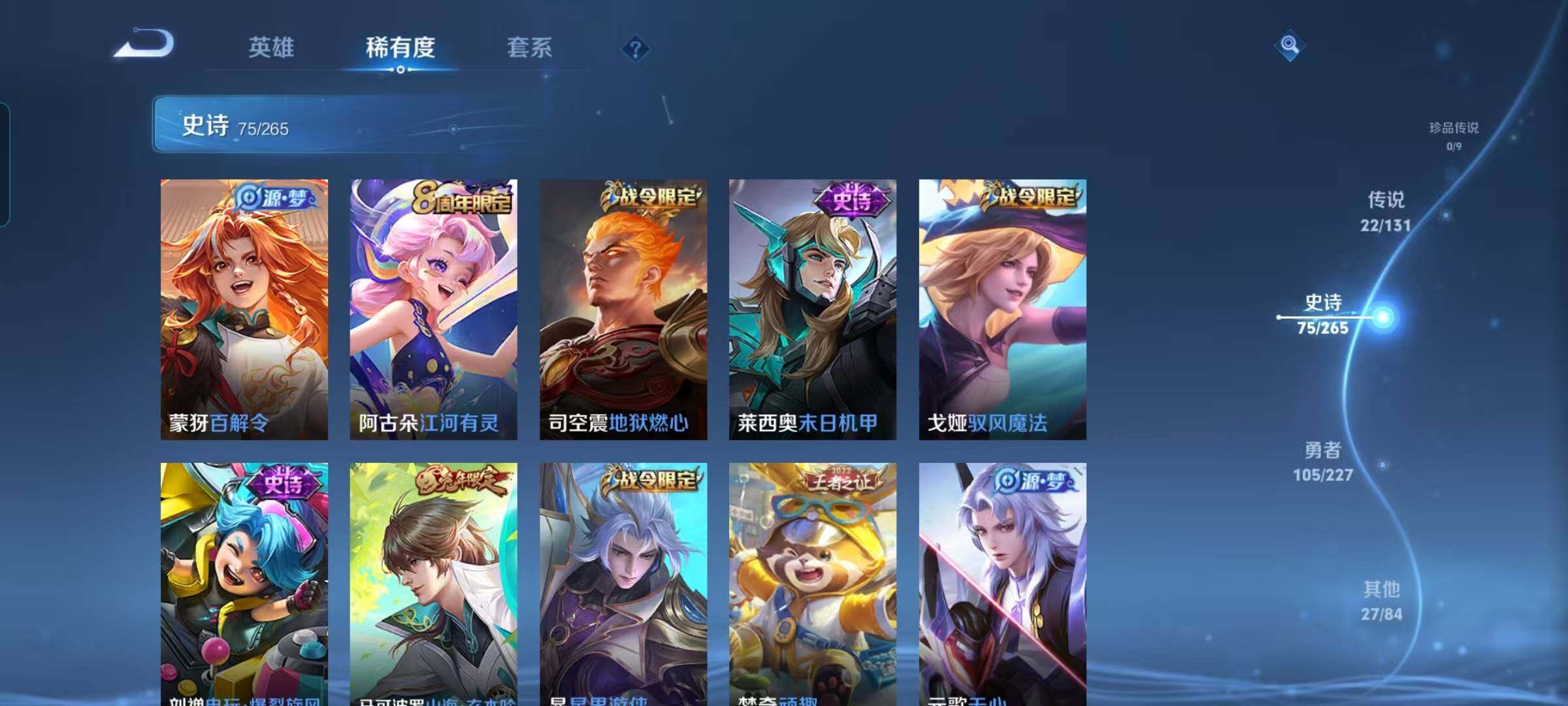 【wzsa1359】贵族7/皮肤229/传说22/史诗75/英雄126/司空震全皮/后羿神树通天/云诺千山/司空震-愿照·山河定/桑启-鸣野蒿/云中君-群星魔术团/貂蝉-曦玄引/孙尚香-乘龙·问璇玑/赵云-乘龙·铭钟鼎/鲁班七号-时之奇旅/吕布-遇见神鼓/马可波罗-妄想实况/诸葛亮-鹤羽星尊/李信-山海·炽霜斩/娜可露露-前尘镜/后羿-无尽星芒/马超-无双飞将/诸葛亮-时雨天司/孙悟空-零号·