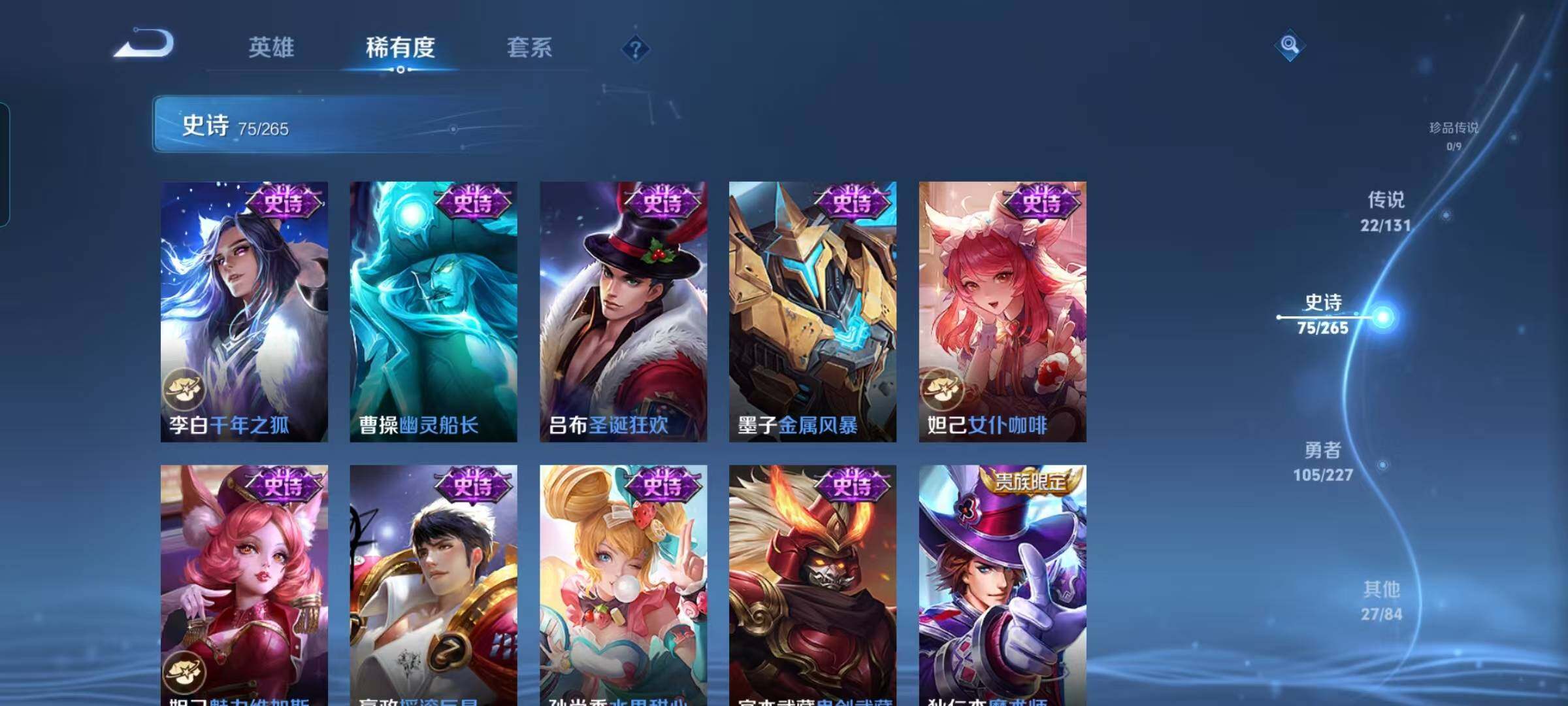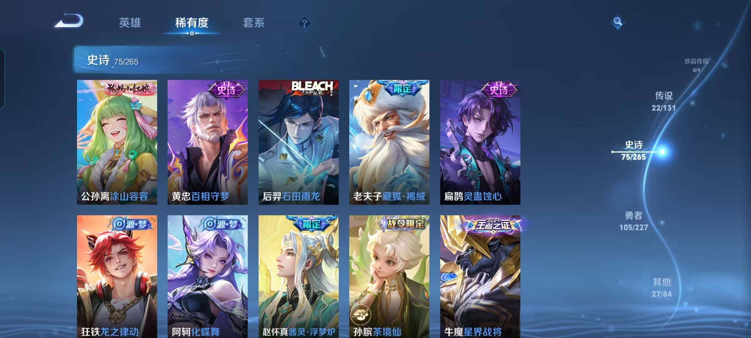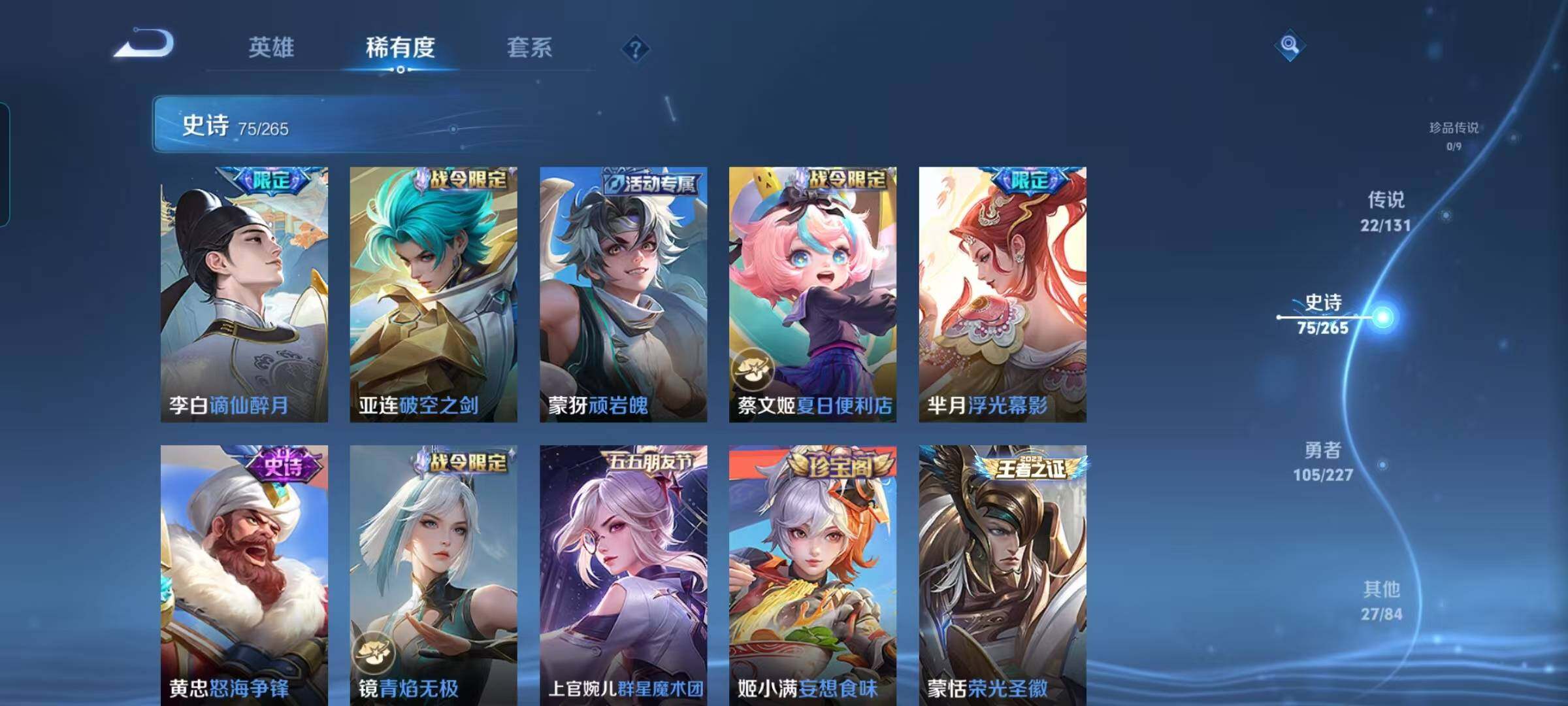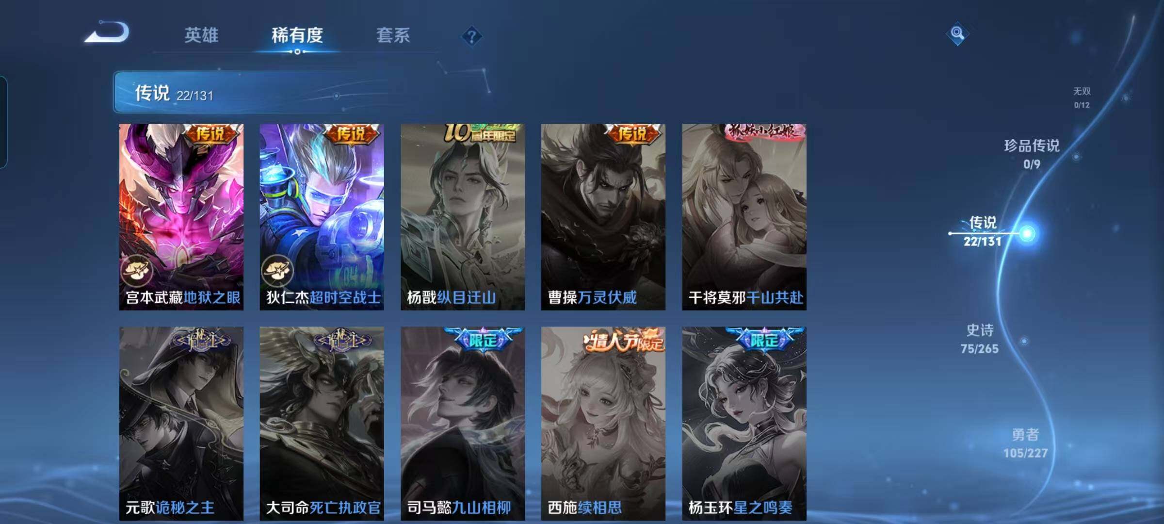 【wzsa1359】贵族7/皮肤229/传说22/史诗75/英雄126/司空震全皮/后羿神树通天/云诺千山/司空震-愿照·山河定/桑启-鸣野蒿/云中君-群星魔术团/貂蝉-曦玄引/孙尚香-乘龙·问璇玑/赵云-乘龙·铭钟鼎/鲁班七号-时之奇旅/吕布-遇见神鼓/马可波罗-妄想实况/诸葛亮-鹤羽星尊/李信-山海·炽霜斩/娜可露露-前尘镜/后羿-无尽星芒/马超-无双飞将/诸葛亮-时雨天司/孙悟空-零号·