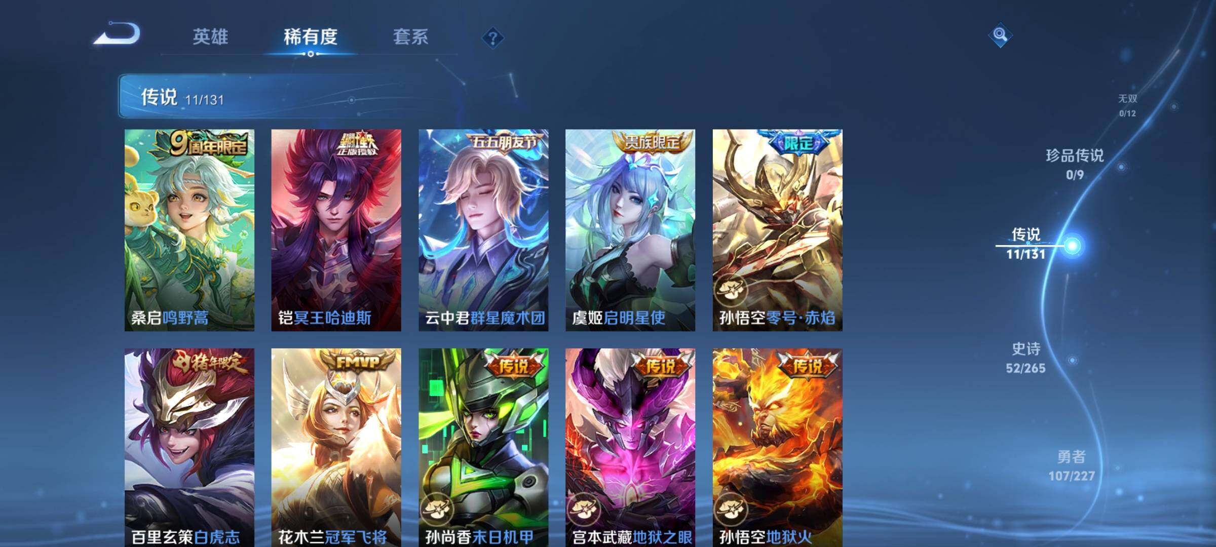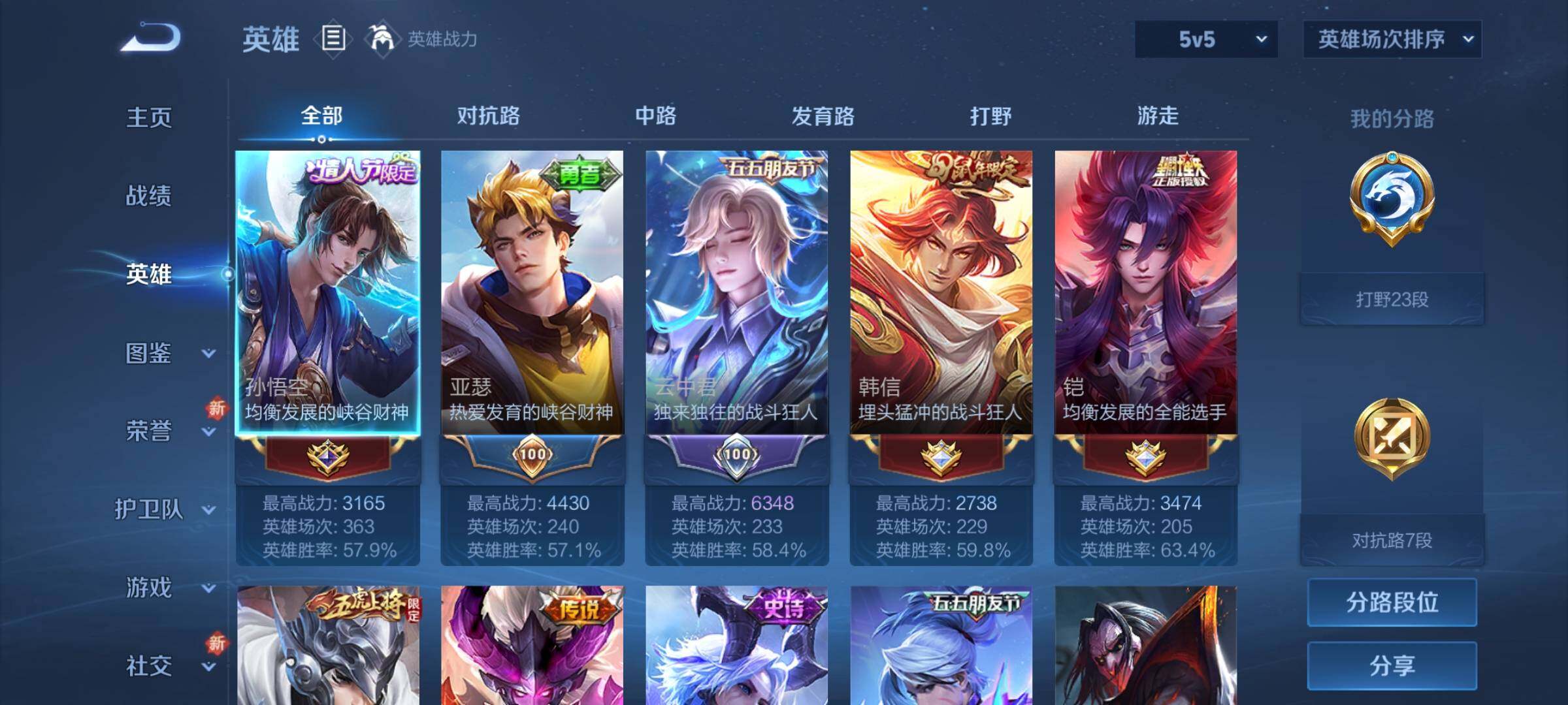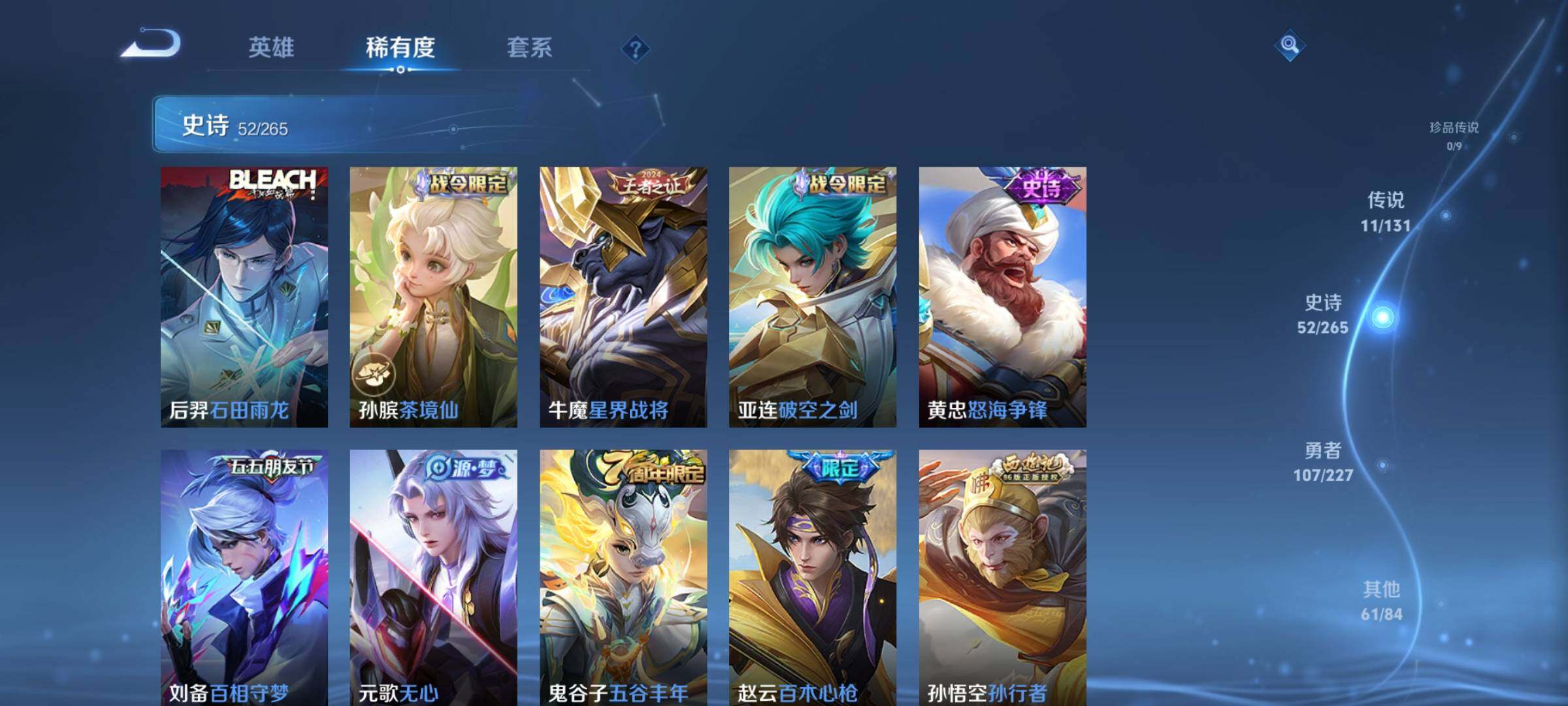 _2313924-wx-v8-最强王者段位-有限制打野23段对抗路7段124英雄-233皮肤-1典藏皮肤-11传说-53史诗 【荣耀典藏】:铠银白咏叹调 【传说皮肤】:桑启鸣野蒿,铠冥王哈迪斯,云中君群星魔术团,虞姬启明星使,孙悟空零号赤焰,百里玄策白虎志,花木兰冠军飞将,孙尚香末日机甲,宫本武藏地狱之眼,孙悟空地狱火,狄仁杰超时空战士 【限定皮肤】:铠冥王哈迪斯,大乔绒语心约,姜子牙天穹之誓,狄仁杰阴阳师,赵云皇家上将,赵云龙胆,赵云百木心呛,墨子神迹守卫,鲁班七号狮舞东方,高渐离玩趣恶龙,阿轲迷踪丽影,周瑜赤莲之焰,元歌云间偶戏,元歌无心,夏侯惇朔风刀,典韦蓝屏警告,马可波罗暗影游猎,狄仁杰魔术师,狄仁杰万华元夜,达摩沙漠行僧,项羽海滩派对,老夫子醍醐杖,程咬金演武夺筹,刘邦夺宝奇兵,韩信逐梦之影,韩信飞衡,兰陵王驯魔猎人,兰陵王金庭之子,亚瑟潮玩骑士王,孙悟空至尊宝,孙悟空零号赤焰,孙悟空孙行者,牛魔御旌,后羿圣弓游侠,刘备百相守梦,李元芳银河之约,李元芳云中旅人,虞姬启明星使,钟馗神迹守卫,钟馗驱傩正仪,女娲朔望之晖,雅典娜单词大作战,鬼谷子原初探秘者,鬼谷子五谷丰年,苏烈千军破阵,百里玄策白虎志,弈星混沌棋,沈梦溪星空之诺,沈梦溪大漠名商,明世隐疑决卦,裴擒虎天狼狩猎者,裴擒虎李小龙,裴擒虎擒涛扼浪,云中君纤云弄巧,盾山御銮,猪八戒西部大镖客,蒙犽狂想玩偶喵,鲁班大师探海日志,桑启海盐诗旅,张良古海寻踪,鬼谷子天穹祈灯,刘邦剑破天穹,云中君群星魔术团,刘备异域游侠,周瑜熔金海岸 【年限皮肤】:百里玄策白虎志,韩信飞衡,赵云龙胆 【赛季限定】:夏侯惇朔风刀,狄仁杰万华元夜,达摩沙漠行僧,老夫子醍醐杖,程咬金演武夺筹,兰陵王金庭之子,张良古海寻踪,牛魔御旌,李元芳云中旅人,钟馗驱傩正仪,鬼谷子原初探秘者,苏烈千军破阵,弈星混沌棋,沈梦溪大漠名商,明世隐疑决卦,裴擒虎擒涛扼浪,盾山御銮,鲁班大师探海日志,桑启海盐诗旅,鬼谷子天穹祈灯,刘邦剑破天穹,姜子牙天穹之誓 【战令限定】:墨子神迹守卫,鲁班七号狮舞东方,阿轲迷踪丽影,周瑜赤莲之焰,元歌云间偶戏,典韦蓝屏警告,马可波罗暗影游猎,刘邦夺宝奇兵,兰陵王驯魔猎人,亚瑟潮玩骑士王,后羿圣弓游侠,李元芳银河之约,钟馗神迹守卫,女娲朔望之晖,雅典娜单词大作战,沈梦溪星空之诺,猪八戒西部大镖客,蒙犽狂想玩偶喵 【史诗皮肤】:赵云皇家
