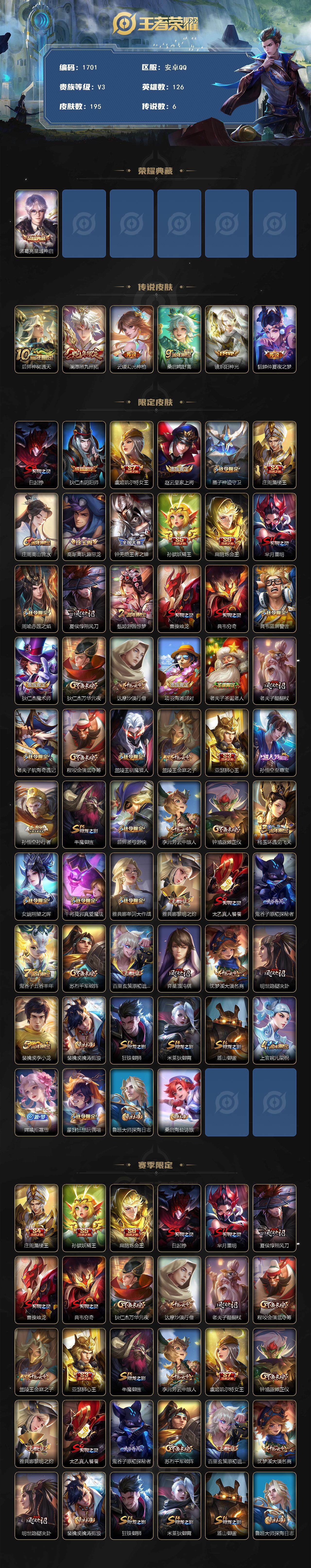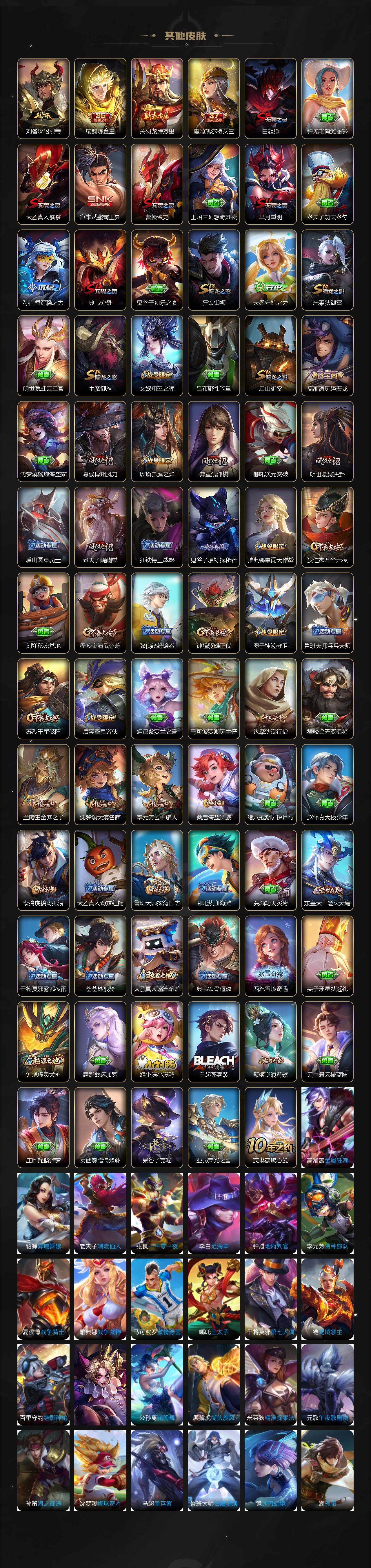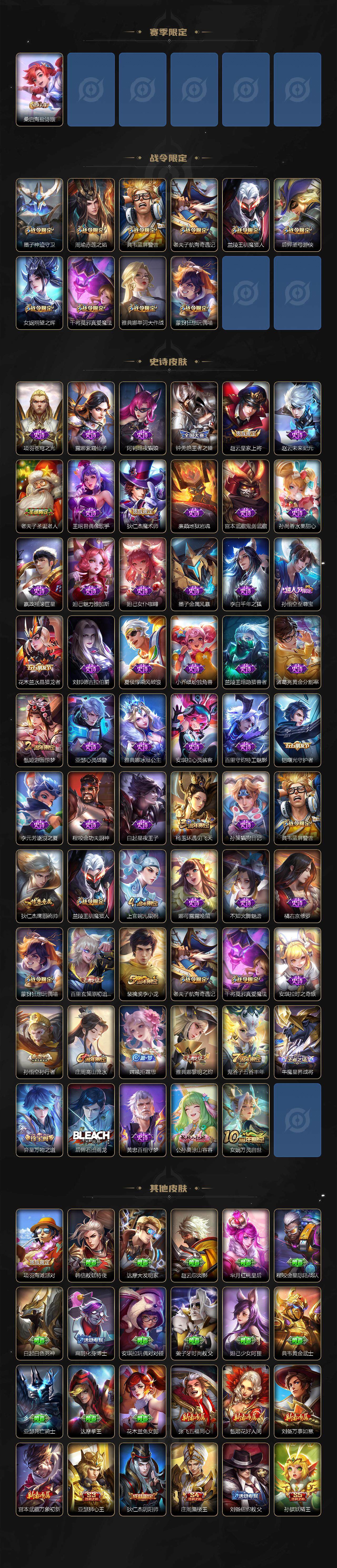 126英雄-195皮肤-贵族3/皮肤195/典藏1/传说6/史诗59/英雄126/星域神启 诸葛亮/神树通天 后羿/愿照·九州拓 澜/幻光神呛 云缨/鸣野蒿 桑启/炽阳神光 镜/仲夏夜之梦 貂蝉/狰 白起/阴阳师 狄仁杰/凯尔特女王 虞姬/皇家上将 赵云/神迹守卫 墨子/蜃楼王 庄周/高山流水 庄周/玩趣恶龙 高渐离/王者之锤 钟无艳/妖精王 孙膑/炼金王 扁鹊/重明 芈月/赤莲之焰 周瑜/朔风刀 夏侯惇/游园惊梦