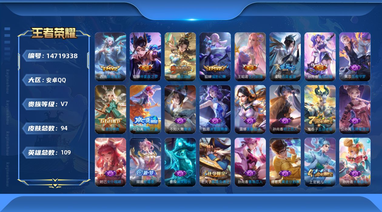 [14719338]v7 7传说 109英雄 94皮肤 可修改实名 女号 【稀有英雄】:大司命韩信韩跳跳夏洛特夏师傅艾琳橘右京橘子娜可露露鸟人不知火舞金蝉唐僧戈娅 【传说皮】:遇见胡旋游龙清影小青龙仲夏夜之梦大飞蛾云霓雀翎猫影幻舞乞巧织情音你闪耀rap皮 【珍宝阁皮】:蔷薇恋人 【赛季/战令皮】:海盐诗旅s30擒涛扼浪s31探海日志s32天穹祈灯s34演武夺筹s23驱傩正仪s24神迹守卫-墨子航海奇遇记大漠名商s28云中旅人s29 【史诗皮】:百相守梦-黄忠遇见神鹿紫霞仙子黄金分割率偶像歌手无限星赏官魅语白蛇时之恋人-孙尚香女仆咖啡水果甜心幽灵船长鬼剑武藏拒霜思逐浪之夏圣诞恋歌魅力维加斯 【限定皮】:五谷丰年梁祝天狼溯光者蜜橘之夏 【普通皮】:熔金海岸谧流熔炉神迹守卫大乔绒语心约克喵踏浪烽翎逆浪荇歌零食大作战鬼谷子天穹祈灯s34花好人间归虚梦演-西施海滩丽影海滩派对皇家上将魔术师沉稳之力守护之力缤纷绘卷乓乓大师哥特玫瑰鲨炮海盗猫阴阳师兔女郎死亡骑士少女阿狸紫罗兰之誓救世之瞳冰雪圆舞曲拳王玩偶对对碰阿尔法小队虹云星官露花倒影修竹墨客灼热之刃幸存者冰刃幻境伊势巫女花见巫女踏雪寻梅龙域领主生化警戒蔷薇王座异域舞娘激情绿茵精灵王赤焰之缨美梦成真森霓裳曲花间舞占星师绯红之刃西部大镖客-孙悟空海军大将精灵公主画中游