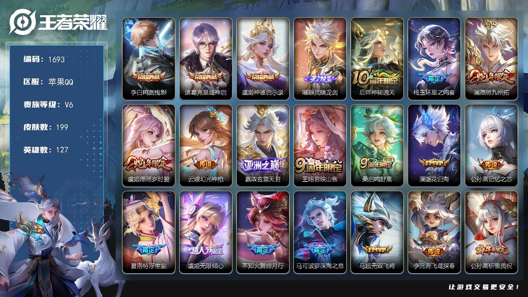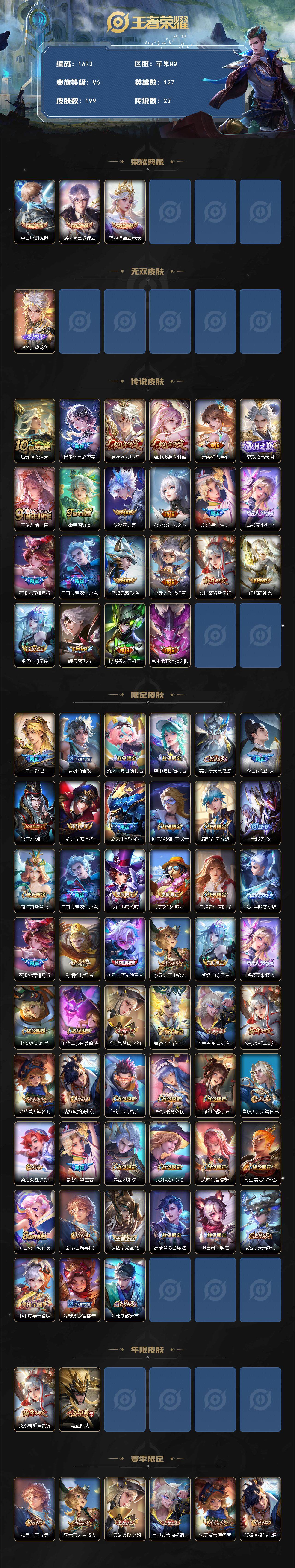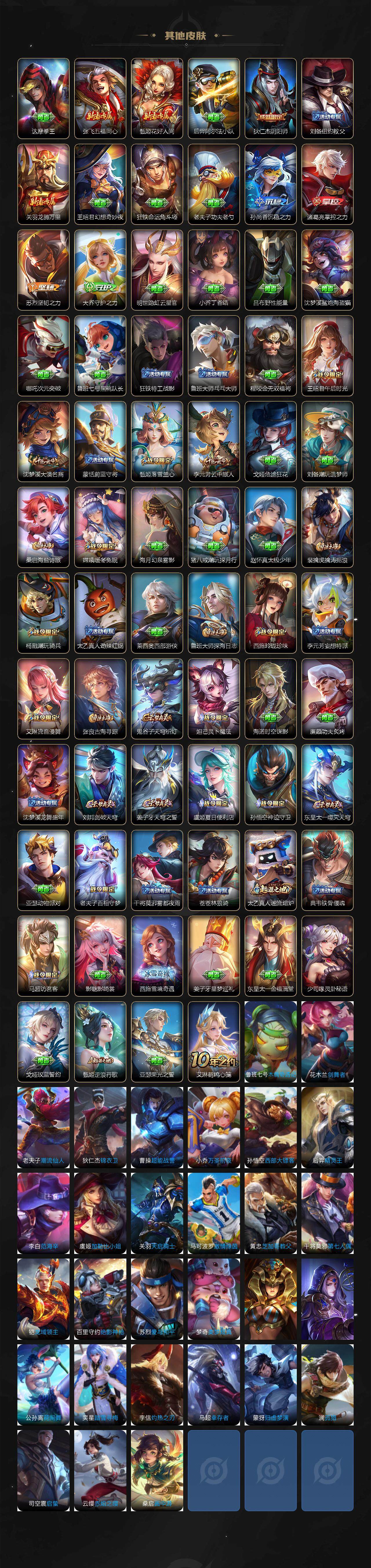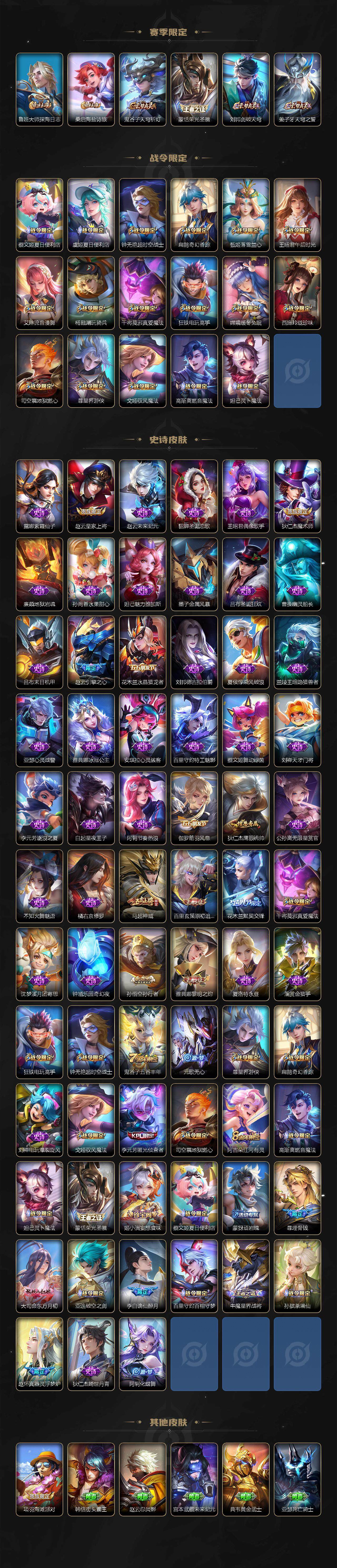 127英雄-199皮肤-贵族6/皮肤199/典藏3/传说22/史诗68/英雄127/夏洛特全皮/戈娅全皮/影全皮/鸣剑·曳影 李白/星域神启 诸葛亮/神鉴启示录 虞姬/器灵·螭龙剑 曜/神树通天 后羿/星之鸣奏 杨玉环/愿照·九州拓 澜/愿照·岁时盈 虞姬/幻光神呛 云缨/玄雷天君 嬴政/映山客 王昭君/鸣野蒿 桑启/逐花归海 澜/记忆之芯 公孙离/浮生妄 夏洛特/无限倾心 虞姬/绯月行 不知火舞/深海之息 马可波罗