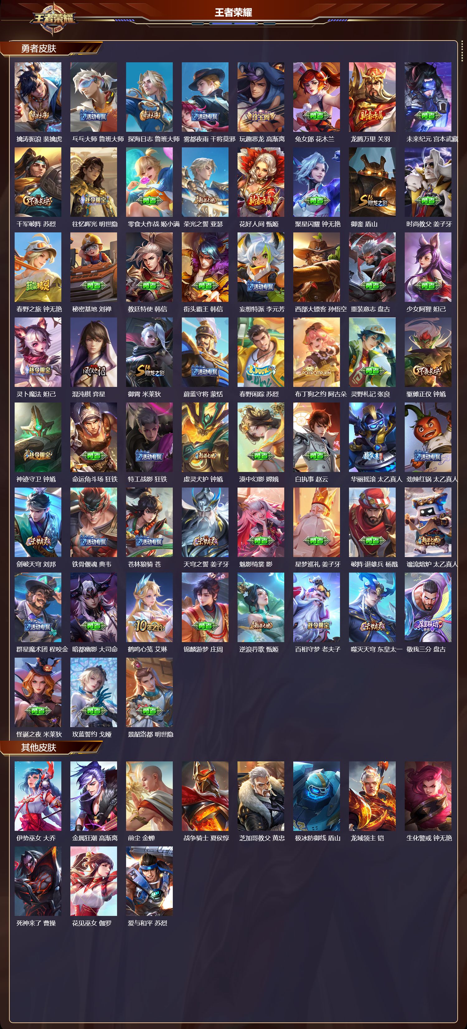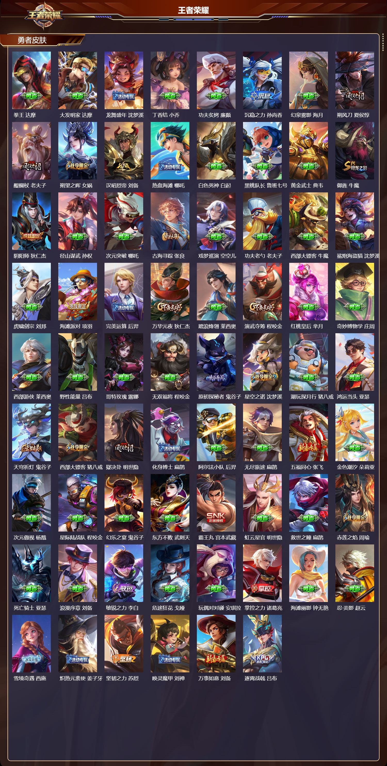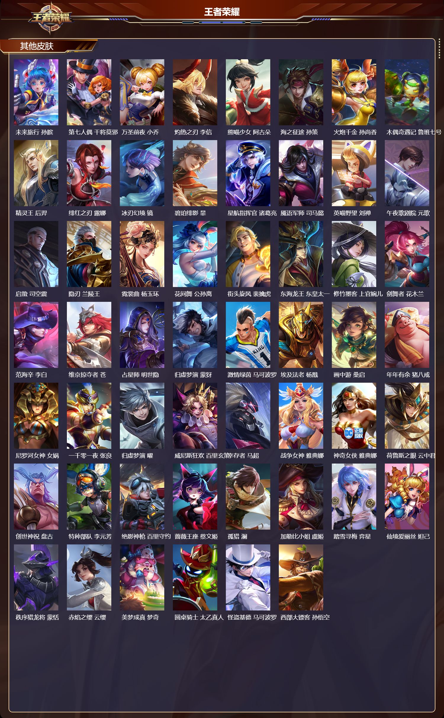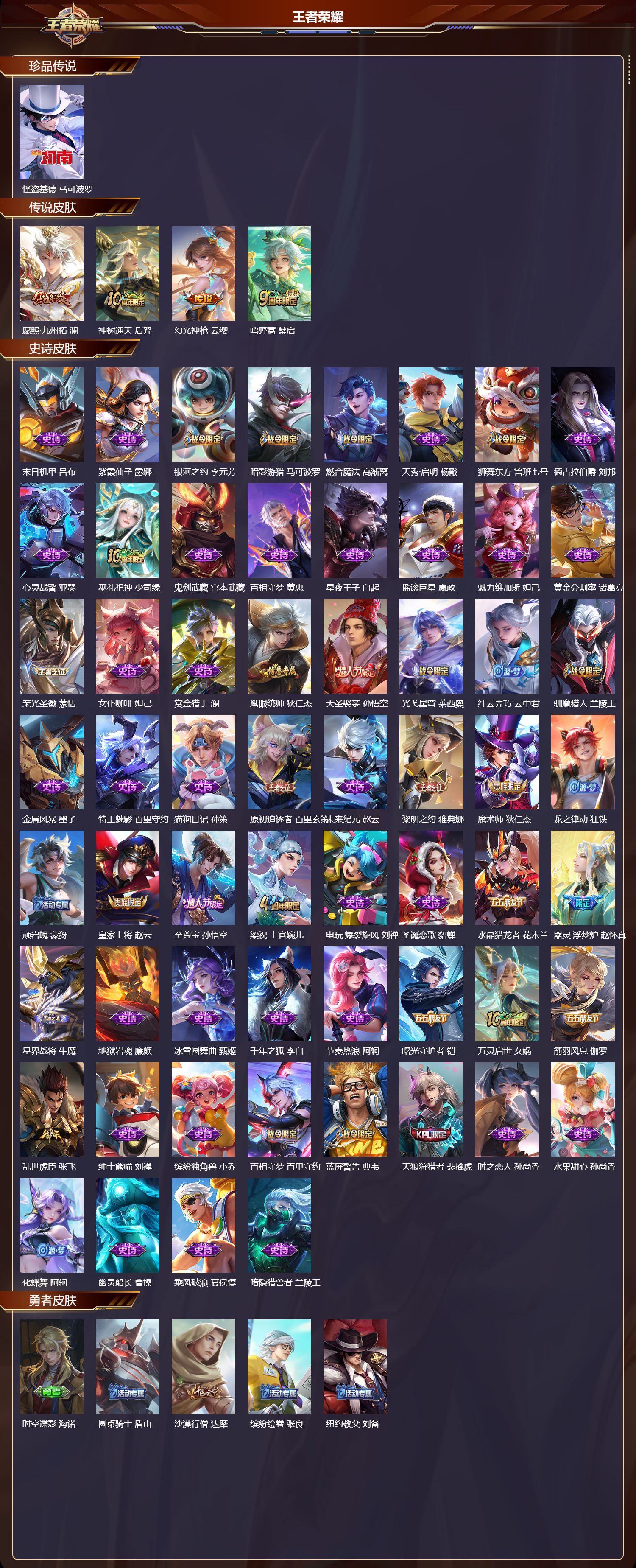 安卓qq/荣耀王者/265皮肤/127英雄/0典藏/0珍品无双/0无双/1珍品传说/4传说/60史诗/9稀有英雄【1 珍品传说】怪盗基德 马可波罗【4 传说皮肤】愿照·九州拓 澜神树通天 后羿幻光神呛 云缨鸣野蒿 桑启【60 史诗皮肤】末日机甲 吕布紫霞仙子 露娜银河之约 李元芳暗影游猎 马可波罗燃音魔法 高渐离天秀·启明 杨戬狮舞东方 鲁班七号德古拉伯爵 刘邦心灵战警
