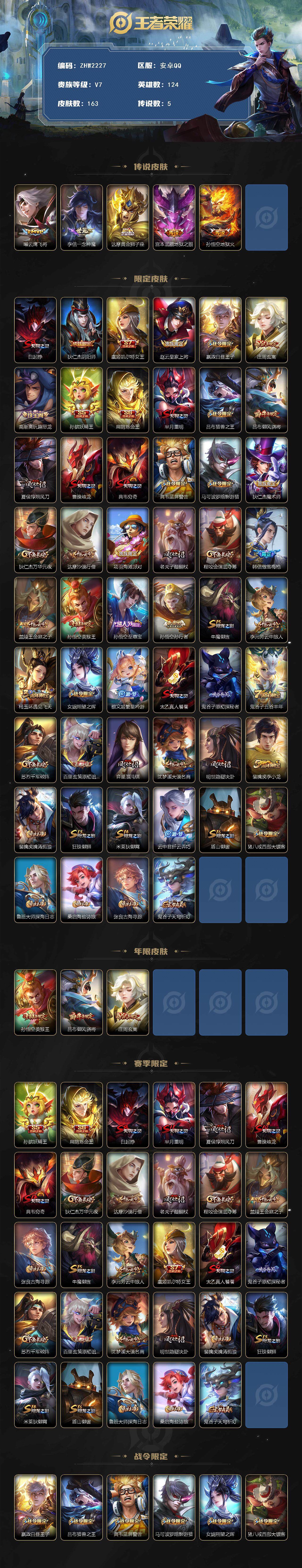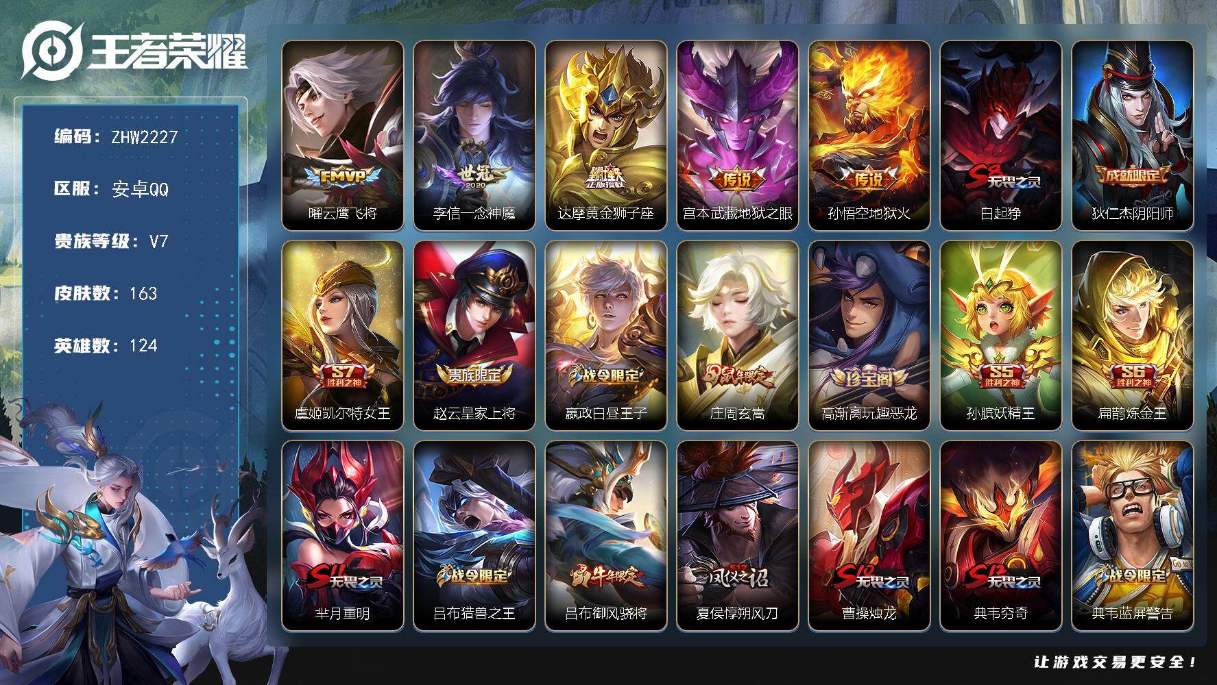 【店主推荐捡漏号!可直接换绑】安卓q-v7-永恒钻石iv段位-124英雄-163皮肤-5传说-40史诗 【传说皮肤】:曜云鹰飞将,李信一念神魔,达摩黄金狮子座,宫本武藏地狱之眼,孙悟空地狱火 【限定皮肤】:白起狰,狄仁杰阴阳师,虞姬凯尔特女王,赵云皇家上将,嬴政白昼王子,庄周玄嵩,高渐离玩趣恶龙,孙膑妖精王,扁鹊炼金王,芈月重明,吕布猎兽之王,吕布御风骁将,夏侯惇朔风刀,曹操烛龙,典韦穷奇,典韦蓝屏警告,马可波罗暗影游猎,狄仁杰魔术师,狄仁杰万华元夜,达摩沙漠行僧,项羽海滩派对,老夫子醍醐杖,程咬金演武夺筹,韩信傲雪梅呛,兰陵王金庭之子,孙悟空美猴王,孙悟空至尊宝,孙悟空孙行者,牛魔御旌,李元芳云中旅人,杨玉环遇见飞天,女娲朔望之晖,蔡文姬繁星吟游,太乙真人饕餮,鬼谷子原初探秘者,鬼谷子五谷丰年,苏烈千军破阵,百里玄策原初追逐者,弈星混沌棋,沈梦溪大漠名商,明世隐疑决卦,裴擒虎李小龙,裴擒虎擒涛扼浪,狂铁御狮,米莱狄御霄,云中君纤云弄巧,盾山御銮,猪八戒西部大镖客,鲁班大师探海日志,桑启海盐诗旅,张良古海寻踪,鬼谷子天穹祈灯 【年限皮肤】:孙悟空美猴王,吕布御风骁将,庄周玄嵩 【赛季限定】:孙膑妖精王,扁鹊炼金王,白起狰,芈月重明,夏侯惇朔风刀,曹操烛龙,典韦穷奇,狄仁杰万华元夜,达摩沙漠行僧,老夫子醍醐杖,程咬金演武夺筹,兰陵王金庭之子,张良古海寻踪,牛魔御旌,李元芳云中旅人,虞姬凯尔特女王,太乙真人饕餮,鬼谷子原初探秘者,苏烈千军破阵,百里玄策原初追逐者,弈星混沌棋,沈梦溪大漠名商,明世隐疑决卦,裴擒虎擒涛扼浪,狂铁御狮,米莱狄御霄,盾山御銮,鲁班大师探海日志,桑启海盐诗旅,鬼谷子天穹祈灯 【战令限定】:嬴政白昼王子,吕布猎兽之王,典韦蓝屏警告,马可波罗暗影游猎,女娲朔望之晖,猪八戒西部大镖客 【史诗皮肤】:项羽苍穹之光,赵云皇家上将,赵云未来纪元,狄仁杰魔术师,宫本武藏鬼剑武藏,孙尚香水果甜心,妲己魅力维加斯,墨子金属风暴,曹操幽灵船长,李白千年之狐,吕布末日机甲,张飞乱世虎臣,韩信白龙吟,孙悟空至尊宝,刘邦德古拉伯爵,兰陵王暗隐猎兽者,诸葛亮黄金分割率,安琪拉心灵骇客,百里守约特工魅影,铠曙光守护者,蔡文姬舞动绿茵,程咬金功夫厨神,白起星夜王子,杨玉环遇见飞天,嬴政白昼王子,典韦蓝屏警告,狄仁杰鹰眼统帅,蔡文姬繁星吟游,庄周玄嵩,橘右京修罗,马可波罗暗影游猎,百里玄策原初追逐者,裴擒虎李小龙,云中君纤云弄巧,吕布御风骁将,孙悟空孙行者,韩信傲雪梅呛,哪吒雪上飞焰,鬼谷子五谷丰年,刘禅电玩爆裂旋风 【其他皮肤】:项羽海滩派对,韩信教廷特使,韩信街头霸王,露娜哥特玫瑰,阿轲爱心护理,达摩大发明家,赵云忍炎影,白起白色死神,扁鹊化身博士,宫本武藏未来纪元,安琪拉玩偶对对碰,妲己少女阿狸,典韦黄金武士,亚瑟死亡骑士,达摩拳王,孙悟空美猴王,花木兰兔女郎,张飞五福同心,甄姬花好人间,刘备万事如意,宫本武藏万象初新,狄仁杰阴阳师,刘备纽约教父,孙膑妖精王,刘备汉昭烈帝,扁鹊炼金王,关羽龙腾万里,虞姬凯尔特女王,墨子进击墨子号,白起狰,钟无艳海滩丽影,太乙真人饕餮,宫本武藏霸王丸,曹操烛龙,王昭君幻想奇妙夜,芈月重明,狂铁命运角斗场,老夫子功夫老勺,孙尚香沉稳之力,典韦穷奇,李白敏锐之力,鬼谷子幻乐之宴,狂铁御狮,安琪拉如懿,苏烈坚韧之力,大乔守护之力,项羽科学大爆炸,米莱狄御霄,吕布猎兽之王,明世隐虹云星官,张良幽兰居士,牛魔御旌,女娲朔望之晖,吕布野性能量,盾山御銮,孙膑归虚梦演,高渐离玩趣恶龙,姜子牙炽热元素使,夏侯惇朔风刀,弈星混沌棋,明世隐疑决卦,盾山圆桌骑士,老夫子醍醐杖,猪八戒西部大镖客,狂铁特工战影,鬼谷子原初探秘者,狄仁杰万华元夜,刘禅秘密基地,程咬金演武夺筹,张良缤纷绘卷,鲁班大师乓乓大师,苏烈千军破阵,达摩沙漠行僧,程咬金无双福将,兰陵王金庭之子,沈梦溪大漠名商,李元芳云中旅人,桑启海盐诗旅,海月幻泉雾影,猪八戒潮玩探月行,裴擒虎擒涛扼浪,鲁班大师探海日志,张良古海寻踪,鬼谷子天穹祈灯,廉颇功夫炙烤,雅典娜神奇女侠,钟无艳生化警戒,貂蝉异域舞娘,王昭君精灵公主,狄仁杰锦衣卫,孙悟空西部大镖客,周瑜海军大将,后羿精灵王,刘禅英喵野望,兰陵王隐刃,钟馗地府判官,李元芳特种部队,关羽天启骑士,夏侯惇战争骑士,雅典娜战争女神,苍维京掠夺者,杨戬埃及法老,哪吒三太子,大乔伊势巫女,东皇太一东海龙王,苏烈爱与和平,明世隐占星师,裴擒虎街头旋风,弈星踏雪寻梅,元歌午夜歌剧院,孙策海之征途,伽罗花见巫女,李信灼热之刃,盘古创世神祝,马超幸存者,澜孤猎,云缨赤焰之缨,桑启画中游 【内测皮肤】:高渐离玩趣恶龙,狂铁特工战影 【营地id】:339401603