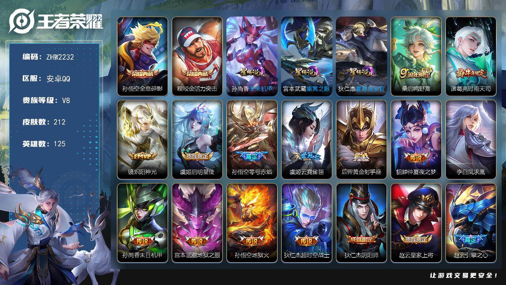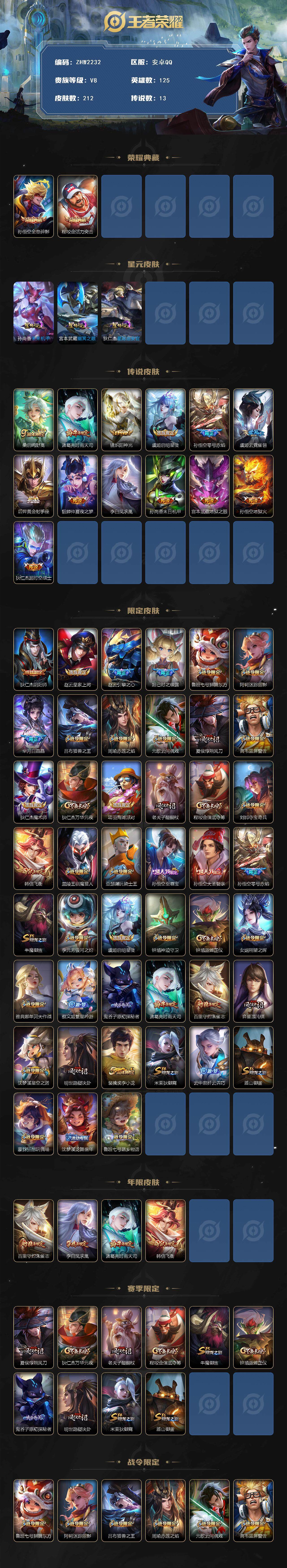 可二次,【店主推荐捡漏号!可直接换绑】,安卓q-v8-最强王者段位-125英雄-212皮肤-2典藏皮肤-13传说-53史诗 【荣耀典藏】:孙悟空全息碎影,程咬金活力突击 【传说皮肤】:桑启鸣野蒿,诸葛亮时雨天司,镜炽阳神光,虞姬启明星使,孙悟空零号赤焰,虞姬云霓雀翎,后羿黄金射手座,貂蝉仲夏夜之梦,李白凤求凰,孙尚香末日机甲,宫本武藏地狱之眼,孙悟空地狱火,狄仁杰超时空战士 【限定皮肤】:狄仁杰阴阳师,赵云皇家上将,赵云引擎之心,妲己时之彼端,鲁班七号狮舞东方,阿轲迷踪丽影,芈月白晶晶,吕布猎兽之王,周瑜赤莲之焰,元歌云间偶戏,夏侯惇朔风刀,典韦蓝屏警告,狄仁杰魔术师,狄仁杰万华元夜,项羽海滩派对,老夫子醍醐杖,程咬金演武夺筹,刘邦夺宝奇兵,韩信飞衡,兰陵王驯魔猎人,亚瑟潮玩骑士王,孙悟空至尊宝,孙悟空大圣娶亲,孙悟空零号赤焰,牛魔御旌,李元芳银河之约,虞姬启明星使,钟馗神迹守卫,钟馗驱傩正仪,女娲朔望之晖,雅典娜单词大作战,蔡文姬繁星吟游,鬼谷子原初探秘者,诸葛亮时雨天司,百里守约朱雀志,弈星混沌棋,沈梦溪星空之诺,明世隐疑决卦,裴擒虎李小龙,米莱狄御霄,云中君纤云弄巧,盾山御銮,蒙犽狂想玩偶喵,沈梦溪龙舞盛年,鲁班七号蔬乡物语 【年限皮肤】:百里守约朱雀志,李白凤求凰,诸葛亮时雨天司,韩信飞衡 【赛季限定】:夏侯惇朔风刀,狄仁杰万华元夜,老夫子醍醐杖,程咬金演武夺筹,牛魔御旌,钟馗驱傩正仪,鬼谷子原初探秘者,弈星混沌棋,明世隐疑决卦,米莱狄御霄,盾山御銮 【战令限定】:鲁班七号狮舞东方,阿轲迷踪丽影,吕布猎兽之王,周瑜赤莲之焰,元歌云间偶戏,典韦蓝屏警告,刘邦夺宝奇兵,兰陵王驯魔猎人,亚瑟潮玩骑士王,李元芳银河之约,钟馗神迹守卫,女娲朔望之晖,雅典娜单词大作战,沈梦溪星空之诺,蒙犽狂想玩偶喵,鲁班七号蔬乡物语 【史诗皮肤】:鲁班七号电玩小子,露娜紫霞仙子,赵云皇家上将,赵云未来纪元,貂蝉圣诞恋歌,甄姬冰雪圆舞曲,王昭君偶像歌手,狄仁杰魔术师,孙尚香水果甜心,妲己魅力维加斯,妲己女仆咖啡,吕布圣诞狂欢,李白千年之狐,吕布末日机甲,韩信白龙吟,孙悟空至尊宝,赵云引擎之心,花木兰水晶猎龙者,夏侯惇乘风破浪,兰陵王暗隐猎兽者,诸葛亮黄金分割率,雅典娜冰冠公主,安琪拉心灵骇客,百里守约特工魅影,铠曙光守护者,李元芳逐浪之夏,白起星夜王子,阿轲节奏热浪,孙策猫狗日记,百里守约朱雀志,孙悟空大圣娶亲,典韦蓝屏警告,伽罗箭羽风息,鲁班七号狮舞东方,狄仁杰鹰眼统帅,公孙离无限星赏官,兰陵王驯魔猎人,蔡文姬繁星吟游,李元芳银河之约,韩信飞衡,妲己时之彼端,不知火舞魅语,阿轲迷踪丽影,橘右京修罗,蒙犽狂想玩偶喵,裴擒虎李小龙,云中君纤云弄巧,元歌云间偶戏,芈月白晶晶,杨戬天秀启明,鲁班七号蔬乡物语,刘禅鸭鸭历险记,狂铁龙之律动 【其他皮肤】:项羽海滩派对,韩信教廷特使,韩信街头霸王,露娜哥特玫瑰,阿轲爱心护理,达摩大发明家,赵云白执事,赵云忍炎影,芈月红桃皇后,程咬金星际陆战队,程咬金爱与正义,白起白色死神,牛魔西部大镖客,扁鹊化身博士,扁鹊救世之瞳,宫本武藏未来纪元,安琪拉玩偶对对碰,孙膑天使之翼,姜子牙时尚教父,妲己少女阿狸,典韦黄金武士,亚瑟死亡骑士,达摩拳王,花木兰兔女郎,张飞五福同心,甄姬花好人间,刘备万事如意,宫本武藏万象初新,后羿阿尔法小队,狄仁杰阴阳师,刘备汉昭烈帝,关羽龙腾万里,墨子进击墨子号,钟无艳海滩丽影,宫本武藏霸王丸,王昭君幻想奇妙夜,狂铁命运角斗场,诸葛亮掌控之力,李白敏锐之力,苏烈坚韧之力,大乔守护之力,项羽科学大爆炸,米莱狄御霄,吕布猎兽之王,明世隐虹云星官,庄周奇妙博物学,牛魔御旌,女娲朔望之晖,吕布野性能量,钟馗神迹守卫,盾山御銮,姜子牙炽热元素使,夏侯惇朔风刀,周瑜赤莲之焰,沈梦溪星空之诺,弈星混沌棋,哪吒次元突破,鲁班七号黑桃队长,明世隐疑决卦,刘邦夺宝奇兵,盾山圆桌骑士,老夫子醍醐杖,鬼谷子原初探秘者,雅典娜单词大作战,狄仁杰万华元夜,亚瑟潮玩骑士王,刘禅秘密基地,杨戬次元傲视,露娜瓷语鉴心,程咬金演武夺筹,张良缤纷绘卷,钟馗驱傩正仪,鲁班大师乓乓大师,马可波罗潮玩牛仔,程咬金无双福将,蒙恬蔚蓝守将,猪八戒潮玩探月行,赵怀真太极少年,沈梦溪龙舞盛年,东皇太一噬灭天穹,姜子牙星梦巡礼,钟馗虚灵犬护,沈梦溪鸭鸭历险记,露娜命运加冕,雅典娜潮玩士官长,姬小满小满鸭,白起死霸装,甄姬逆浪荇歌,庄周锦麟游梦,亚瑟荣光之誓,雅典娜神奇女侠,鲁班七号福禄兄弟,鲁班七号木偶奇遇记,露娜绯红之刃,钟无艳生化警戒,貂蝉异域舞娘,花木兰剑舞者,王昭君精灵公主,狄仁杰锦衣卫,曹操死神来了,曹操超能战警,后羿精灵王,刘禅英喵野望,李白范海辛,钟馗地府判官,李元芳特种部队,刘邦圣殿之光,关羽天启骑士,夏侯惇战争骑士,马可波罗激情绿茵,苍维京掠夺者,太乙真人圆桌骑士,哪吒三太子,诸葛亮星航指挥官,黄忠芝加哥教父,东皇太一东海龙王,干将莫邪第七人偶,百里守约绝影神呛,苏烈爱与和平,明世隐占星师,公孙离花间舞,裴擒虎街头旋风,元歌午夜歌剧院,孙策海之征途,司马懿魇语军师,伽罗花见巫女,李信灼热之刃,上官婉儿修竹墨客,嫦娥露花倒影,猪八戒年年有余,盘古创世神祝,瑶森,云中君荷鲁斯之眼,曜归虚梦演,马超幸存者,蒙犽归虚梦演,镜冰刃幻境,蒙恬秩序猎龙将,
