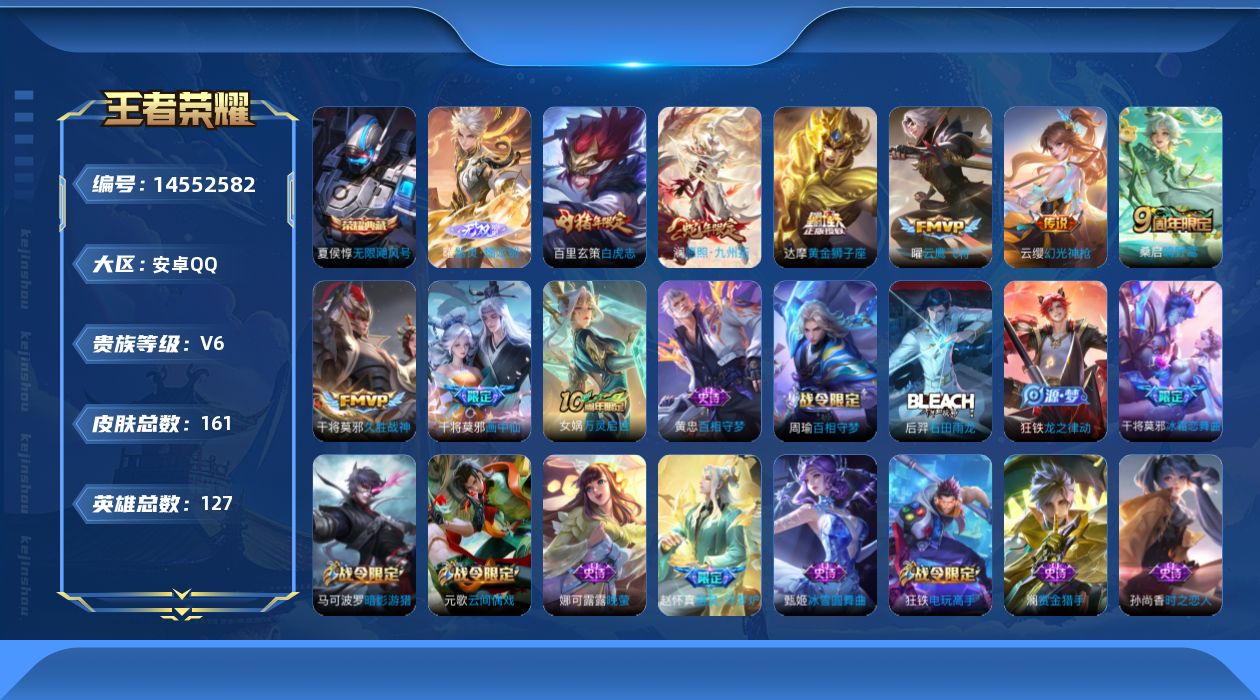 [14552582]贵族7-贵族积分22034-161皮1典藏8传说1无双 安卓手q423区161皮1典藏8传说1无双v6 营地id1835703255至圣王者【无双皮肤】:器灵·螭龙剑【荣耀典藏】:无限飓风号【优质限定皮肤】:白虎志【传说皮肤】:黄金狮子座幻光神呛愿照·九州拓云鹰飞将鸣野蒿白虎志画中仙久胜战神【史诗皮肤】:圣诞恋歌龙之律动冰霜恋舞曲万灵启世云间偶戏百相