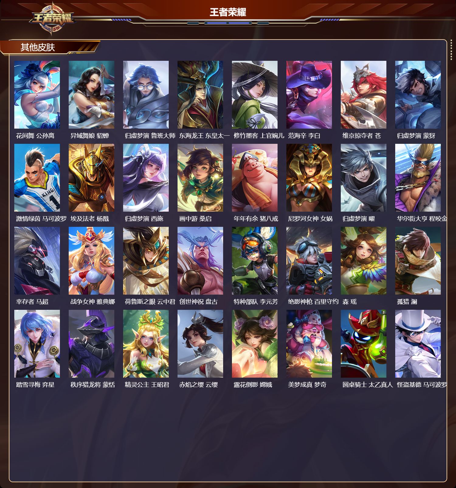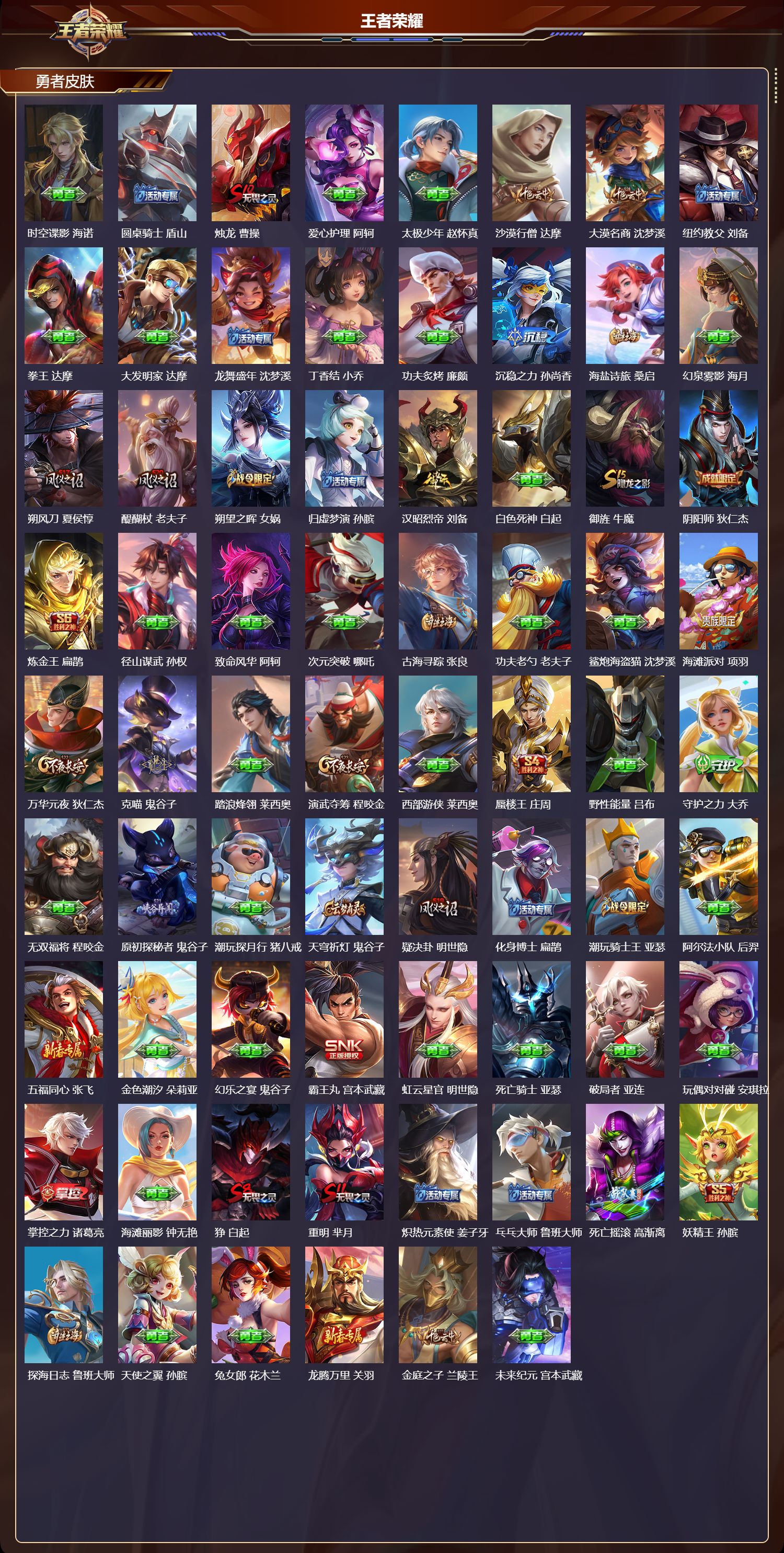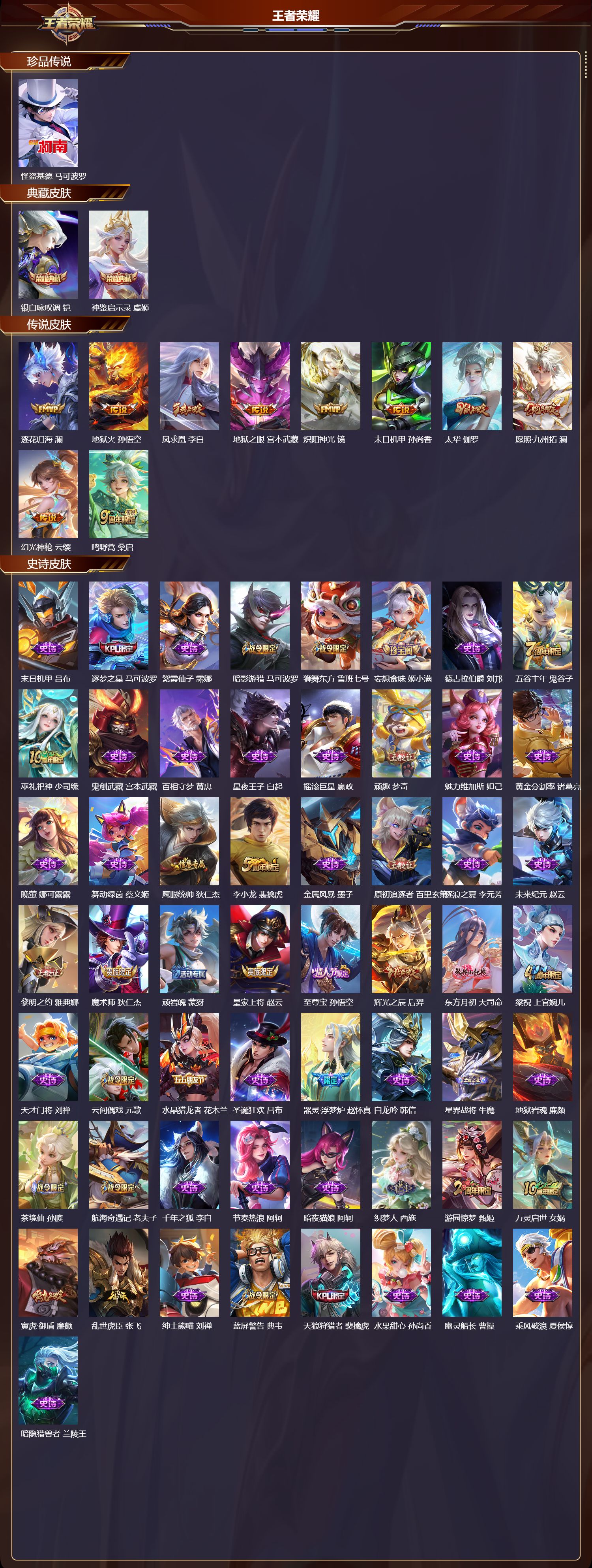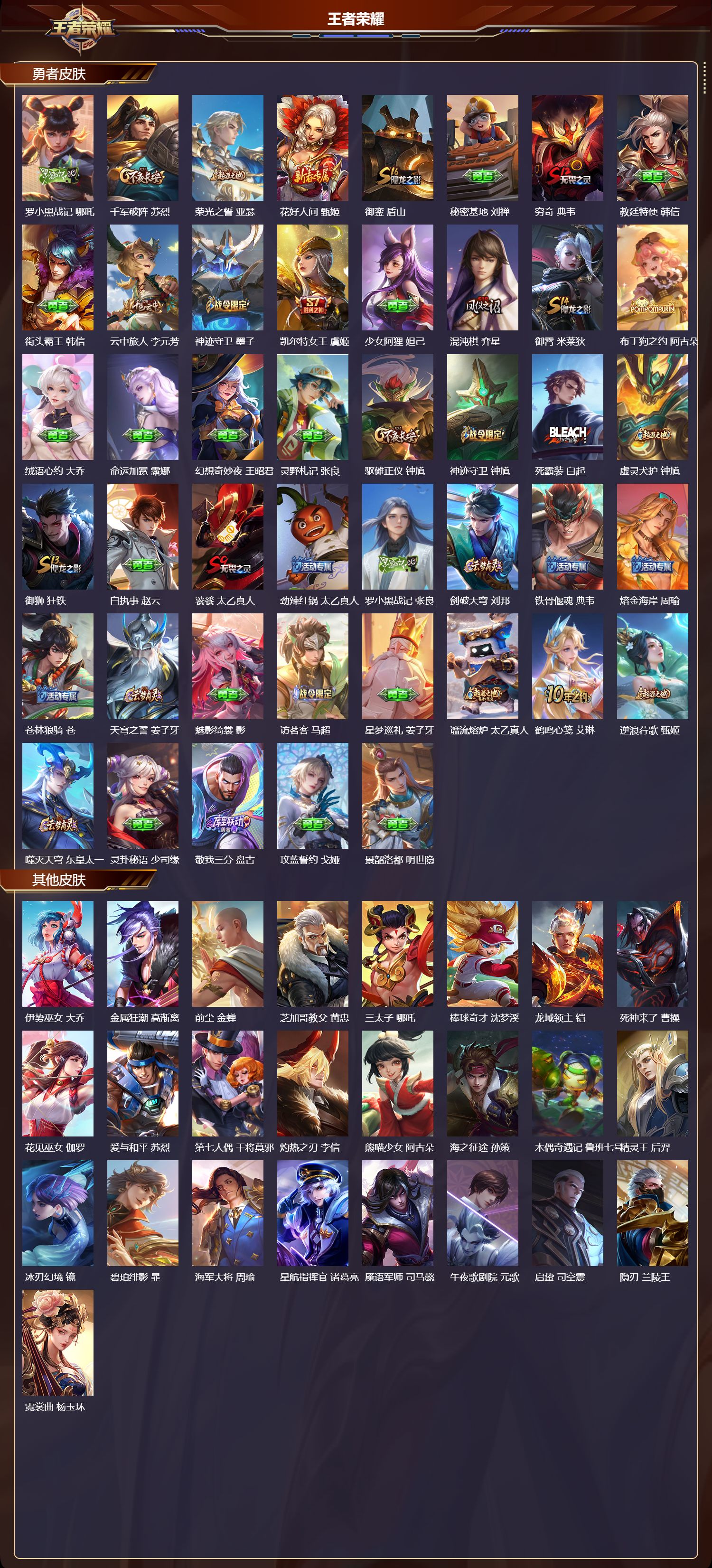 安卓qq/荣耀王者/243皮肤/127英雄/2典藏/0珍品无双/0无双/1珍品传说/10传说/57史诗/9稀有英雄【1 珍品传说】怪盗基德 马可波罗【2 典藏皮肤】银白咏叹调 铠神鉴启示录 虞姬【10 传说皮肤】逐花归海 澜地狱火 孙悟空凤求凰 李白地狱之眼 宫本武藏炽阳神光 镜末日机甲 孙尚香太华 伽罗愿照·九州拓 澜幻光神呛 云缨鸣野蒿 桑启【57