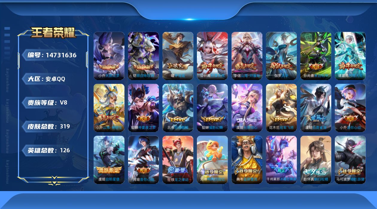 [14731636]安卓q-v8-永恒钻石ii段位-126英雄-319皮肤-2典藏-0珍品无双-0无双-0珍品传说-16传说-91史诗 【荣耀典藏】:小乔天鹅之梦,铠银白咏叹调 【传说皮肤】:虞姬无限倾心,小乔山海琳琅生,李信山海炽霜斩,吕布怒海麟威,曜李 ,周瑜音你心动,小乔音你心动,公孙离祈雪灵祝,诸葛亮时雨天司,虞姬启明星使,伽罗太华,貂蝉猫影幻舞,虞姬云霓雀翎,花木兰冠军飞将,貂蝉仲夏夜之梦,孙尚香末日机甲 【限定皮肤】:白起狰,蒙犽顽岩魄,姜子牙天穹之誓,狄仁杰阴阳师,小乔山海琳琅生,赵云皇家上将,墨子神迹守卫,嬴政白昼王子,孙尚香蔷薇恋人,鲁班七号狮舞东方,庄周云端筑梦师,高渐离死亡摇滚,阿轲迷踪丽影,孙膑天狼运算者,芈月重明,芈月白晶晶,吕布猎兽之王,周瑜赤莲之焰,元歌云间偶戏,夏侯惇朔风刀,曹操烛龙,典韦穷奇,典韦蓝屏警告,马可波罗逐梦之星,马可波罗暗影游猎,马可波罗山海玄木吟,狄仁杰魔术师,狄仁杰万华元夜,达摩星际陆战队,项羽海滩派对,老夫子醍醐杖,老夫子航海奇遇记,安琪拉魔法小厨娘,程咬金演武夺筹,露娜一生所爱,刘邦夺宝奇兵,兰陵王驯魔猎人,花木兰默契交锋,亚瑟潮玩骑士王,孙悟空大圣娶亲,牛魔御旌,李元芳银河之约,李元芳云中旅人,虞姬霸王别姬,虞姬启明星使,虞姬无限倾心,钟馗神迹守卫,钟馗驱傩正仪,杨戬潮玩骑兵,女娲朔望之晖,干将莫邪冰霜恋舞曲,雅典娜单词大作战,雅典娜黎明之约,蔡文姬繁星吟游,太乙真人饕餮,鬼谷子原初探秘者,诸葛亮时雨天司,大乔白鹤梁神女,黄忠火炮绅士,百里玄策原初追逐者,百里守约朱雀志,弈星混沌棋,梦奇顽趣,公孙离蜜橘之夏,公孙离祈雪灵祝,沈梦溪星空之诺,明世隐疑决卦,裴擒虎天狼狩猎者,裴擒虎擒涛扼浪,狂铁御狮,米莱狄御霄,米莱狄胡桃异想国,瑶山海碧波行,云中君纤云弄巧,李信山海炽霜斩,伽罗太华,伽罗天狼溯光者,盾山御銮,猪八戒西部大镖客,上官婉儿梁祝,上官婉儿天狼绘梦者,嫦娥如梦令,嫦娥暖冬兔眠,曜李 ,蒙犽狂想玩偶喵,鲁班大师探海日志,桑启海盐诗旅,暃星界游侠,赵怀真鹤归松栖,张良古海寻踪,高渐离燃音魔法,妲己灵卜魔法,鬼谷子天穹祈灯,沈梦溪龙舞盛年,鲁班七号蔬乡物语,李元芳蔬乡物语,刘邦剑破天穹,周瑜熔金海岸 【年限皮肤】:百里守约朱雀志,公孙离祈雪灵祝,诸葛亮时雨天司,伽罗太华,瑶山海碧波行,马可波罗山海玄木吟,李信山海炽霜斩,