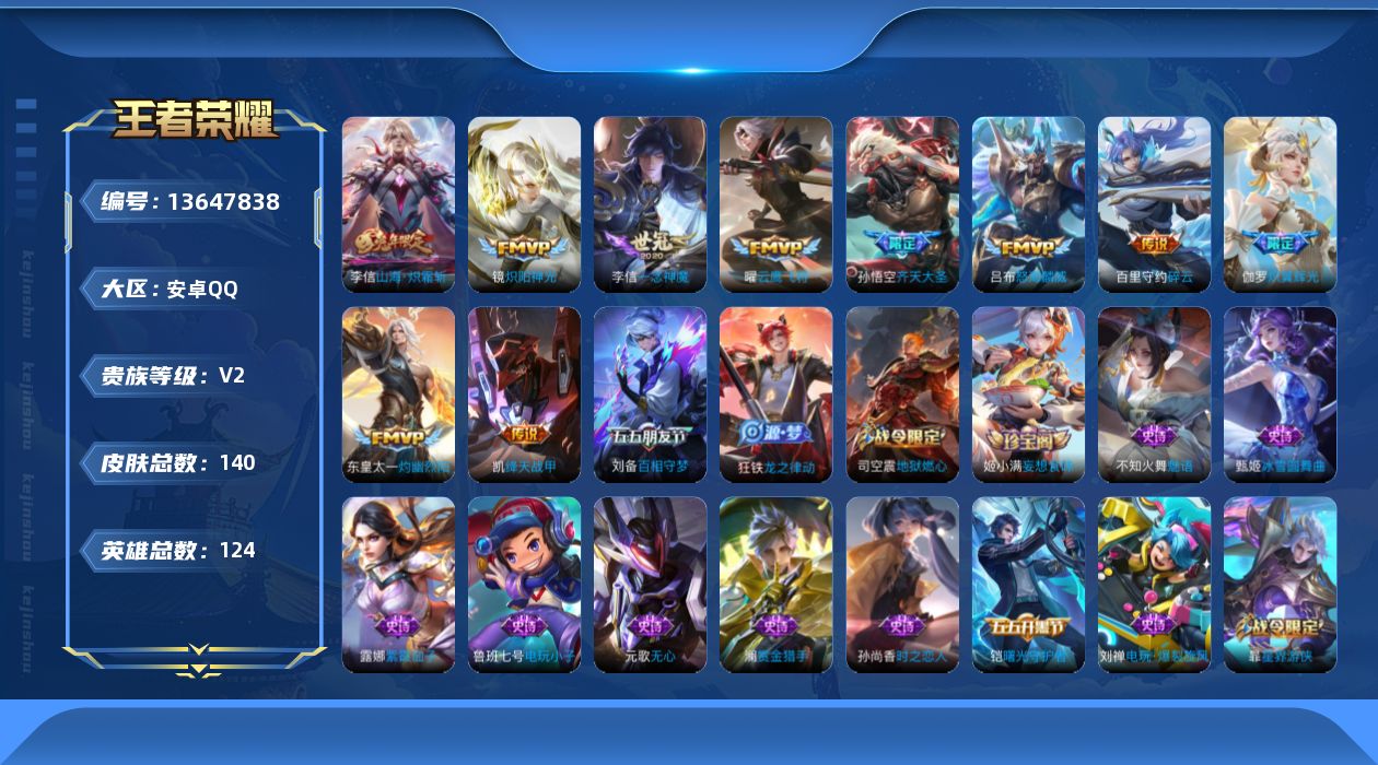 [13647838]【编号70668 可秒换绑】【新手号 适合回坑玩家 皮肤质量扎实!!】 安卓q-v2-尊贵铂金iv段位-124英雄-140皮肤-0典藏-0珍品无双-0无双-0珍品传说-10传说-43史诗 【传说皮肤】:东皇太一灼幽烈阳,伽罗炽翼辉光,孙悟空齐天大圣,李信山海炽霜斩,吕布怒海麟威,百里守约碎云,铠绛天战甲,镜炽阳神光,曜云鹰飞将,李信一念神魔 【限定皮肤】:蒙犽顽岩魄,姜子牙天穹之誓,狄仁杰阴阳师,赵云皇家上将,钟无艳超时空战士,扁鹊奇幻香踪,白起夜都怪侠,元歌无心,甄姬落雪兰心,狄仁杰魔术师,项羽海滩派对,兰陵王金庭之子,孙悟空齐天大圣,刘备百相守梦,李元芳云中旅人,杨戬潮玩骑兵,沈梦溪大漠名商,沈梦溪匿光破解者,裴擒虎擒涛扼浪,云中君纤云弄巧,李信山海炽霜斩,伽罗炽翼辉光,嫦娥拒霜思,嫦娥暖冬兔眠,西施玲珑珍味,鲁班大师探海日志,桑启海盐诗旅,暃星界游侠,戈娅驭风魔法,艾琳流音漫舞,司空震地狱燃心,阿古朵江河有灵,张良古海寻踪,蒙犽百解令,高渐离燃音魔法,妲己灵卜魔法,鬼谷子天穹祈灯,姬小满妄想食味,百里玄策超元猎域,刘邦剑破天穹,周瑜熔金海岸 【年限皮肤】:李信山海炽霜斩,伽罗炽翼辉光 【赛季限定】:兰陵王金庭之子,张良古海寻踪,李元芳云中旅人,沈梦溪大漠名商,裴擒虎擒涛扼浪,鲁班大师探海日志,桑启海盐诗旅,鬼谷子天穹祈灯,刘邦剑破天穹,姜子牙天穹之誓 【战令限定】:钟无艳超时空战士,扁鹊奇幻香踪,白起夜都怪侠,甄姬落雪兰心,艾琳流音漫舞,杨戬潮玩骑兵,嫦娥暖冬兔眠,西施玲珑珍味,司空震地狱燃心,暃星界游侠,戈娅驭风魔法,高渐离燃音魔法,妲己灵卜魔法 【史诗皮肤】:鲁班七号电玩小子,露娜紫霞仙子,赵云皇家上将,貂蝉圣诞恋歌,甄姬冰雪圆舞曲,狄仁杰魔术师,宫本武藏鬼剑武藏,孙尚香水果甜心,嬴政摇滚巨星,妲己魅力维加斯,墨子金属风暴,吕布圣诞狂欢,夏侯惇乘风破浪,小乔缤纷独角兽,亚瑟心灵战警,百里守约特工魅影,铠曙光守护者,蔡文姬舞动绿茵,李元芳逐浪之夏,阿轲节奏热浪,狄仁杰鹰眼统帅,不知火舞魅语,孙尚香时之恋人,云中君纤云弄巧,嫦娥拒霜思,澜赏金猎手,钟无艳超时空战士,元歌无心,暃星界游侠,扁鹊奇幻香踪,刘备百相守梦,沈梦溪匿光破解者,蔡文姬电玩兔顽号,刘禅电玩爆裂旋风,戈娅驭风魔法,司空震地狱燃心,阿古朵江河有灵,蒙犽百解令,妲己灵卜魔法,高渐离燃音魔法,
