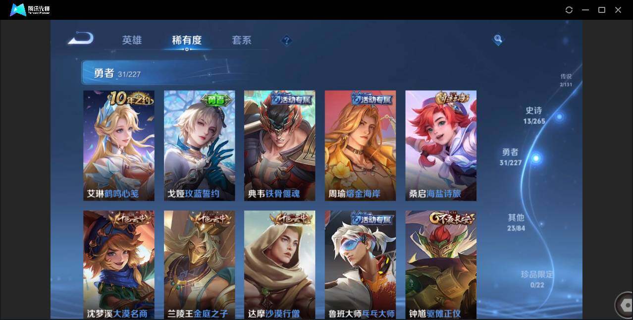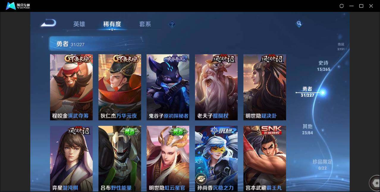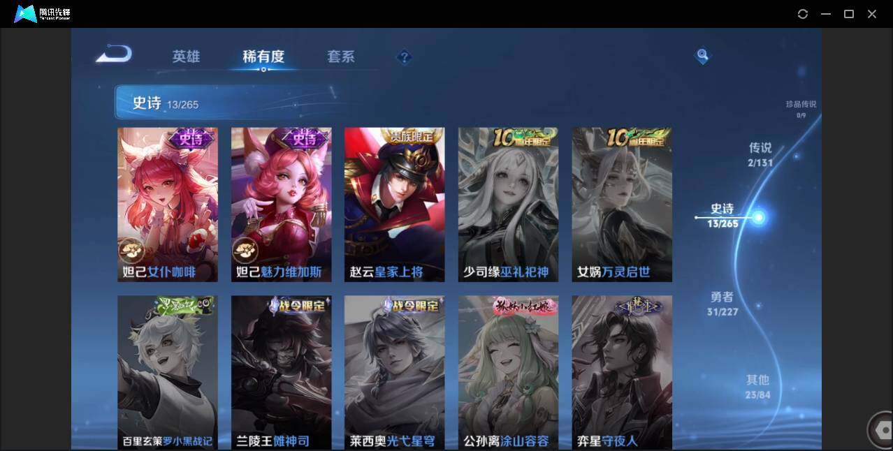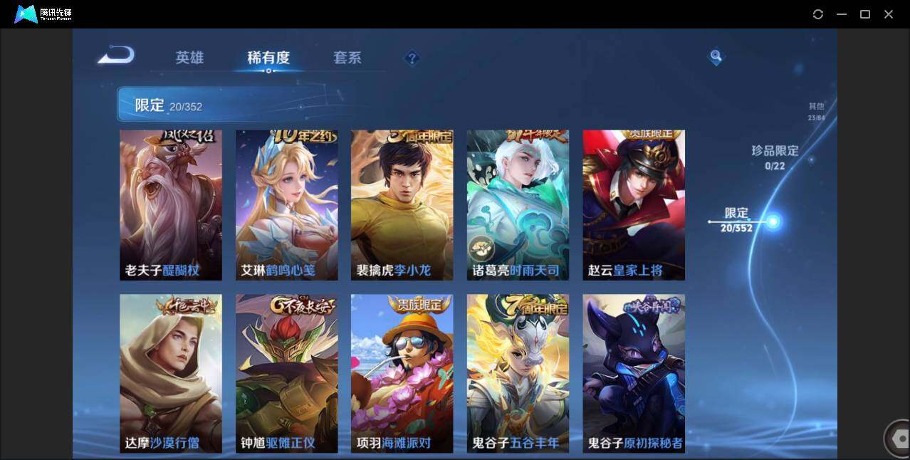 89英雄-69皮肤-贵族5/皮肤69/传说2/史诗13/英雄89/云缨幻光神呛/诸葛亮-时雨天司/狄仁杰-阴阳师/赵云-皇家上将/狄仁杰-万华元夜/达摩-沙漠行僧/项羽-海滩派对/老夫子-醍醐杖/程咬金-演武夺筹/兰陵王-金庭之子/钟馗-驱傩正仪/鬼谷子-原初探秘者/鬼谷子-五谷丰年/弈星-混沌棋/沈梦溪-大漠名商/明世隐-疑决卦/裴擒虎-李小龙/云中君-纤云弄巧/桑启-海盐诗旅/周瑜熔金海岸/弈星混沌棋/妲己-