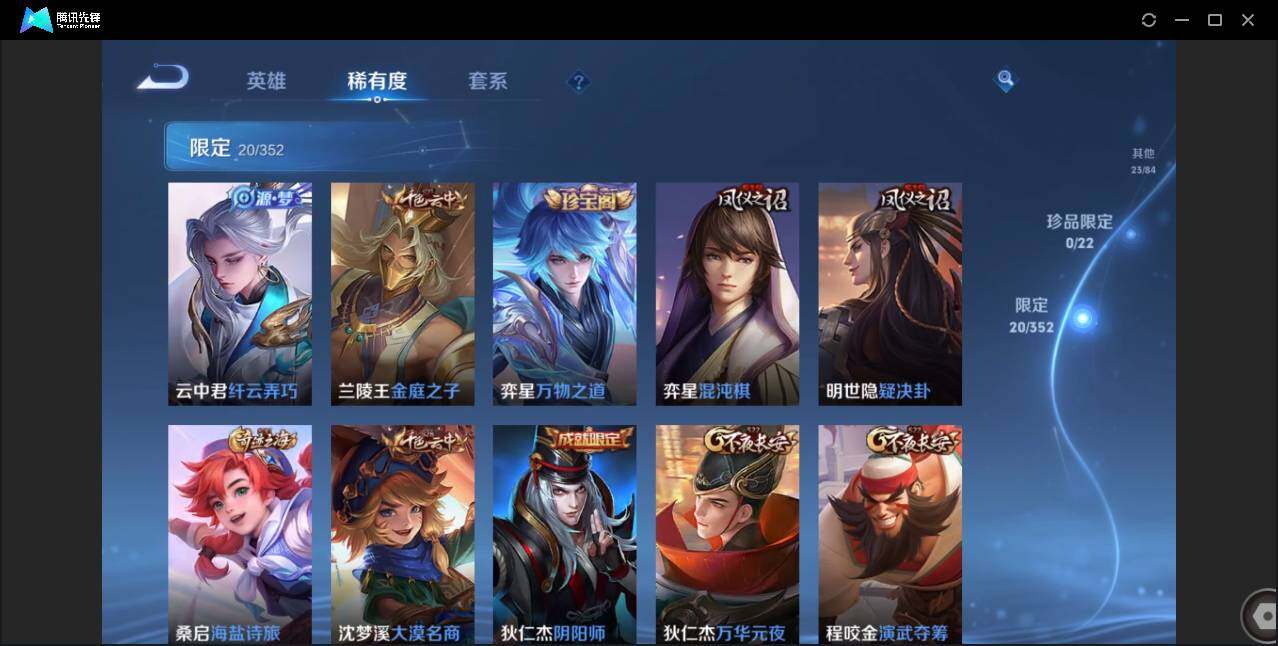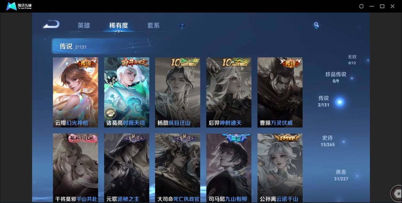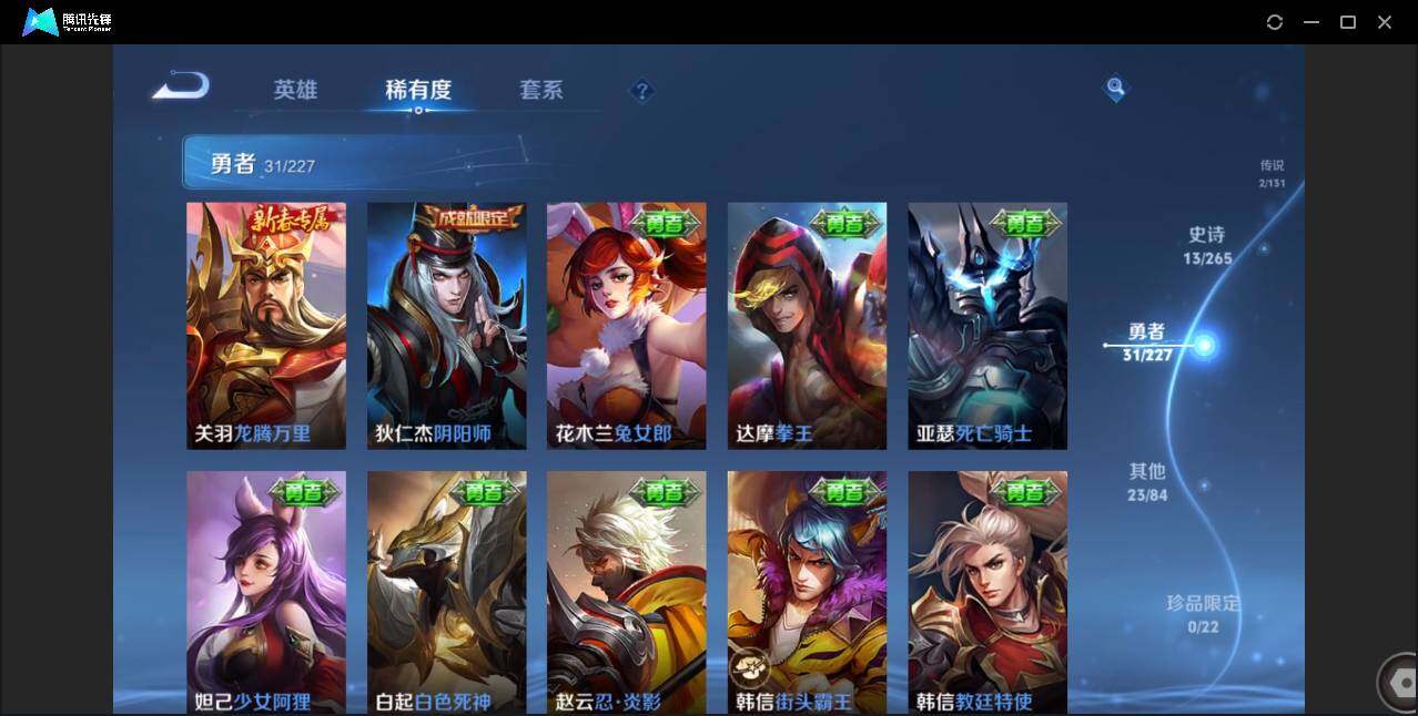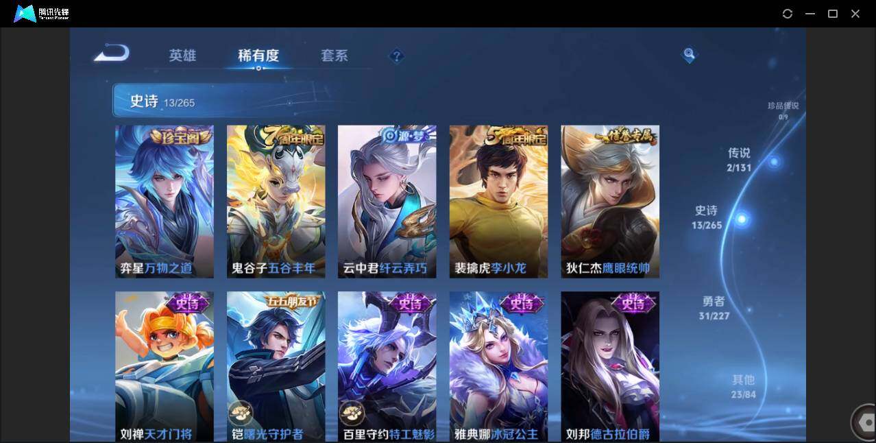 89英雄-69皮肤-贵族5/皮肤69/传说2/史诗13/英雄89/云缨幻光神呛/诸葛亮-时雨天司/狄仁杰-阴阳师/赵云-皇家上将/狄仁杰-万华元夜/达摩-沙漠行僧/项羽-海滩派对/老夫子-醍醐杖/程咬金-演武夺筹/兰陵王-金庭之子/钟馗-驱傩正仪/鬼谷子-原初探秘者/鬼谷子-五谷丰年/弈星-混沌棋/沈梦溪-大漠名商/明世隐-疑决卦/裴擒虎-李小龙/云中君-纤云弄巧/桑启-海盐诗旅/周瑜熔金海岸/弈星混沌棋/妲己-