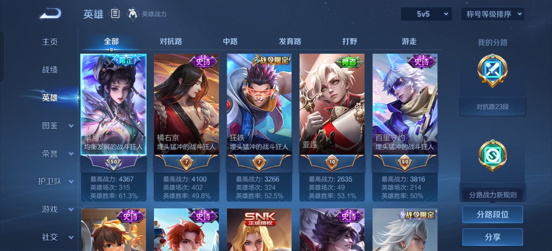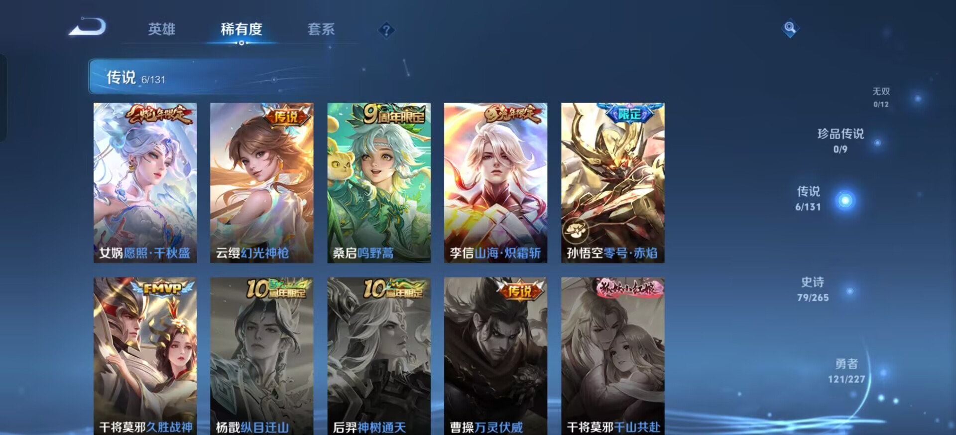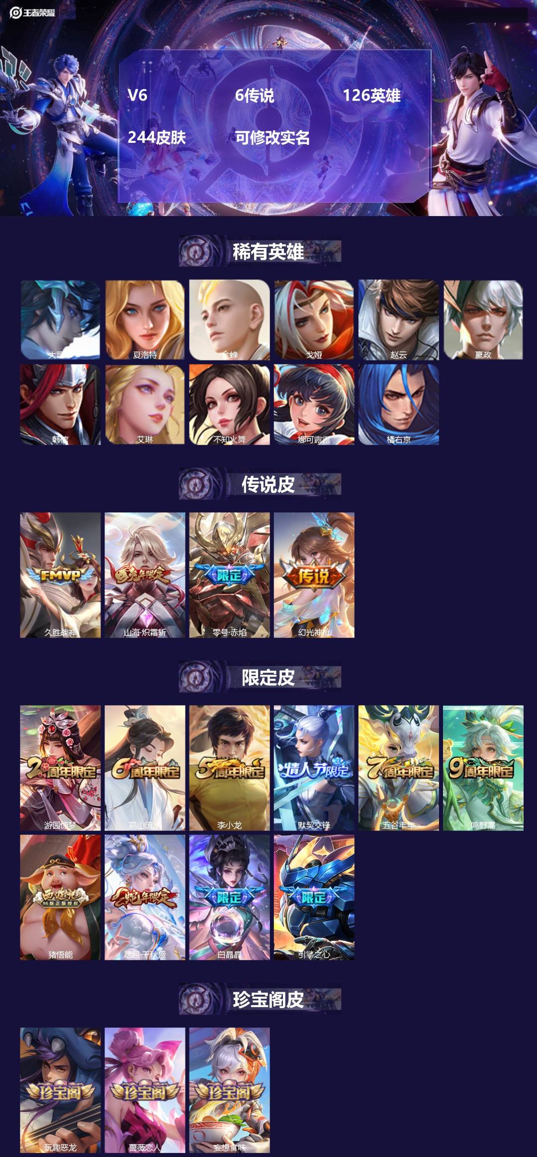 v6 6传说 126英雄 244皮肤 可修改实名 【英雄全皮】:蚩奼全皮戈娅全皮影全皮 【稀有英雄】:大司命嬴政始皇帝韩信韩跳跳夏洛特夏师傅艾琳橘右京橘子娜可露露鸟人不知火舞赵云金蝉唐僧戈娅 【传说皮】:幻光神呛山海·炽霜斩李信年限零号·赤焰