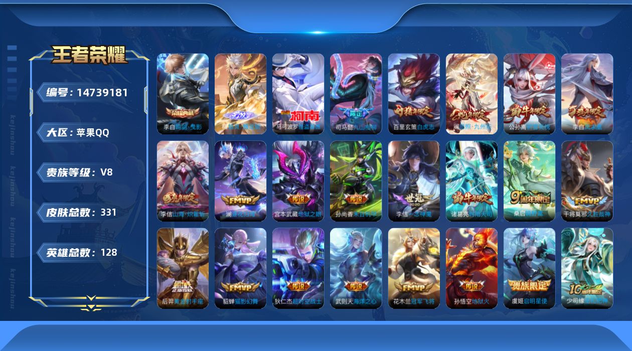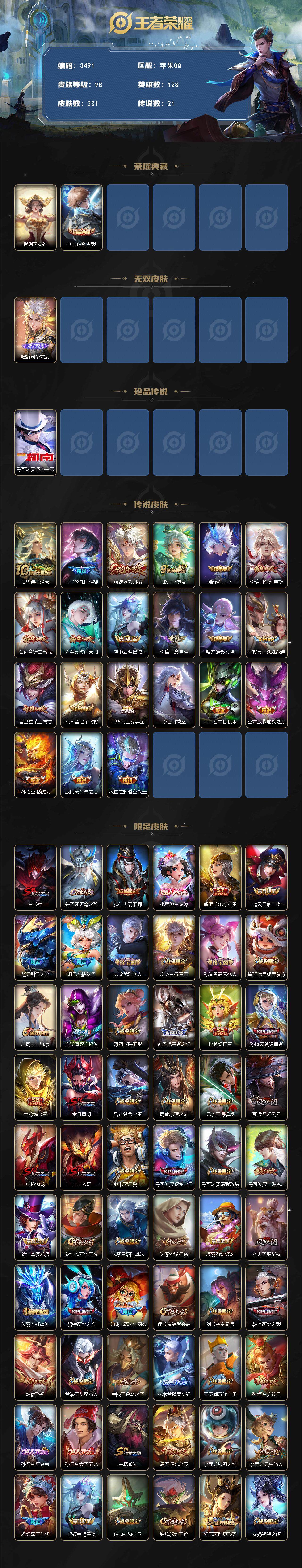 [14739181]苹果q-v5-最强王者段位-128英雄-331皮肤-1典藏皮肤-1典藏英雄-1无双-1珍品传说-21传说-102史诗 【英雄全皮】:阿轲全皮,司马懿全皮,鬼谷子全皮,李信全皮,猪八戒全皮,空空儿全皮 【荣耀典藏】:武则天英雄,李白鸣剑曳影 【无双皮肤】:曜器灵螭龙剑 【珍品传说】:马可波罗怪盗基德 【传说皮肤】:后羿神树通天,司马懿九山相柳,澜愿照九州拓,桑启鸣野蒿,澜逐花归海,李信山海炽霜斩,公孙离祈雪灵祝,诸葛亮时雨天司,虞姬启明星使,李信一念神魔,貂蝉猫影幻舞,干将莫邪久胜战神,百里玄策白虎志,花木兰冠军飞将,后羿黄金射手座,李白凤求凰,孙尚香末日机甲,宫本武藏地狱之眼,孙悟空地狱火,武则天海洋之心,狄仁杰超时空战士 【限定皮肤】:白起狰,姜子牙天穹之誓,狄仁杰阴阳师,小乔纯白花嫁,虞姬凯尔特女王,赵云皇家上将,赵云引擎之心,妲己热情桑巴,嬴政优雅恋人,嬴政白昼王子,孙尚香蔷薇恋人,鲁班七号狮舞东方,庄周高山流水,高渐离死亡摇滚,阿轲迷踪丽影,钟无艳王者之锤,孙膑妖精王,孙膑天狼运算者,扁鹊炼金王,芈月重明,吕布猎兽之王,周瑜赤莲之焰,元歌云间偶戏,夏侯惇朔风刀,曹操烛龙,典韦穷奇,典韦蓝屏警告,马可波罗逐梦之星,马可波罗暗影游猎,马可波罗山海玄木吟,狄仁杰魔术师,狄仁杰万华元夜,达摩星际陆战队,达摩沙漠行僧,项羽海滩派对,老夫子醍醐杖,关羽冰锋战神,貂蝉逐梦之音,安琪拉魔法小厨娘,程咬金演武夺筹,刘邦夺宝奇兵,韩信逐梦之影,韩信飞衡,兰陵王驯魔猎人,兰陵王金庭之子,花木兰默契交锋,亚瑟潮玩骑士王,孙悟空美猴王,孙悟空至尊宝,孙悟空大圣娶亲,牛魔御旌,后羿辉光之辰,李元芳银河之约,李元芳云中旅人,虞姬霸王别姬,虞姬启明星使,钟馗神迹守卫,钟馗驱傩正仪,杨玉环遇见飞天,女娲朔望之晖,干将莫邪冰霜恋舞曲,雅典娜单词大作战,雅典娜黎明之约,蔡文姬奇迹圣诞,蔡文姬繁星吟游,太乙真人饕餮,太乙真人华丽摇滚,东皇太一逐梦之光,鬼谷子原初探秘者,鬼谷子五谷丰年,诸葛亮时雨天司,苏烈千军破阵,百里玄策白虎志,百里玄策原初追逐者,百里守约朱雀志,弈星混沌棋,梦奇顽趣,公孙离祈雪灵祝,沈梦溪星空之诺,沈梦溪大漠名商,明世隐疑决卦,裴擒虎天狼狩猎者,裴擒虎李小龙,裴擒虎擒涛扼浪,狂铁御狮,米莱狄御霄,米莱狄胡桃异想国,云中君纤云弄巧,李信山海炽霜斩,盾山御銮,猪八戒西部大镖客,猪