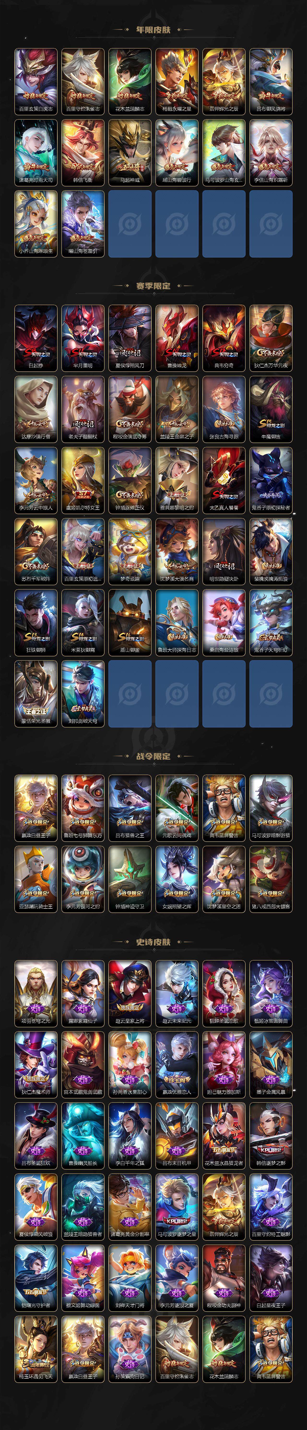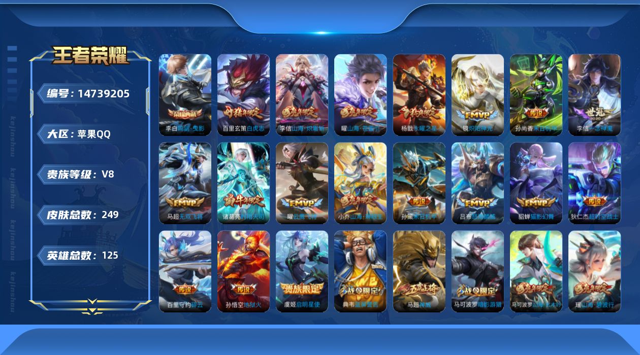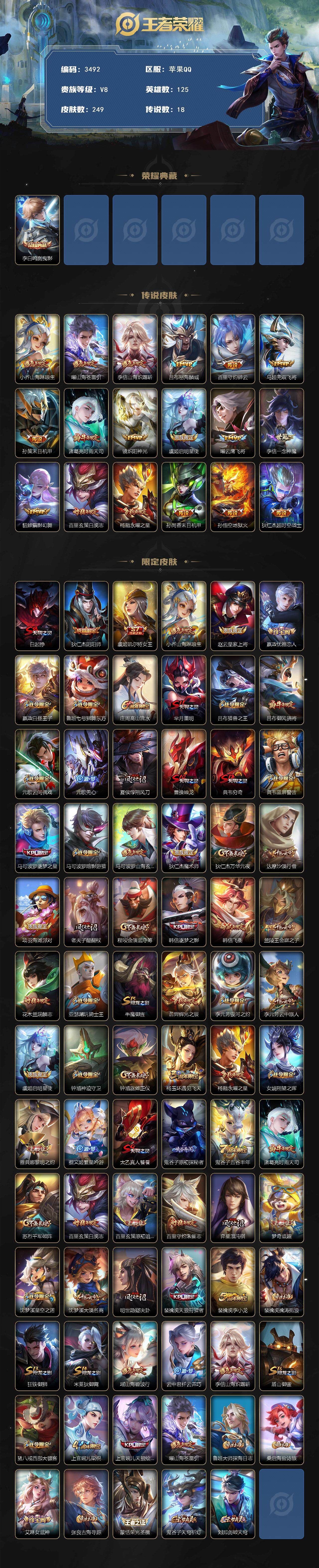 [14739205]苹果q-v2-至尊星耀ii段位-125英雄-249皮肤-1典藏皮肤-18传说-65史诗 【英雄全皮】:李信全皮,蒙恬全皮 【荣耀典藏】:李白鸣剑曳影 【传说皮肤】:小乔山海琳琅生,曜山海苍雷引,李信山海炽霜斩,吕布怒海麟威,百里守约碎云,马超无双飞将,孙策末日机甲,诸葛亮时雨天司,镜炽阳神光,虞姬启明星使,曜云鹰飞将,李信一念神魔,貂蝉猫影幻舞,百里玄策白虎志,杨戬永曜之星,孙尚香末日机甲,孙悟空地狱火,狄仁杰超时空战士 【限定皮肤】:白起狰,狄仁杰阴阳师,虞姬凯尔特女王,小乔山海琳琅生,赵云皇家上将,嬴政优雅恋人,嬴政白昼王子,鲁班七号狮舞东方,庄周高山流水,芈月重明,吕布猎兽之王,吕布御风骁将,元歌云间偶戏,元歌无心,夏侯惇朔风刀,曹操烛龙,典韦穷奇,典韦蓝屏警告,马可波罗逐梦之星,马可波罗暗影游猎,马可波罗山海玄木吟,狄仁杰魔术师,狄仁杰万华元夜,达摩沙漠行僧,项羽海滩派对,老夫子醍醐杖,程咬金演武夺筹,韩信逐梦之影,韩信飞衡,兰陵王金庭之子,花木兰瑞麟志,亚瑟潮玩骑士王,牛魔御旌,后羿辉光之辰,李元芳银河之约,李元芳云中旅人,虞姬启明星使,钟馗神迹守卫,钟馗驱傩正仪,杨玉环遇见飞天,杨戬永曜之星,女娲朔望之晖,雅典娜黎明之约,蔡文姬繁星吟游,太乙真人饕餮,鬼谷子原初探秘者,鬼谷子五谷丰年,诸葛亮时雨天司,苏烈千军破阵,百里玄策白虎志,百里玄策原初追逐者,百里守约朱雀志,弈星混沌棋,梦奇顽趣,沈梦溪星空之诺,沈梦溪大漠名商,明世隐疑决卦,裴擒虎天狼狩猎者,裴擒虎李小龙,裴擒虎擒涛扼浪,狂铁御狮,米莱狄御霄,瑶山海碧波行,云中君纤云弄巧,李信山海炽霜斩,盾山御銮,猪八戒西部大镖客,上官婉儿梁祝,上官婉儿天狼绘梦者,曜山海苍雷引,鲁班大师探海日志,桑启海盐诗旅,艾琳女武神,张良古海寻踪,蒙恬荣光圣徽,鬼谷子天穹祈灯,刘邦剑破天穹 【年限皮肤】:百里玄策白虎志,百里守约朱雀志,花木兰瑞麟志,杨戬永曜之星,后羿辉光之辰,吕布御风骁将,诸葛亮时雨天司,韩信飞衡,马超神威,瑶山海碧波行,马可波罗山海玄木吟,李信山海炽霜斩,小乔山海琳琅生,曜山海苍雷引 【赛季限定】:白起狰,芈月重明,夏侯惇朔风刀,曹操烛龙,典韦穷奇,狄仁杰万华元夜,达摩沙漠行僧,老夫子醍醐杖,程咬金演武夺筹,兰陵王金庭之子,张良古海寻踪,牛魔御旌,李元芳云中旅人,虞姬凯尔特女王,钟馗驱傩正仪,雅典娜黎明