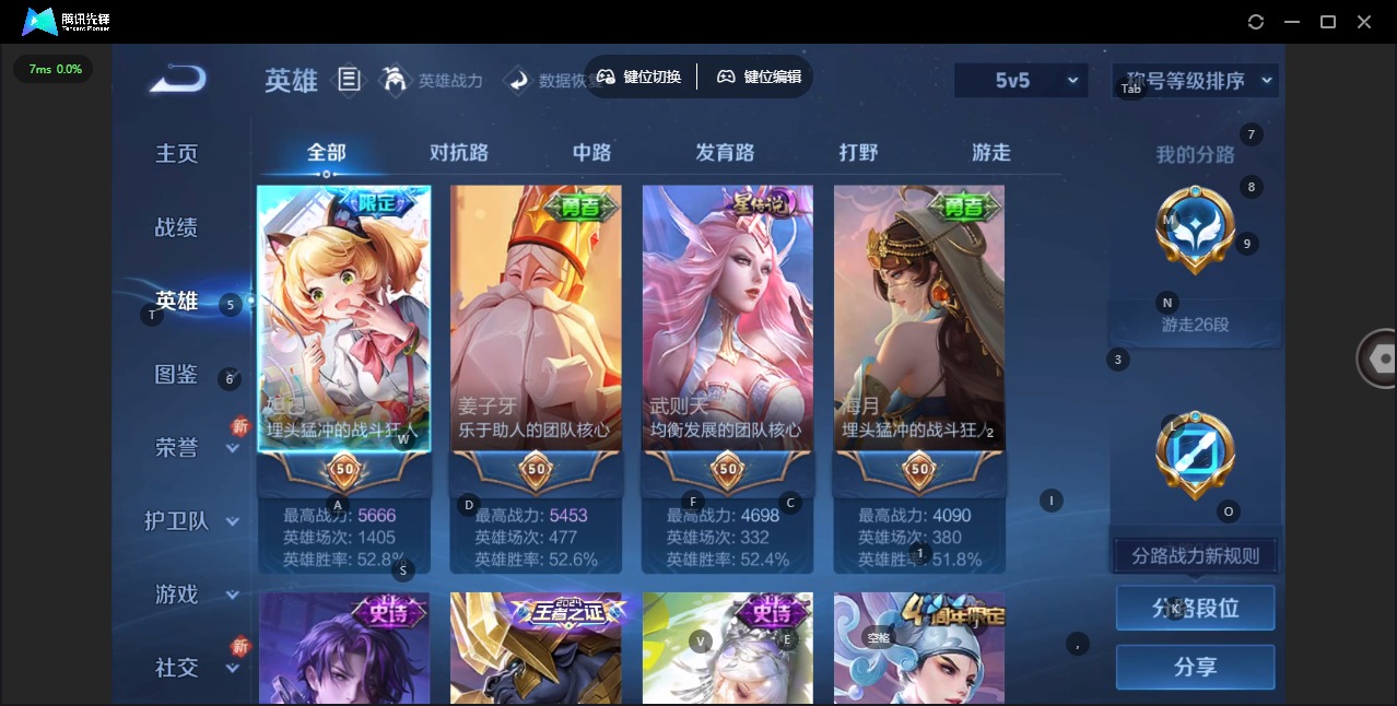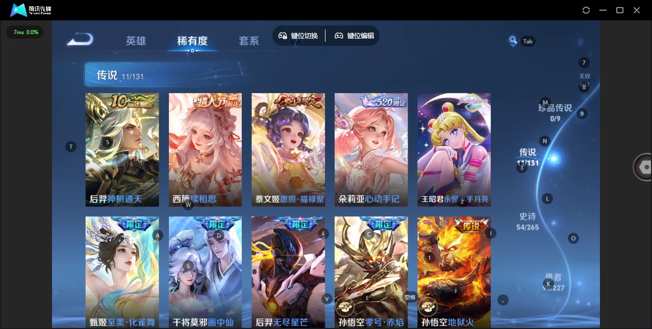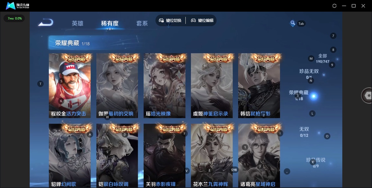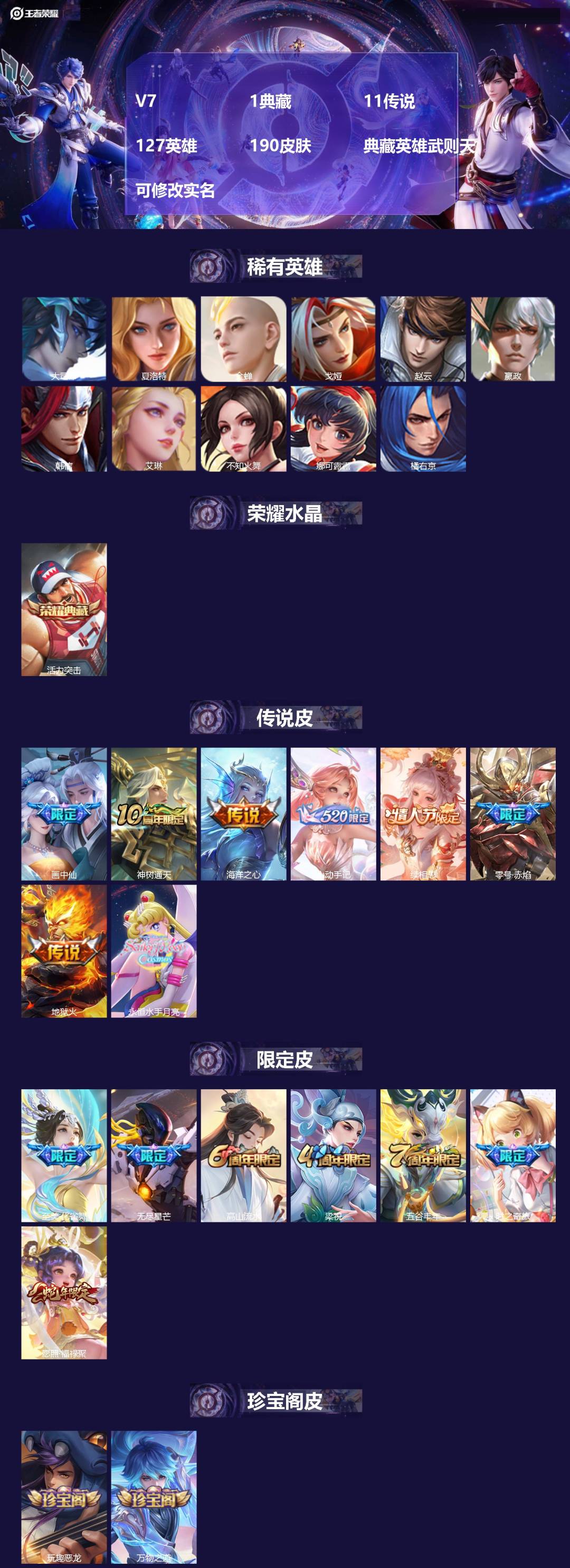 v7 1典藏 11传说 127英雄 190皮肤 典藏英雄武则天 可修改实名 【稀有英雄】:大司命嬴政始皇帝韩信韩跳跳夏洛特夏师傅艾琳橘右京橘子娜可露露鸟人不知火舞赵云金蝉唐僧戈娅 【荣耀水晶】:活力突击 【传说皮】:朵莉亚心动手记神树通天续相思永恒