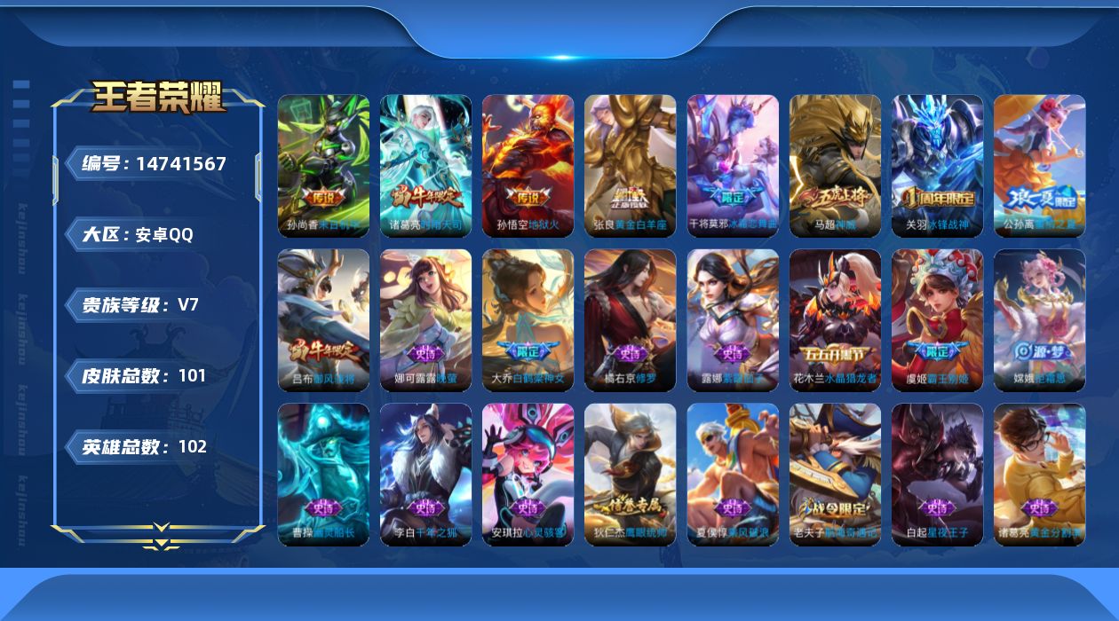 [14741567]hw8637安卓q-vundefined-无双王者-102英雄-101皮肤-0典藏-0无双-0珍品传说-4传说-29史诗 【稀有英雄】 嬴政 不知火舞 橘右京 夏洛特 娜可露露 韩信 艾琳 赵云 【传说皮肤】 地狱火 时雨天司 末日机甲 黄金白羊座 【限定皮肤】 末日机甲 时雨天司 冰霜恋舞曲 蜜橘之夏 紫霞仙子 白鹤梁神女 神威 【史诗皮肤】 紫霞仙子 冰霜恋舞曲 白鹤梁神女 星夜王子 冰锋战神 蜜橘之夏 修罗 拒霜思 黄金分割率 霸王别姬 晚萤 暗夜贵公子 鹰眼统帅 未来纪元 魔术师 热力回旋 神威 皇家上将 圣诞恋歌 水晶猎龙者 御风骁将 圣诞狂欢 天狼溯光者 航海奇遇记 千年之狐 心灵骇客 乱世虎臣 幽灵船长 乘风破浪 【勇者皮肤】 缤纷绘卷 大发明家 铁甲之心 爱与正义 醍醐杖 归虚梦演 汉昭烈帝 黄金武士 阴阳师 鲨炮海盗猫 海滩派对 万华元夜 演武夺筹 红桃皇后 奇妙博物学 瓷语鉴心 天穹祈灯 疑决卦 化身博士 潮玩骑士王 次元傲视 幻乐之宴 掌控之力 狰 炽热元素使 乓乓大师 探海日志 天使之翼 万象初新 御銮 秘密基地 教廷特使 紫罗兰之誓 神迹守卫 重装意志 少女阿狸 混沌棋 驱傩正仪 命运角斗场 白执事 【其他皮肤】 伊势巫女 金属狂潮 棒球奇才 极冰防御线 万圣前夜 海之征途 福禄兄弟 海军大将 星航指挥官 午夜歌剧院 启蛰 霓裳曲 异域舞娘 归虚梦演 东海龙王 修竹墨客 范海辛 维京掠夺者 激情绿茵 尼罗河女神 幸存者 特种部队 绝影神呛 精灵公主 赤焰之缨 美梦成真 天启骑士
