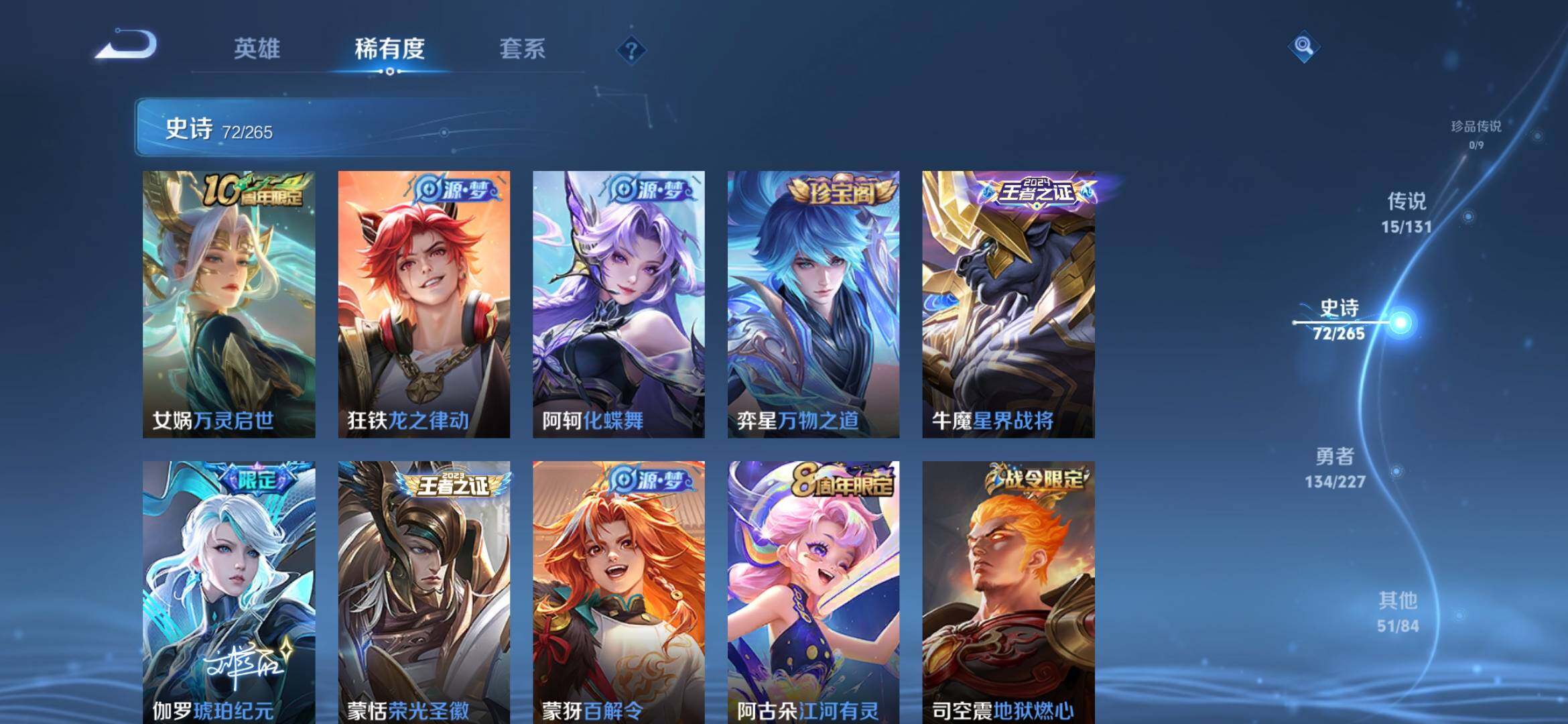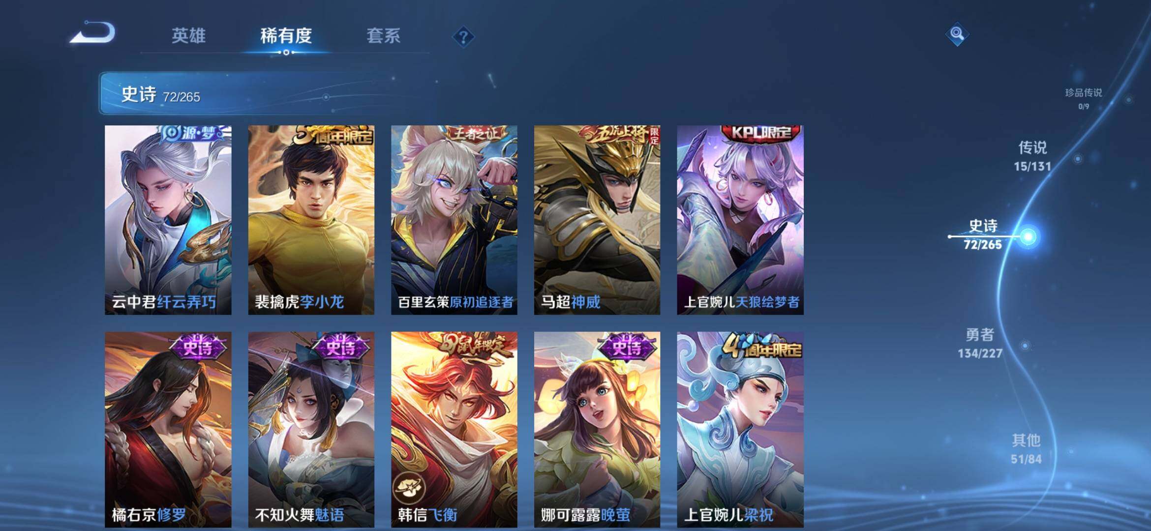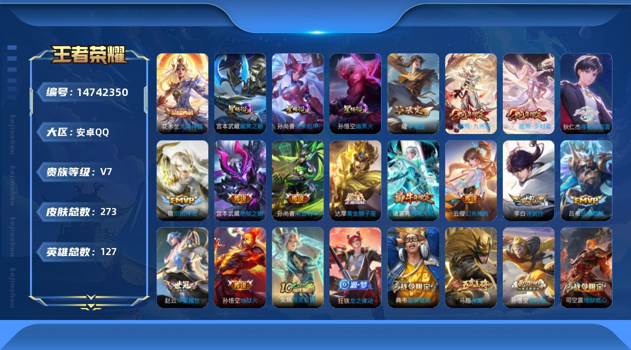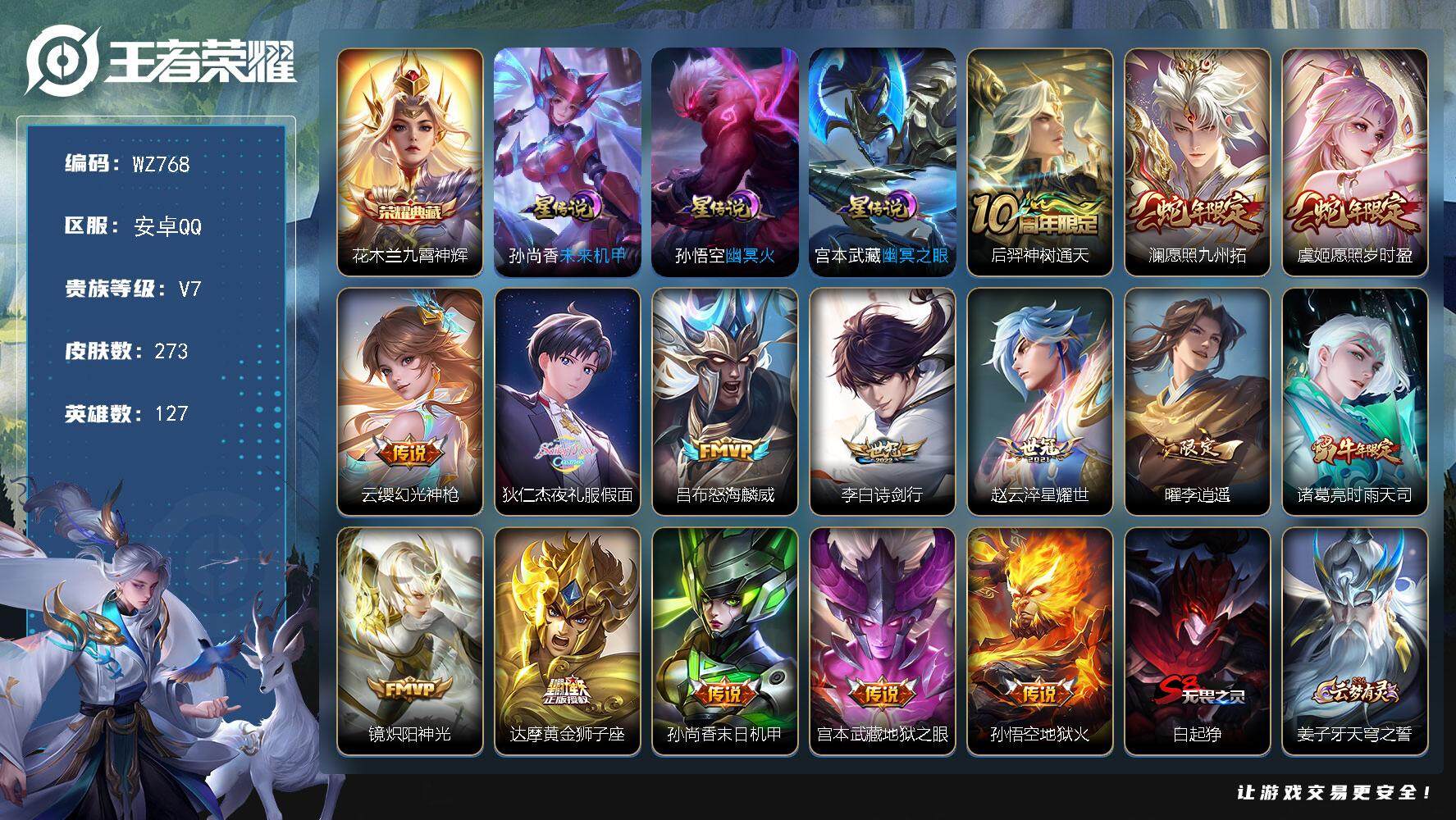 [14742350]安卓q-v7-最强王者段位-127英雄-273皮肤-1典藏皮肤-15传说-72史诗 【荣耀典藏】:花木兰九霄神辉 【传说皮肤】:后羿神树通天,澜愿照九州拓,虞姬愿照岁时盈,云缨幻光神呛,狄仁杰夜礼服假面,吕布怒海麟威,李白诗剑行,赵云淬星耀世,曜李 ,诸葛亮时雨天司,镜炽阳神光,达摩黄金狮子座,孙尚香末日机甲,宫本武藏地狱之眼,孙悟空地狱火 【限定皮肤】:白起狰,姜子牙天穹之誓,狄仁杰阴阳师,虞姬凯尔特女王,赵云皇家上将,孙尚香蔷薇恋人,庄周蜃楼王,庄周高山流水,高渐离玩趣恶龙,孙膑妖精王,扁鹊炼金王,芈月重明,元歌无心,夏侯惇朔风刀,曹操烛龙,典韦穷奇,典韦蓝屏警告,马可波罗山海玄木吟,狄仁杰魔术师,狄仁杰万华元夜,达摩沙漠行僧,项羽海滩派对,老夫子醍醐杖,程咬金演武夺筹,韩信飞衡,兰陵王金庭之子,亚瑟狮心王,孙悟空大圣娶亲,孙悟空孙行者,牛魔御旌,李元芳云中旅人,钟馗驱傩正仪,杨玉环遇见飞天,女娲朔望之晖,雅典娜黎明之约,太乙真人饕餮,鬼谷子原初探秘者,鬼谷子五谷丰年,诸葛亮时雨天司,苏烈千军破阵,百里玄策原初追逐者,弈星混沌棋,梦奇顽趣,沈梦溪大漠名商,明世隐疑决卦,裴擒虎李小龙,裴擒虎擒涛扼浪,狂铁御狮,米莱狄御霄,云中君纤云弄巧,盾山御銮,上官婉儿梁祝,上官婉儿天狼绘梦者,嫦娥拒霜思,曜李 ,西施玲珑珍味,鲁班大师探海日志,桑启海盐诗旅,戈娅驭风魔法,艾琳流音漫舞,司空震地狱燃心,阿古朵江河有灵,张良古海寻踪,狄仁杰夜礼服假面,蒙犽百解令,蒙恬荣光圣徽,鬼谷子天穹祈灯,伽罗琥珀纪元,沈梦溪龙舞盛年,刘邦剑破天穹,程咬金群星魔术团 【年限皮肤】:诸葛亮时雨天司,韩信飞衡,马超神威,马可波罗山海玄木吟 【赛季限定】:庄周蜃楼王,孙膑妖精王,扁鹊炼金王,白起狰,芈月重明,夏侯惇朔风刀,曹操烛龙,典韦穷奇,狄仁杰万华元夜,达摩沙漠行僧,老夫子醍醐杖,程咬金演武夺筹,兰陵王金庭之子,张良古海寻踪,亚瑟狮心王,牛魔御旌,李元芳云中旅人,虞姬凯尔特女王,钟馗驱傩正仪,雅典娜黎明之约,太乙真人饕餮,鬼谷子原初探秘者,苏烈千军破阵,百里玄策原初追逐者,弈星混沌棋,梦奇顽趣,沈梦溪大漠名商,明世隐疑决卦,裴擒虎擒涛扼浪,狂铁御狮,米莱狄御霄,盾山御銮,鲁班大师探海日志,桑启海盐诗旅,鬼谷子天穹祈灯,蒙恬荣光圣徽,刘邦剑破天穹,姜子牙天穹之誓 【战令限定】:典韦蓝屏警