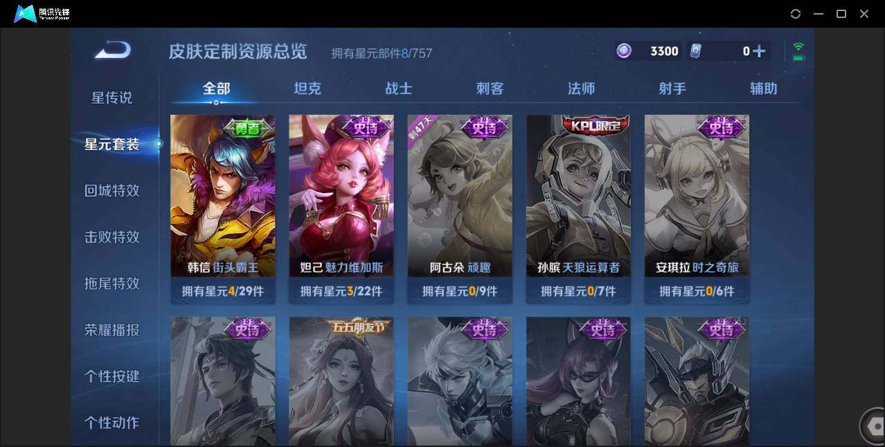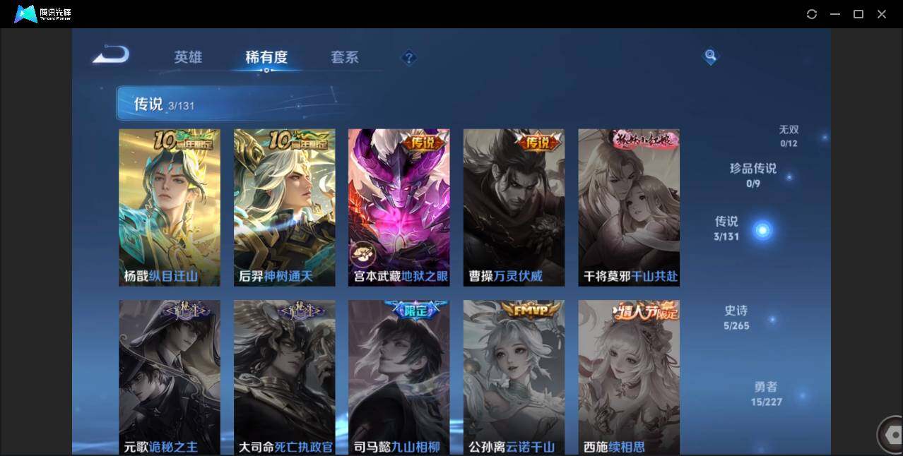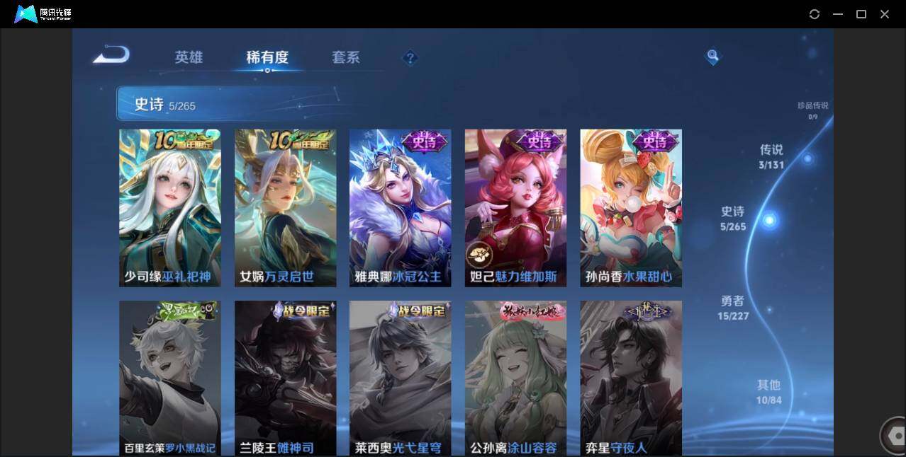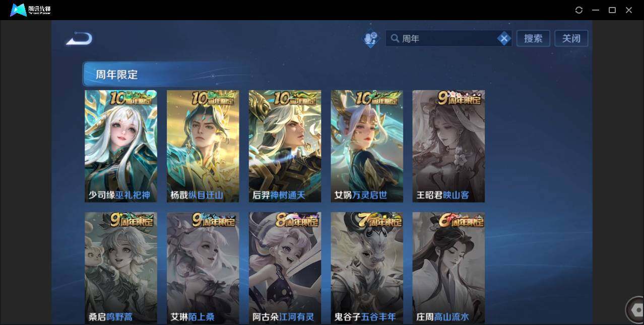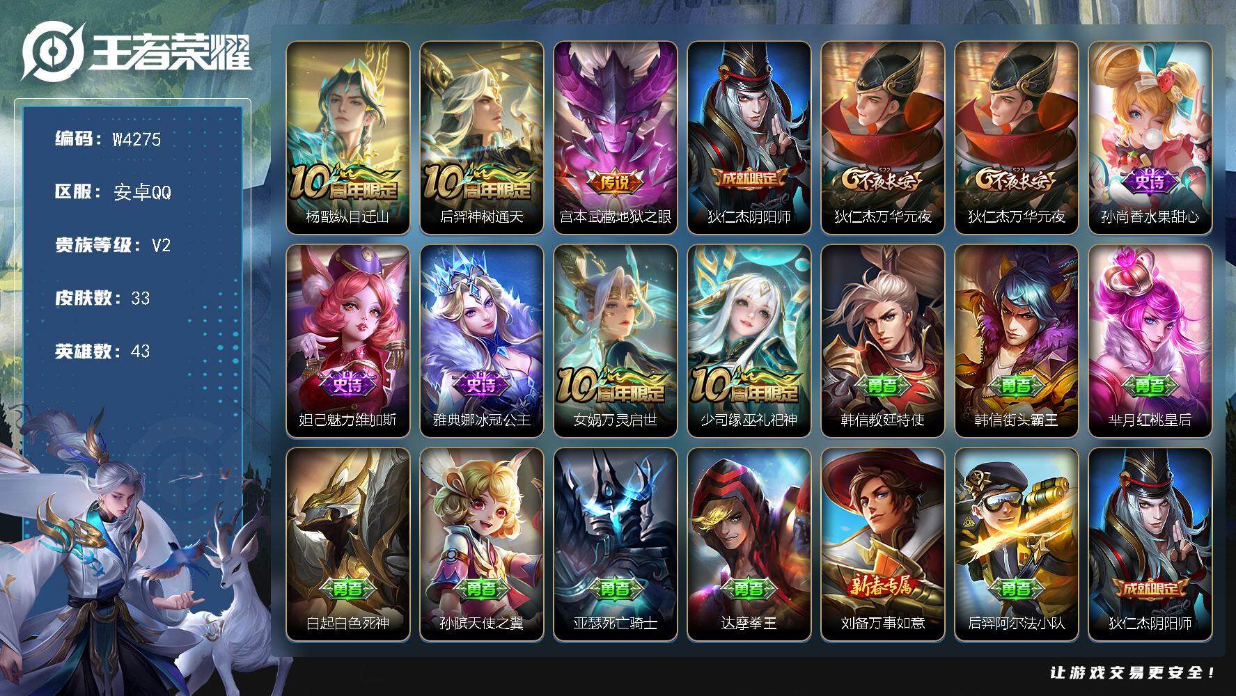 43英雄-33皮肤-【w4275】账号限制-满十周年限定套-安卓q区-无二次-贵3-43英雄-33皮肤-3传说-5史诗-9限定-3300星币-2按键-纵目迁山/地狱之眼/神树通天/巫礼祀神/万灵启示/水果甜心-贵族积分1050-营地id: