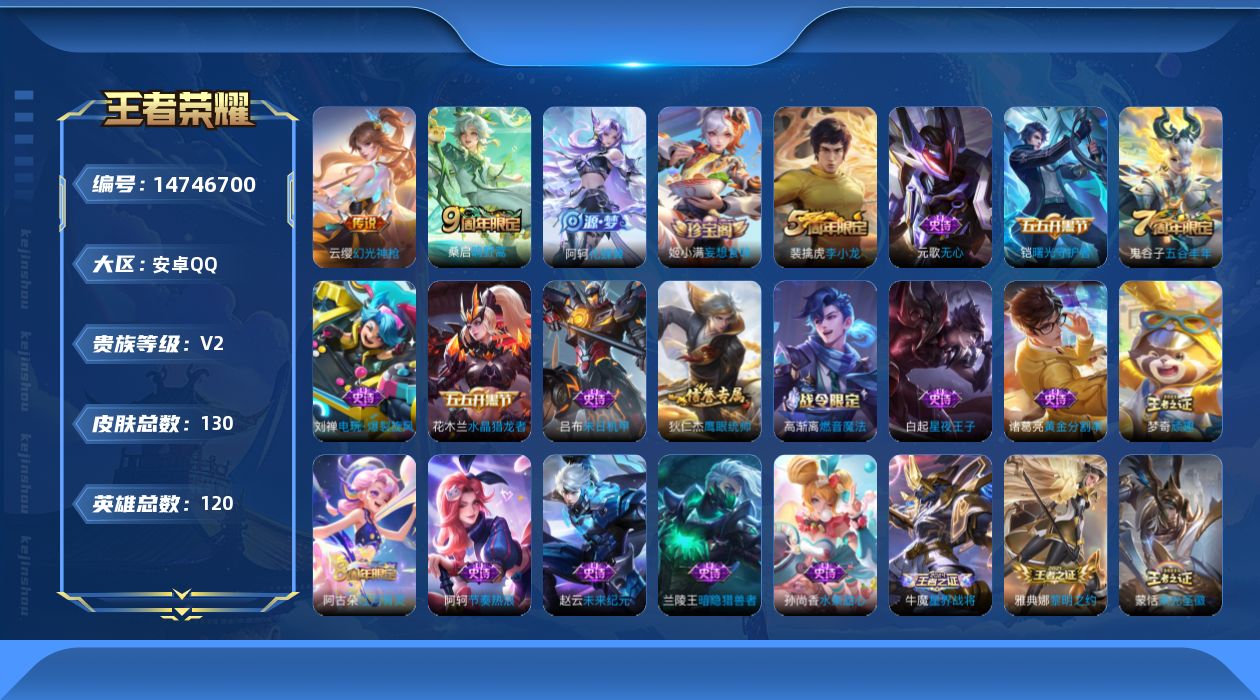 [14746700]v2-至尊星耀iv段位-119英雄-130皮肤-2传说-31史诗 me1476 【内测皮肤】:狂铁特工战影 【传说皮肤】:桑启鸣野蒿,云缨幻光神呛 【限定皮肤】:姜子牙天穹之誓,狄仁杰阴阳师,元歌无心,达摩沙漠行僧,项羽海滩派对,兰陵王金庭之子,李元芳云中旅人,雅典娜黎明之约,鬼谷子五谷丰年,梦奇顽趣,沈梦溪大漠名商,裴擒虎李小龙,裴擒虎擒涛扼浪,鲁班大师探海日志,桑启海盐诗旅,阿古朵江河有灵,张良古海寻踪,蒙犽百解令,蒙恬荣光圣徽,高渐离燃音魔法,妲己灵卜魔法,鬼谷子天穹祈灯,姬小满妄想食味,刘邦剑破天穹,程咬金群星魔术团,周瑜熔金海岸 【赛季限定】:达摩沙漠行僧,兰陵王金庭之子,张良古海寻踪,李元芳云中旅人,雅典娜黎明之约,梦奇顽趣,沈梦溪大漠名商,裴擒虎擒涛扼浪,鲁班大师探海日志,桑启海盐诗旅,鬼谷子天穹祈灯,蒙恬荣光圣徽,刘邦剑破天穹,姜子牙天穹之誓 【战令限定】:高渐离燃音魔法,妲己灵卜魔法 【史诗皮肤】:赵云未来纪元,貂蝉圣诞恋歌,廉颇地狱岩魂,宫本武藏鬼剑武藏,孙尚香水果甜心,妲己魅力维加斯,墨子金属风暴,刘禅绅士熊喵,吕布末日机甲,花木兰水晶猎龙者,兰陵王暗隐猎兽者,诸葛亮黄金分割率,雅典娜冰冠公主,铠曙光守护者,程咬金功夫厨神,白起星夜王子,阿轲节奏热浪,狄仁杰鹰眼统帅,裴擒虎李小龙,雅典娜黎明之约,鬼谷子五谷丰年,元歌无心,梦奇顽趣,刘禅电玩爆裂旋风,阿古朵江河有灵,蒙犽百解令,妲己灵卜魔法,高渐离燃音魔法,蒙恬荣光圣徽,姬小满妄想食味,牛魔星界战将,阿轲化蝶舞 【其他皮肤】:项羽海滩派对,韩信教廷特使,韩信街头霸王,达摩大发明家,赵云白执事,赵云忍炎影,芈月红桃皇后,白起白色死神,宫本武藏未来纪元,妲己少女阿狸,典韦黄金武士,亚瑟死亡骑士,花木兰兔女郎,后羿阿尔法小队,狄仁杰阴阳师,刘备纽约教父,刘备汉昭烈帝,王昭君幻想奇妙夜,狂铁命运角斗场,老夫子功夫老勺,孙尚香沉稳之力,诸葛亮掌控之力,李白敏锐之力,鬼谷子幻乐之宴,大乔守护之力,沈梦溪鲨炮海盗猫,哪吒次元突破,狂铁特工战影,鲁班大师乓乓大师,达摩沙漠行僧,程咬金无双福将,刘邦虎啸剑宗,兰陵王金庭之子,沈梦溪大漠名商,蒙恬蔚蓝守将,李元芳云中旅人,桑启海盐诗旅,猪八戒潮玩探月行,白起乐园追猎者,赵怀真太极少年,裴擒虎擒涛扼浪,太乙真人劲辣红锅,莱西奥西部游侠,鲁班大师探海日志,姬小满零食