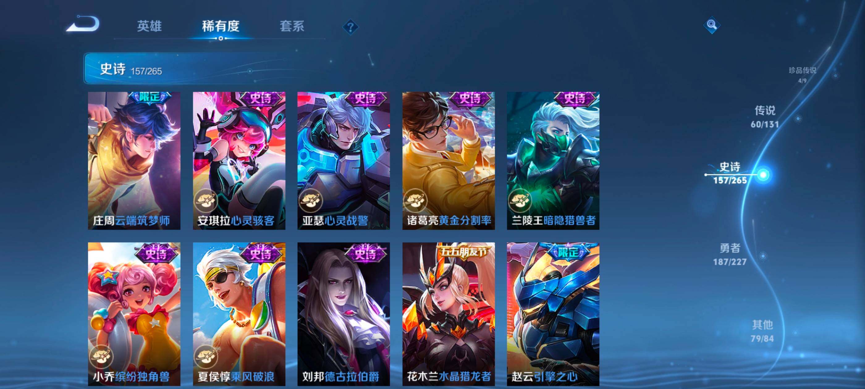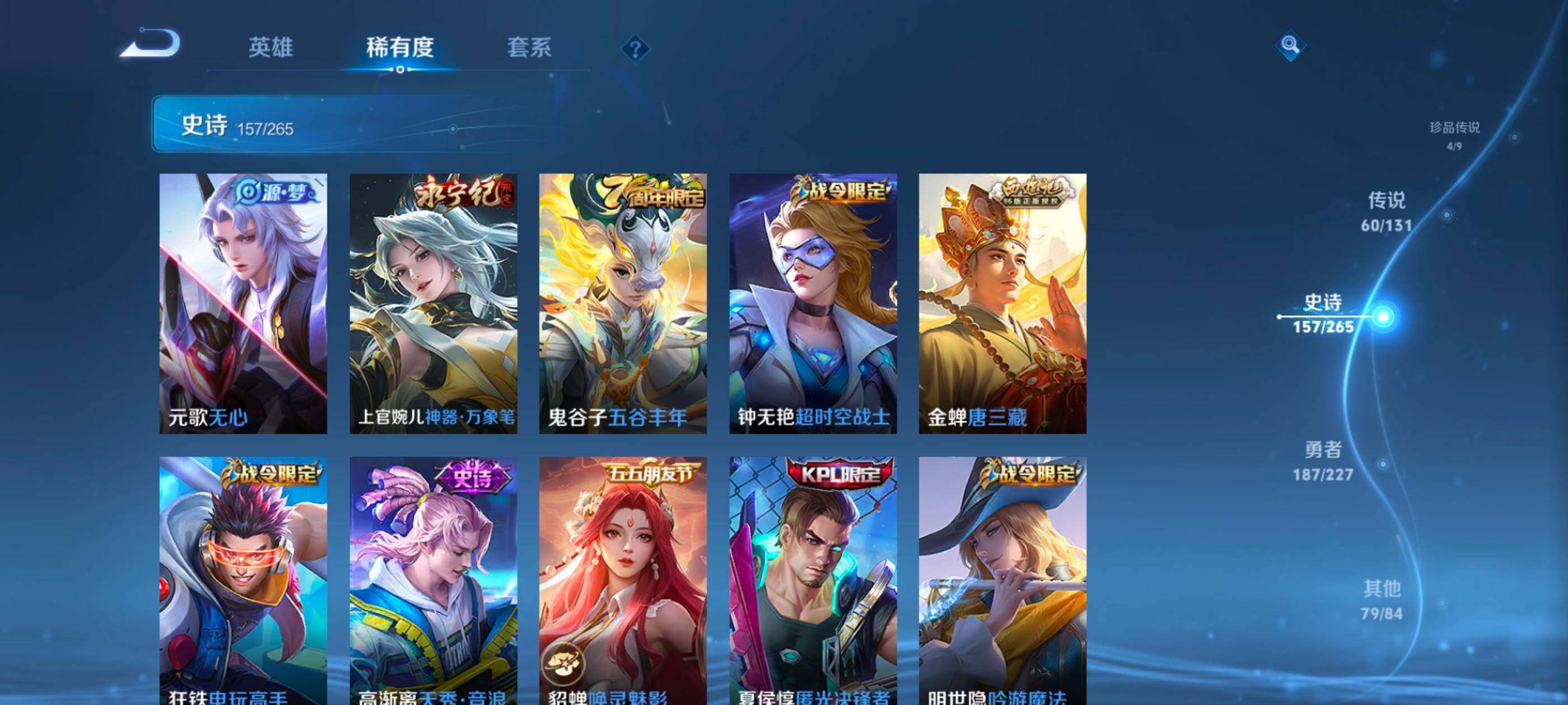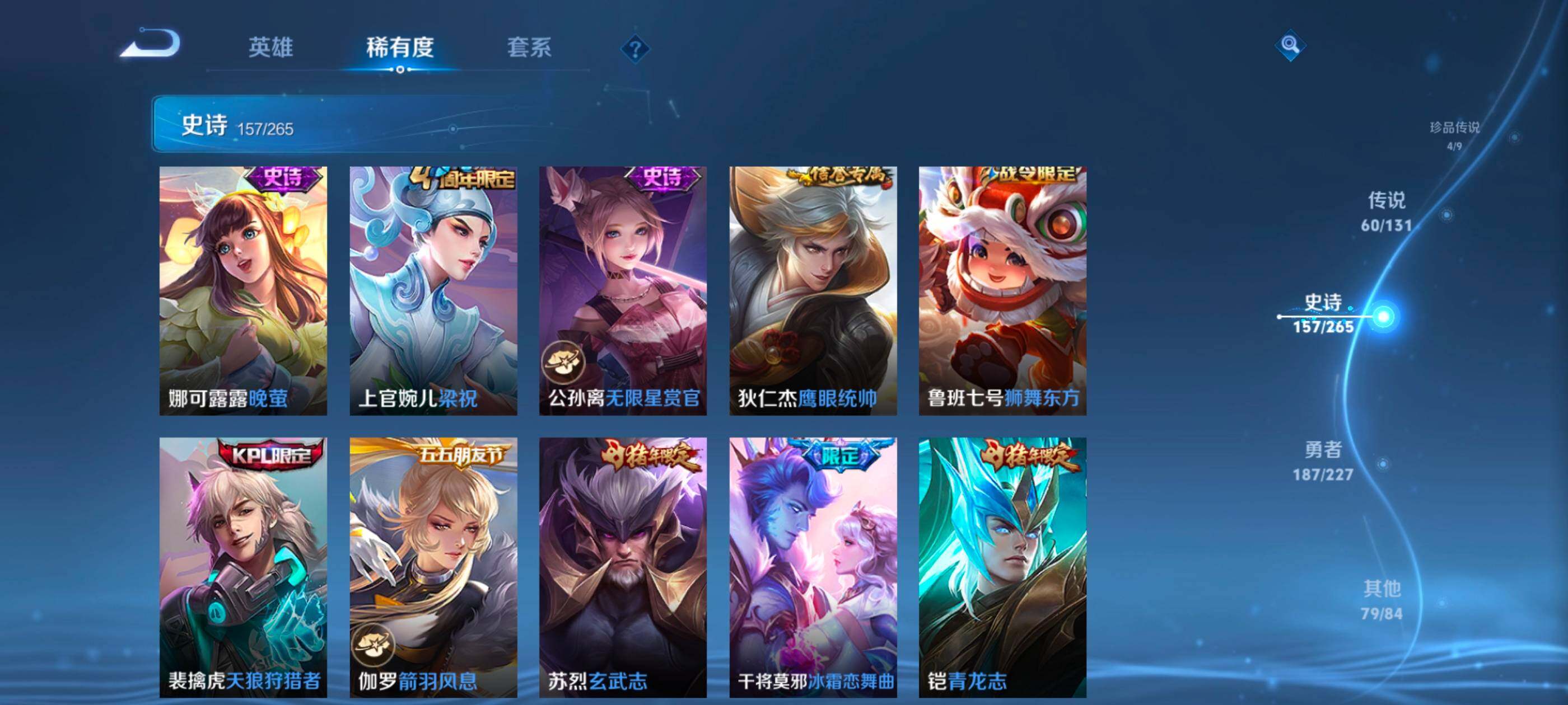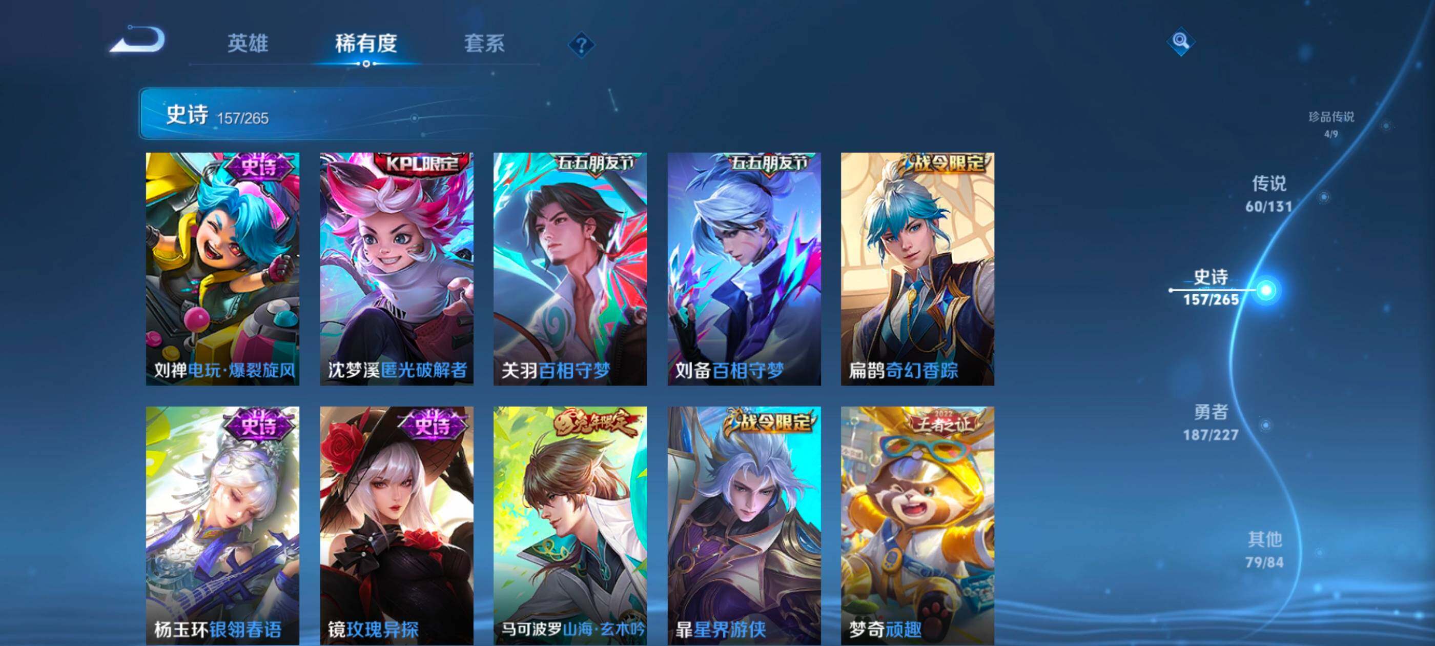 【5无双4珍品5星传说2典藏】v10-最强王者段位-127英雄-494皮肤-2典藏皮肤-5无双-4珍品传说-60传说-157史诗 【英雄全皮】:刘禅全皮,孙权全皮,艾琳全皮,刘备全皮,苍全皮,鬼谷子全皮,铠全皮,苏烈全皮,沈梦溪全皮,马超全皮,蒙恬全皮,镜全皮,夏洛特全皮,司空震全皮,云缨全皮,金蝉全皮,赵怀真全皮,莱西奥全皮,戈娅全皮,空空儿全皮,影全皮 【荣耀典藏】:铠银白咏叹调,伽罗最初的交响 【无双皮肤】:妲己青丘九尾,瑶真我赫兹,小乔时之魔女,曜器灵螭龙剑,铠神罪 【珍品传说】:马可波罗怪盗基德,鲁班七号江户川柯南,孙策时之奇旅,嫦娥器灵落星盏 【传说皮肤】:后羿神树通天,公孙离云诺千山,西施续相思,司空震愿照山河定,女娲愿照千秋盛,妲己愿照众生和,澜愿照九州拓,蔡文姬愿照福禄聚,虞姬愿照岁时盈,云缨幻光神呛,嬴政玄雷天君,桑启鸣野蒿,铠冥王哈迪斯,孙尚香乘龙问璇玑,马超琥珀纪元,铠琥珀纪元,艾琳觅芳踪,云缨鹤归松栖,东皇太一灼幽烈阳,诸葛亮鹤羽星尊,亚瑟追逃游戏,安琪拉追逃游戏,张飞百相守梦,公孙离记忆之芯,夏洛特浮生妄,虞姬无限倾心,项羽无限倾心,孙悟空齐天大圣,吕布怒海麟威,李白诗剑行,不知火舞绯月行,孙尚香音你闪耀,马可波罗深海之息,马超无双飞将,大乔挚爱花嫁,孙策挚爱之约,露娜启示之音,孙策末日机甲,赵云淬星耀世,王昭君乞巧织情,西施游龙清影,周瑜音你心动,小乔音你心动,李元芳飞鸢探春,铠绛天战甲,镜炽阳神光,虞姬启明星使,孙悟空零号赤焰,曜云鹰飞将,李信一念神魔,刘备时之恋人,伽罗太华,张良黄金白羊座,达摩黄金狮子座,后羿黄金射手座,貂蝉仲夏夜之梦,孙尚香末日机甲,宫本武藏地狱之眼,孙悟空地狱火,狄仁杰超时空战士 【限定皮肤】:铠冥王哈迪斯,暃埋骨钱,蒙犽顽岩魄,蔡文姬夏日便利店,大乔绒语心约,虞姬夏日便利店,姜子牙天穹之誓,杨戬破阵退雄兵,李白谪仙醉月,狄仁杰阴阳师,赵云皇家上将,赵云引擎之心,赵云百木心呛,墨子神迹守卫,孙尚香蔷薇恋人,鲁班七号狮舞东方,庄周云端筑梦师,钟无艳超时空战士,扁鹊奇幻香踪,白起夜都怪侠,芈月幻夜卜梦,吕布猎兽之王,吕布御风骁将,周瑜赤莲之焰,元歌云间偶戏,元歌无心,夏侯惇匿光决锋者,甄姬落雪兰心,马可波罗暗影游猎,马可波罗深海之息,马可波罗山海玄木吟,狄仁杰魔术师,狄仁杰万华元夜,达摩沙漠行僧,项羽海滩派对,项羽无限倾心,老夫子醍醐杖,老夫子航海奇遇记,关羽百相守梦,安琪拉追逃游戏,程咬金演武夺筹,露娜启示之音,韩信傲雪梅呛,王昭君午后时光,兰陵王金庭之子,不知火舞绯月行,亚瑟追逃游戏,孙悟空美猴王,孙悟空至尊宝,孙悟空零号赤焰,孙悟空齐天大圣,后羿圣弓游侠,刘备百相守梦,张飞百相守梦,李元芳云中旅人,虞姬启明星使,虞姬无限倾心,钟馗驱傩正仪,杨戬潮玩骑兵,女娲朔望之晖,干将莫邪冰霜恋舞曲,干将莫邪真爱魔法,雅典娜黎明之约,鬼谷子原初探秘者,鬼谷子五谷丰年,诸葛亮鹤羽星尊,大乔挚爱花嫁,黄忠火炮绅士,铠青龙志,苏烈玄武志,苏烈千军破阵,百里玄策原初追逐者,弈星混沌棋,梦奇顽趣,沈梦溪星空之诺,沈梦溪大漠名商,沈梦溪匿光破解者,明世隐疑决卦,明世隐吟游魔法,裴擒虎天狼狩猎者,裴擒虎李小龙,裴擒虎擒涛扼浪,狂铁电玩高手,米莱狄胡桃异想国,云中君纤云弄巧,伽罗太华,孙策挚爱之约,猪八戒猪悟能,上官婉儿梁祝,上官婉儿神器万象笔,嫦娥拒霜思,嫦娥暖冬兔眠,西施玲珑珍味,蒙犽狂想玩偶喵,鲁班大师探海日志,镜匿光追影者,桑启海盐诗旅,夏洛特浮生妄,金蝉唐三藏,暃星界游侠,戈娅驭风魔法,艾琳女武神,艾琳流音漫舞,赵怀真鹤归松栖,云缨鹤归松栖,司空震地狱燃心,阿古朵江河有灵,张良古海寻踪,蒙犽百解令,艾琳觅芳踪,蒙恬荣光圣徽,高渐离燃音魔法,妲己灵卜魔法,鬼谷子天穹祈灯,伽罗琥珀纪元,铠琥珀纪元,马超琥珀纪元,小乔时之魔女,孙尚香乘龙问璇玑,沈梦溪龙舞盛年,鲁班七号蔬乡物语,李元芳蔬乡物语,刘邦剑破天穹,程咬金群星魔术团,镜青焰无极,项羽苍威无极,刘备异域游侠,芈月浮光幕影,周瑜熔金海岸 【年限皮肤】:铠青龙志,苏烈玄武志,孙悟空美猴王,吕布御风骁将,伽罗太华,马超神威,马可波罗山海玄木吟,孙尚香乘龙问璇玑 【赛季限定】:狄仁杰万华元夜,达摩沙漠行僧,老夫子醍醐杖,程咬金演武夺筹,兰陵王金庭之子,张良古海寻踪,李元芳云中旅人,钟馗驱傩正仪,雅典娜黎明之约,鬼谷子原初探秘者,苏烈千军破阵,百里玄策原初追逐者,弈星混沌棋,梦奇顽趣,沈梦溪大漠名商,明世隐疑决卦,裴擒虎擒涛扼浪,鲁班大师探海日志,桑启海盐诗旅,鬼谷子天穹祈灯,蒙恬荣光圣徽,刘邦剑破天穹,姜子牙天穹之誓 【战令限定】:墨子神迹守卫,蔡文姬夏日便利店,虞姬夏日便利店,鲁班七号狮舞东方,钟无艳超时空战士,扁鹊奇幻香踪,白起夜都怪侠,芈月幻夜卜梦,吕布猎兽之王,周瑜赤莲之焰,元歌云间偶戏,甄姬落雪兰心,马可波罗暗影游猎,老夫子航海奇遇记,王昭君午后时光,艾琳流音漫舞,后羿圣弓游侠,杨戬潮玩骑兵,女娲朔望之晖,干将莫邪真爱魔法,黄忠火炮绅士,沈梦溪星空之诺,明世隐吟游魔法,狂铁电玩高手,米莱狄胡桃异想国,嫦娥暖冬兔眠,西施玲珑珍味,蒙犽狂想玩偶喵,司空震地狱燃心,暃星界游侠,戈娅驭风魔法,高渐离燃音魔法,妲己灵卜魔法,鲁班七号蔬乡物语,李元芳蔬乡物语,镜青焰无极,项羽