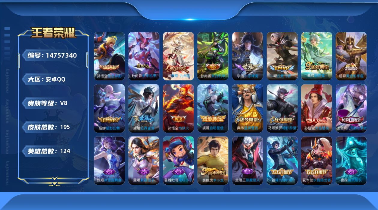[14757340]v8-永恒钻石i段位-124英雄-195皮肤-1典藏-10传说-44史诗,,,sau1095 【荣耀典藏】:孙悟空全息碎影 【传说皮肤】:澜愿照九州拓,桑启鸣野蒿,虞姬启明星使,曜云鹰飞将,李信一念神魔,貂蝉猫影幻舞,虞姬云霓雀翎,后羿黄金射手座,孙尚香末日机甲,孙悟空地狱火 【限定皮肤】:姜子牙天穹之誓,狄仁杰阴阳师,赵云皇家上将,嬴政优雅恋人,嬴政白昼王子,鲁班七号狮舞东方,阿轲迷踪丽影,芈月重明,吕布猎兽之王,周瑜赤莲之焰,夏侯惇朔风刀,典韦穷奇,典韦蓝屏警告,马可波罗暗影游猎,狄仁杰魔术师,狄仁杰万华元夜,项羽海滩派对,老夫子醍醐杖,程咬金演武夺筹,刘邦夺宝奇兵,兰陵王驯魔猎人,孙悟空大圣娶亲,牛魔御旌,李元芳银河之约,虞姬启明星使,钟馗神迹守卫,钟馗驱傩正仪,杨玉环遇见飞天,女娲朔望之晖,雅典娜单词大作战,蔡文姬繁星吟游,鬼谷子原初探秘者,弈星混沌棋,沈梦溪星空之诺,明世隐疑决卦,裴擒虎李小龙,狂铁御狮,云中君纤云弄巧,盾山御銮,猪八戒西部大镖客,上官婉儿梁祝,上官婉儿天狼绘梦者,蒙犽狂想玩偶喵,鬼谷子天穹祈灯,沈梦溪龙舞盛年,鲁班七号蔬乡物语,李元芳蔬乡物语,刘邦剑破天穹,程咬金群星魔术团,周瑜熔金海岸 【赛季限定】:芈月重明,夏侯惇朔风刀,典韦穷奇,狄仁杰万华元夜,老夫子醍醐杖,程咬金演武夺筹,牛魔御旌,钟馗驱傩正仪,鬼谷子原初探秘者,弈星混沌棋,明世隐疑决卦,狂铁御狮,盾山御銮,鬼谷子天穹祈灯,刘邦剑破天穹,姜子牙天穹之誓 【战令限定】:嬴政白昼王子,鲁班七号狮舞东方,阿轲迷踪丽影,吕布猎兽之王,周瑜赤莲之焰,典韦蓝屏警告,马可波罗暗影游猎,刘邦夺宝奇兵,兰陵王驯魔猎人,李元芳银河之约,钟馗神迹守卫,女娲朔望之晖,雅典娜单词大作战,沈梦溪星空之诺,猪八戒西部大镖客,蒙犽狂想玩偶喵,鲁班七号蔬乡物语,李元芳蔬乡物语 【史诗皮肤】:鲁班七号电玩小子,项羽苍穹之光,露娜紫霞仙子,赵云皇家上将,赵云未来纪元,貂蝉圣诞恋歌,甄姬冰雪圆舞曲,狄仁杰魔术师,廉颇地狱岩魂,宫本武藏鬼剑武藏,孙尚香水果甜心,嬴政优雅恋人,嬴政摇滚巨星,妲己魅力维加斯,墨子金属风暴,曹操幽灵船长,韩信白龙吟,花木兰水晶猎龙者,刘邦德古拉伯爵,夏侯惇乘风破浪,雅典娜冰冠公主,安琪拉心灵骇客,铠曙光守护者,刘禅天才门将,程咬金功夫厨神,杨玉环遇见飞天,嬴政白昼王子,孙策猫狗日记,孙悟空大