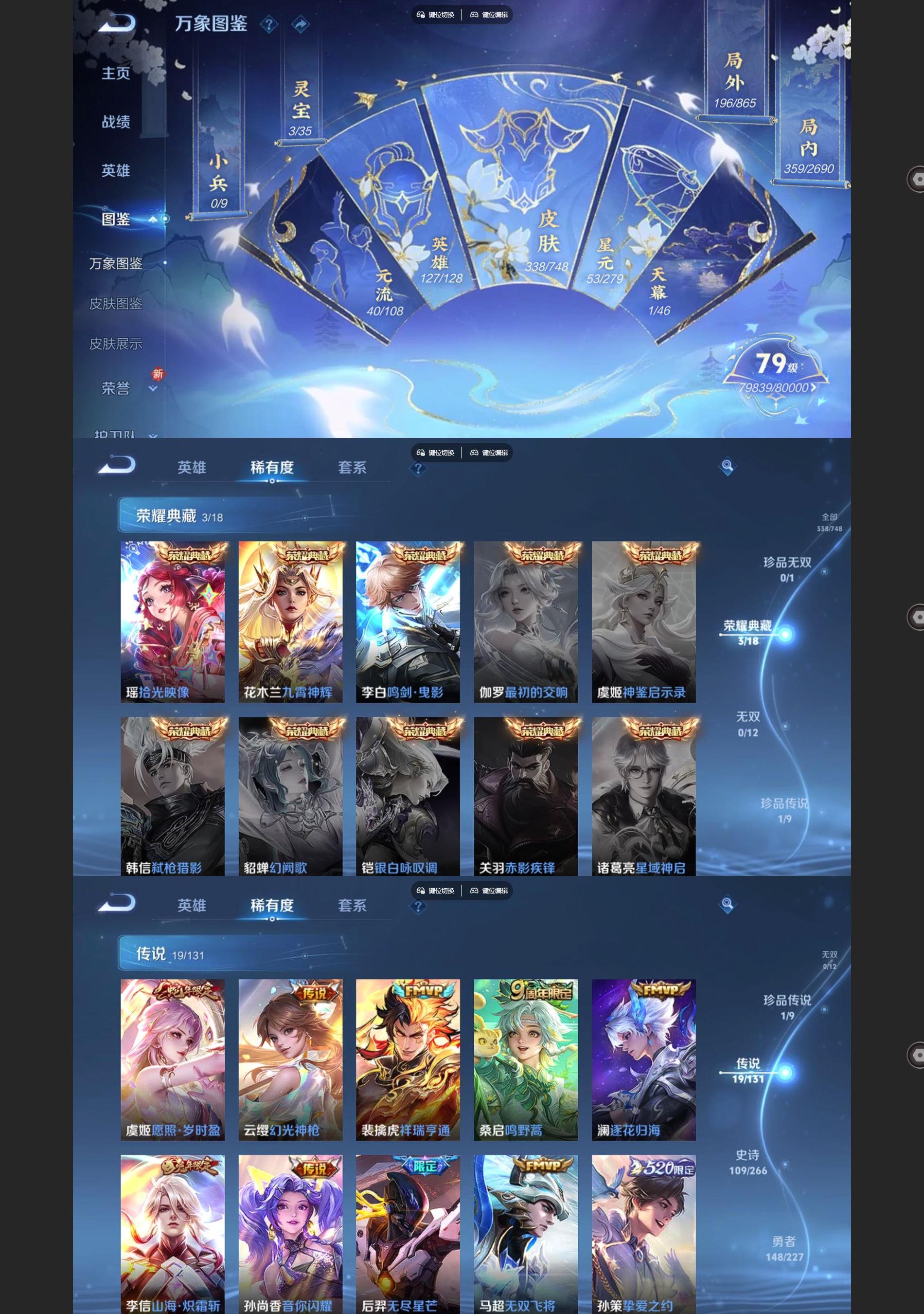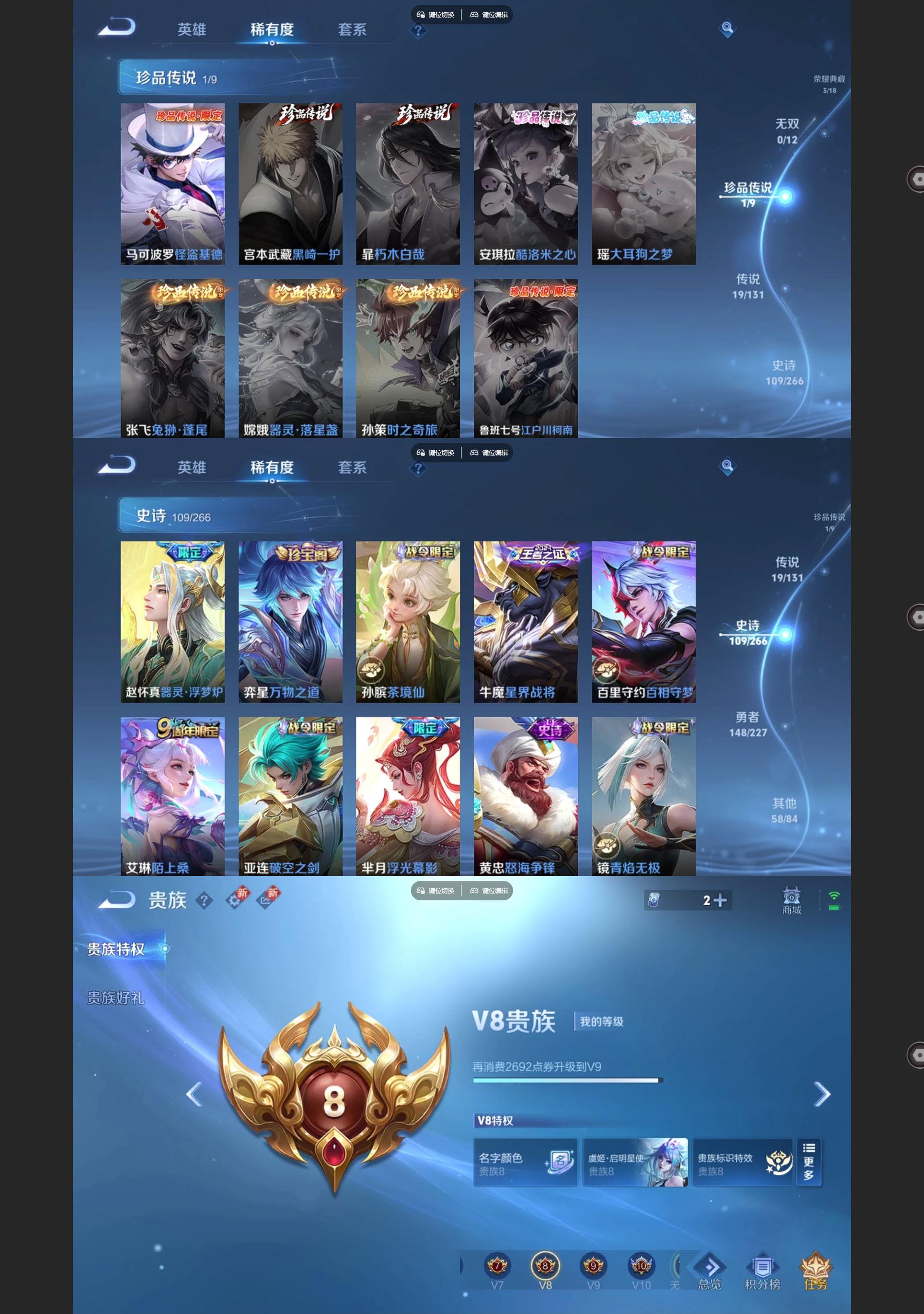 2296323-v8-338皮肤3典藏1珍品传说19传说2星元109史诗121限定 1305紫星币 【全皮英雄】 刘邦全皮 影全皮 【典藏】 拾光映像 鸣剑曳影 九霄神辉 【珍品传说】 怪盗基德 【星元】 幽冥之眼 金色仲夏夜 【传说】 逐花归海 凤求凰 幻光神呛 祥瑞亨通 愿照岁时盈 鸣野蒿 启明星使 山海炽霜斩 李 无尽星芒 挚爱之约 淬星耀世 音你闪耀 无双飞将 炽阳神光