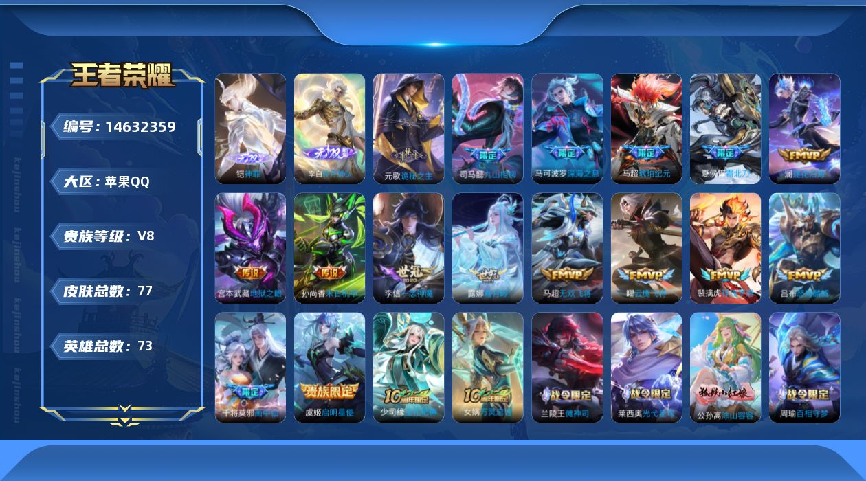 [14632359]多传说 俩无双 苹果q-v8-最强王者段位-70英雄-76皮肤-2无双-19传说-24史诗 【英雄全皮】:孙权全皮 【无双皮肤】:李白碎月剑心,铠神罪 【传说皮肤】:杨戬纵目迁山,后羿神树通天,干将莫邪千山共赴,元歌诡秘之主,司马懿九山相柳,裴擒虎祥瑞亨通,夏侯惇霜北刀,马超琥珀纪元,澜逐花归海,露娜霜月吟,干将莫邪画中仙,吕布怒海麟威,马可波罗深海之息,马超无双飞将,虞姬启明星使,曜云鹰飞将,李信一念神魔,孙尚香末日机甲,宫本武藏地狱之眼 【限定皮肤】:夏侯惇霜北刀,狄仁杰阴阳师,赵云皇家上将,元歌云间偶戏,马可波罗深海之息,狄仁杰魔术师,项羽海滩派对,孙悟空至尊宝,虞姬启明星使,干将莫邪画中仙,李白碎月剑心,马超琥珀纪元,安琪拉乘龙聚宝船 【年限皮肤】:安琪拉乘龙聚宝船 【战令限定】:元歌云间偶戏 【史诗皮肤】:赵云皇家上将,狄仁杰魔术师,廉颇地狱岩魂,宫本武藏鬼剑武藏,孙尚香水果甜心,嬴政摇滚巨星,妲己女仆咖啡,吕布末日机甲,张飞乱世虎臣,孙悟空至尊宝,小乔缤纷独角兽,诸葛亮黄金分割率,阿轲节奏热浪,狄仁杰鹰眼统帅,元歌云间偶戏,杨戬天秀启明,安琪拉乘龙聚宝船,狂铁龙之律动,周瑜百相守梦,公孙离涂山容容,莱西奥光弋星穹,兰陵王傩神司,女娲万灵启世,少司缘巫礼祀神 【其他皮肤】:项羽海滩派对,露娜哥特玫瑰,芈月红桃皇后,白起白色死神,宫本武藏未来纪元,达摩拳王,甄姬花好人间,后羿阿尔法小队,狄仁杰阴阳师,刘备纽约教父,盘古重装意志,妲己紫罗兰之誓,牛魔牛运亨通,甄姬逆浪荇歌,孙策百相守梦,莱西奥踏浪烽翎,亚瑟荣光之誓,明世隐往忆晖光,孙权径山谋武,艾琳鹤鸣心笺,曹操逐霄之志,钟无艳生化警戒,花木兰剑舞者,孙悟空西部大镖客,兰陵王隐刃,李白范海辛,马可波罗激情绿茵,干将莫邪第七人偶,伽罗花见巫女,蒙恬秩序猎龙将 【营地id】:1643137625 【由于赛季三个月更新一次,段位皆有上号为准,对段位有要求这谨慎下单!!!】
