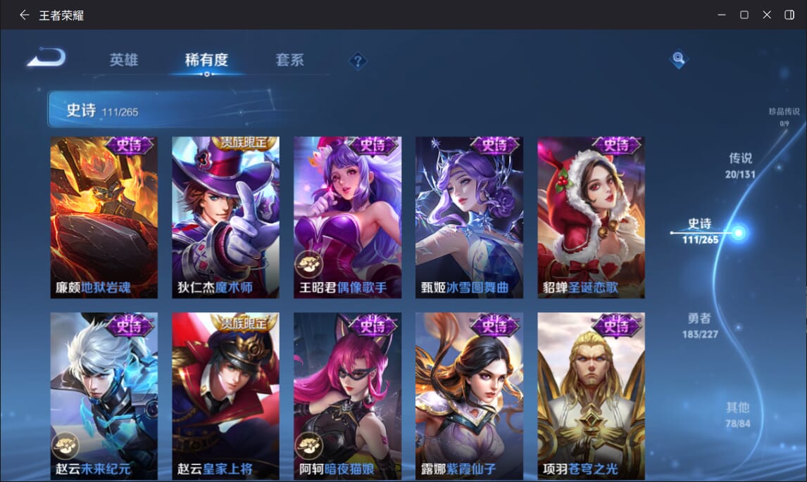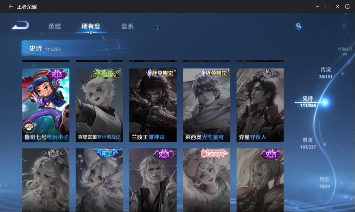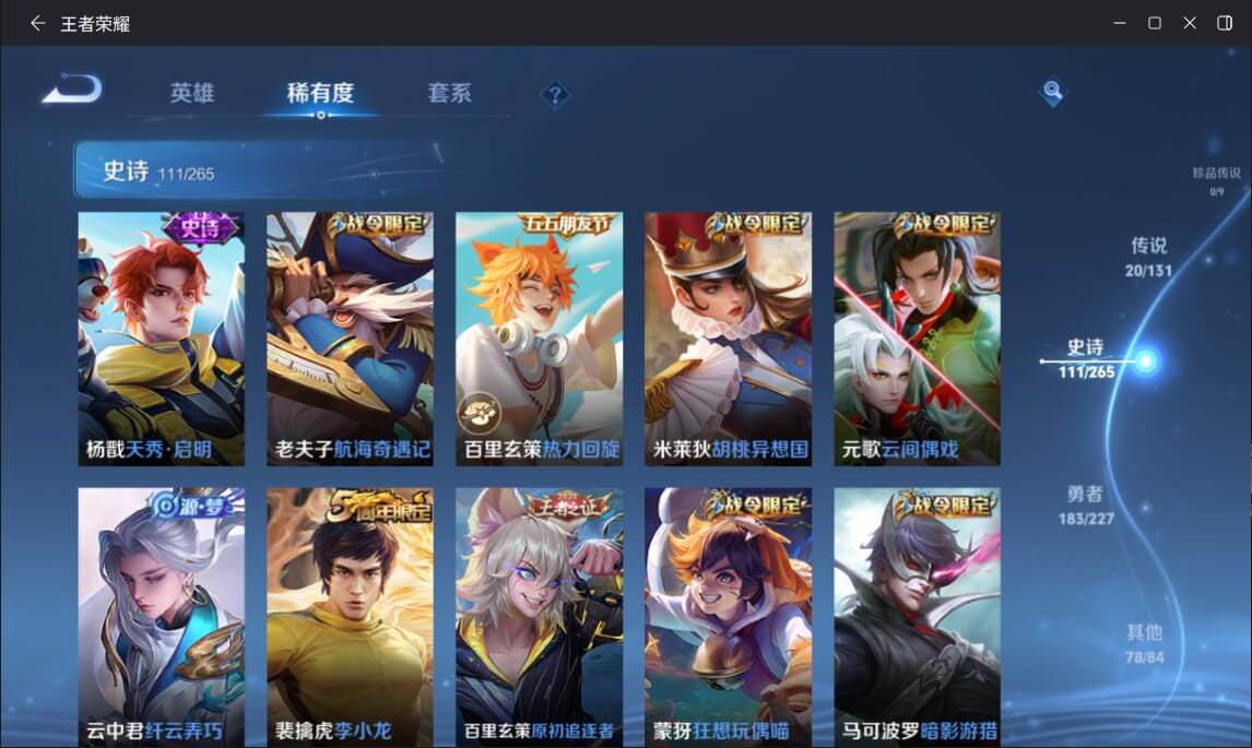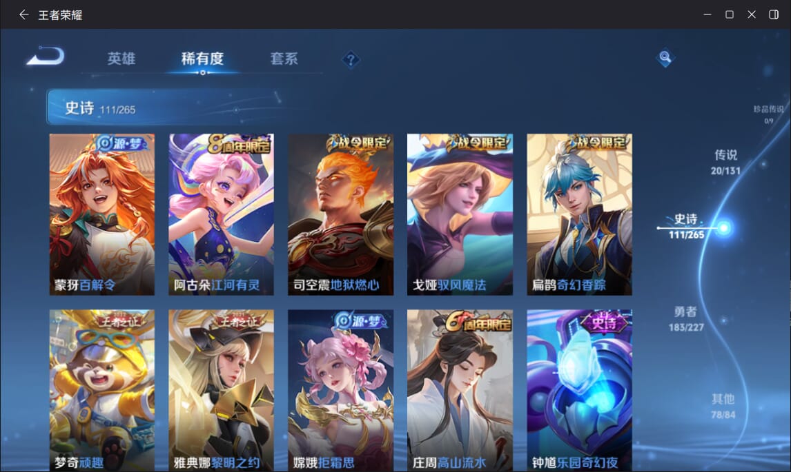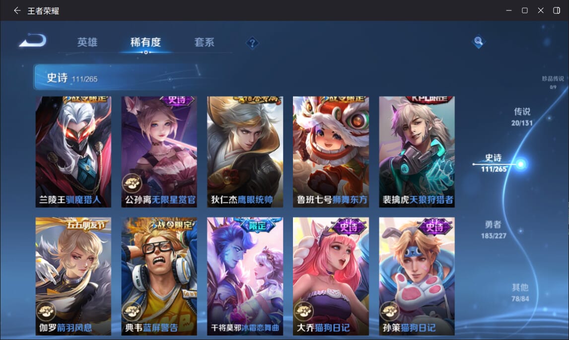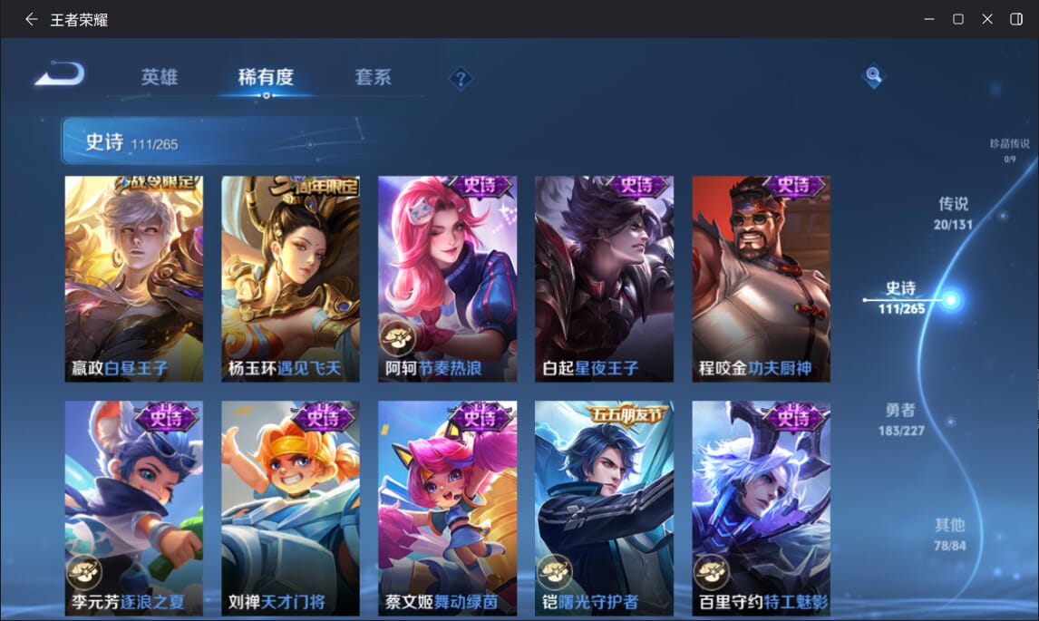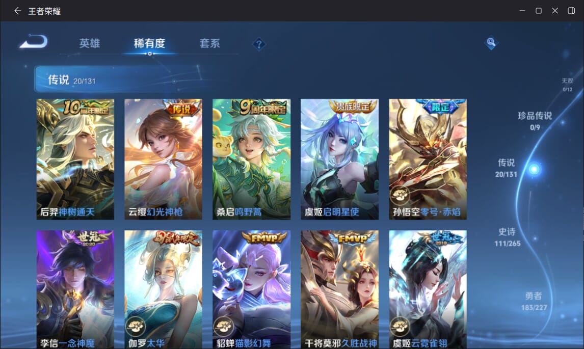 实名: 可修改 英雄数: 127 皮肤数: 393 荣耀水晶: 鸣剑·曳影 传说皮: 黄金射手座猫影幻舞久胜战神一念神魔云霓雀翎末日机甲-孙尚香地狱火仲夏夜之梦零号·赤焰地狱之眼超时空战士-狄仁杰幻光神呛神树通天 限定皮: 遇见飞天李小龙梁祝引擎之心天魔缭乱永曜之星