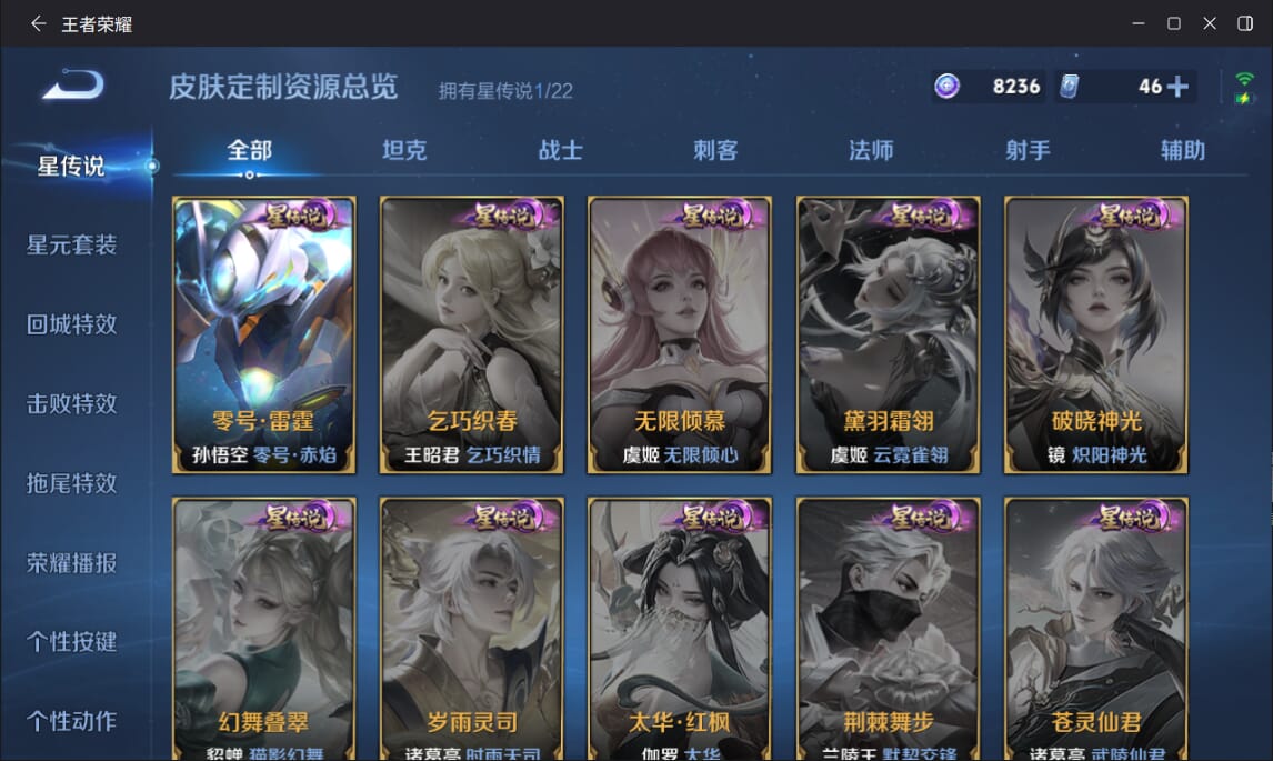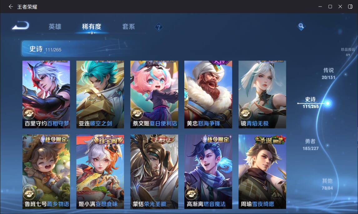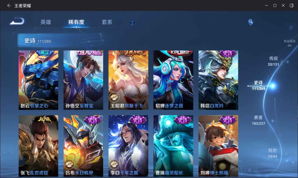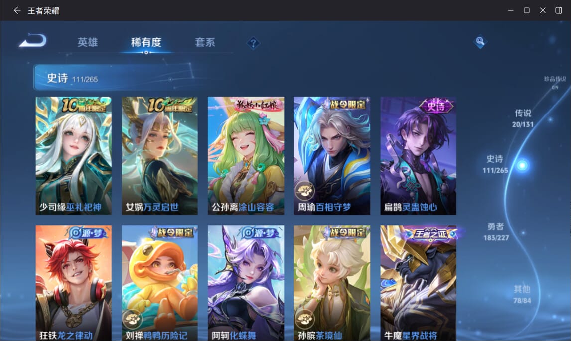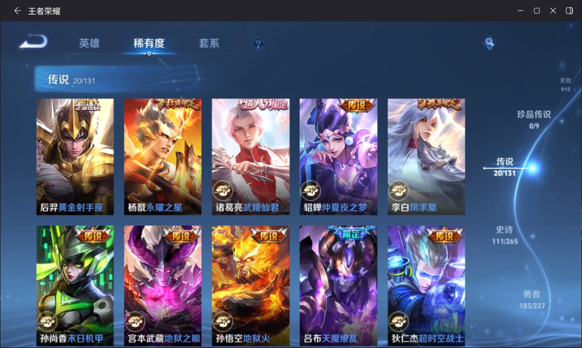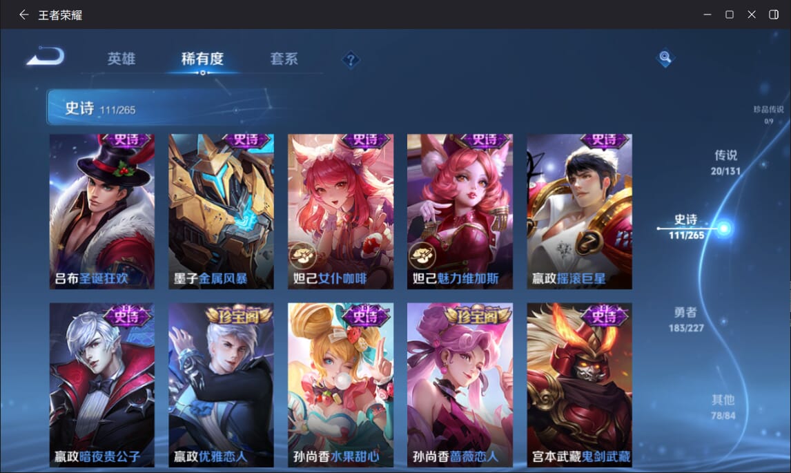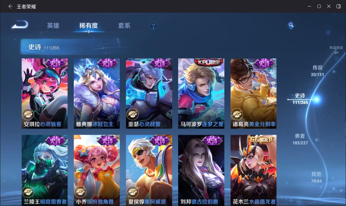 实名: 可修改 英雄数: 127 皮肤数: 393 荣耀水晶: 鸣剑·曳影 传说皮: 黄金射手座猫影幻舞久胜战神一念神魔云霓雀翎末日机甲-孙尚香地狱火仲夏夜之梦零号·赤焰地狱之眼超时空战士-狄仁杰幻光神呛神树通天 限定皮: 遇见飞天李小龙梁祝引擎之心天魔缭乱永曜之星