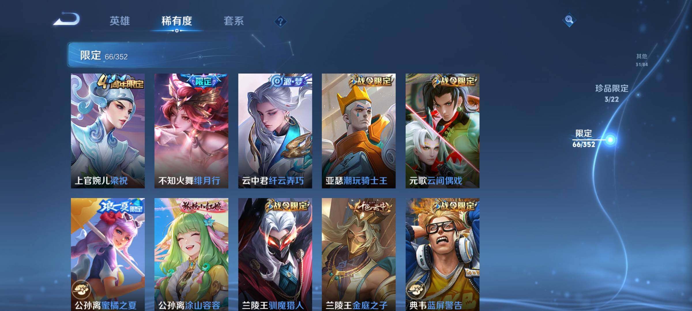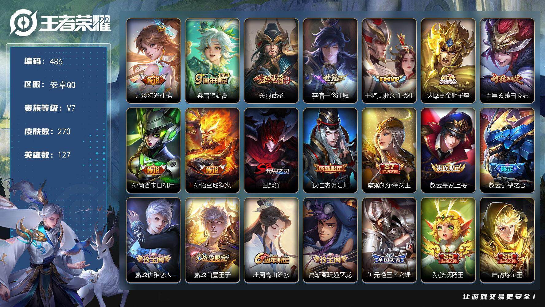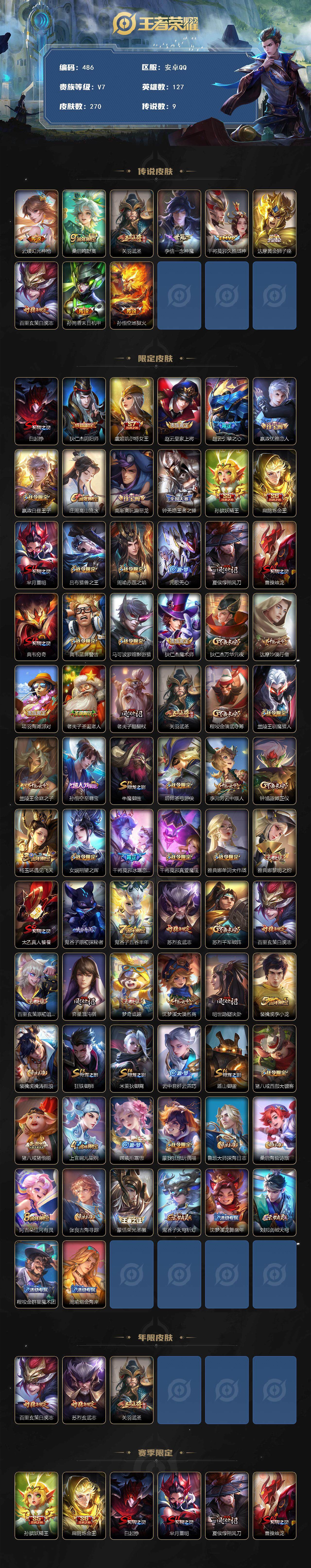 _2319281-q-v7-永恒钻石v段位-127英雄-163皮肤-1典藏皮肤-1无双-2珍品传说-11传说-50史诗 【荣耀典藏】:韩信弑呛猎影 【无双皮肤】:小乔时之魔女 【珍品传说】:马可波罗怪盗基德,鲁班七号江户川柯南 【传说皮肤】:后羿神树通天,女娲愿照千秋盛,李白诗剑行,不知火舞绯月行,西施游龙清影,貂蝉猫影幻舞,张良黄金白羊座,干将莫邪久胜战神,百里玄策白虎志,宫本武藏地狱之眼,狄仁杰超时空战士 【限定皮肤】:狄仁杰阴阳师,赵云皇家上将,赵云引擎之心,妲己时之彼端,嬴政白昼王子,孙尚香蔷薇恋人,鲁班七号狮舞东方,庄周高山流水,吕布猎兽之王,周瑜赤莲之焰,元歌云间偶戏,夏侯惇朔风刀,甄姬游园惊梦,典韦穷奇,典韦蓝屏警告,马可波罗逐梦之星,狄仁杰魔术师,狄仁杰万华元夜,项羽海滩派对,老夫子醍醐杖,程咬金演武夺筹,露娜一生所爱,兰陵王驯魔猎人,兰陵王金庭之子,不知火舞绯月行,亚瑟潮玩骑士王,牛魔御旌,后羿如梦令,李元芳云中旅人,钟馗神迹守卫,钟馗驱傩正仪,杨玉环遇见飞天,女娲朔望之晖,干将莫邪冰霜恋舞曲,蔡文姬奇迹圣诞,蔡文姬繁星吟游,鬼谷子原初探秘者,苏烈千军破阵,百里玄策白虎志,弈星混沌棋,公孙离蜜橘之夏,沈梦溪大漠名商,明世隐疑决卦,裴擒虎李小龙,狂铁御狮,米莱狄御霄,云中君纤云弄巧,盾山御銮,上官婉儿梁祝,嫦娥拒霜思,张良古海寻踪,鬼谷子天穹祈灯,小乔时之魔女,刘邦剑破天穹,镜青焰无极,项羽苍威无极 【年限皮肤】:百里玄策白虎志 【赛季限定】:夏侯惇朔风刀,典韦穷奇,狄仁杰万华元夜,老夫子醍醐杖,程咬金演武夺筹,兰陵王金庭之子,张良古海寻踪,牛魔御旌,李元芳云中旅人,钟馗驱傩正仪,鬼谷子原初探秘者,苏烈千军破阵,弈星混沌棋,沈梦溪大漠名商,明世隐疑决卦,狂铁御狮,米莱狄御霄,盾山御銮,鬼谷子天穹祈灯,刘邦剑破天穹 【战令限定】:嬴政白昼王子,鲁班七号狮舞东方,吕布猎兽之王,周瑜赤莲之焰,元歌云间偶戏,典韦蓝屏警告,兰陵王驯魔猎人,亚瑟潮玩骑士王,钟馗神迹守卫,女娲朔望之晖,镜青焰无极,项羽苍威无极 【史诗皮肤】:赵云皇家上将,貂蝉圣诞恋歌,甄姬冰雪圆舞曲,王昭君偶像歌手,狄仁杰魔术师,宫本武藏鬼剑武藏,孙尚香蔷薇恋人,孙尚香水果甜心,妲己魅力维加斯,李白千年之狐,吕布末日机甲,张飞乱世虎臣,赵云引擎之心,小乔缤纷独角兽,兰陵王暗隐猎兽者,诸葛亮黄金分割率,甄姬游