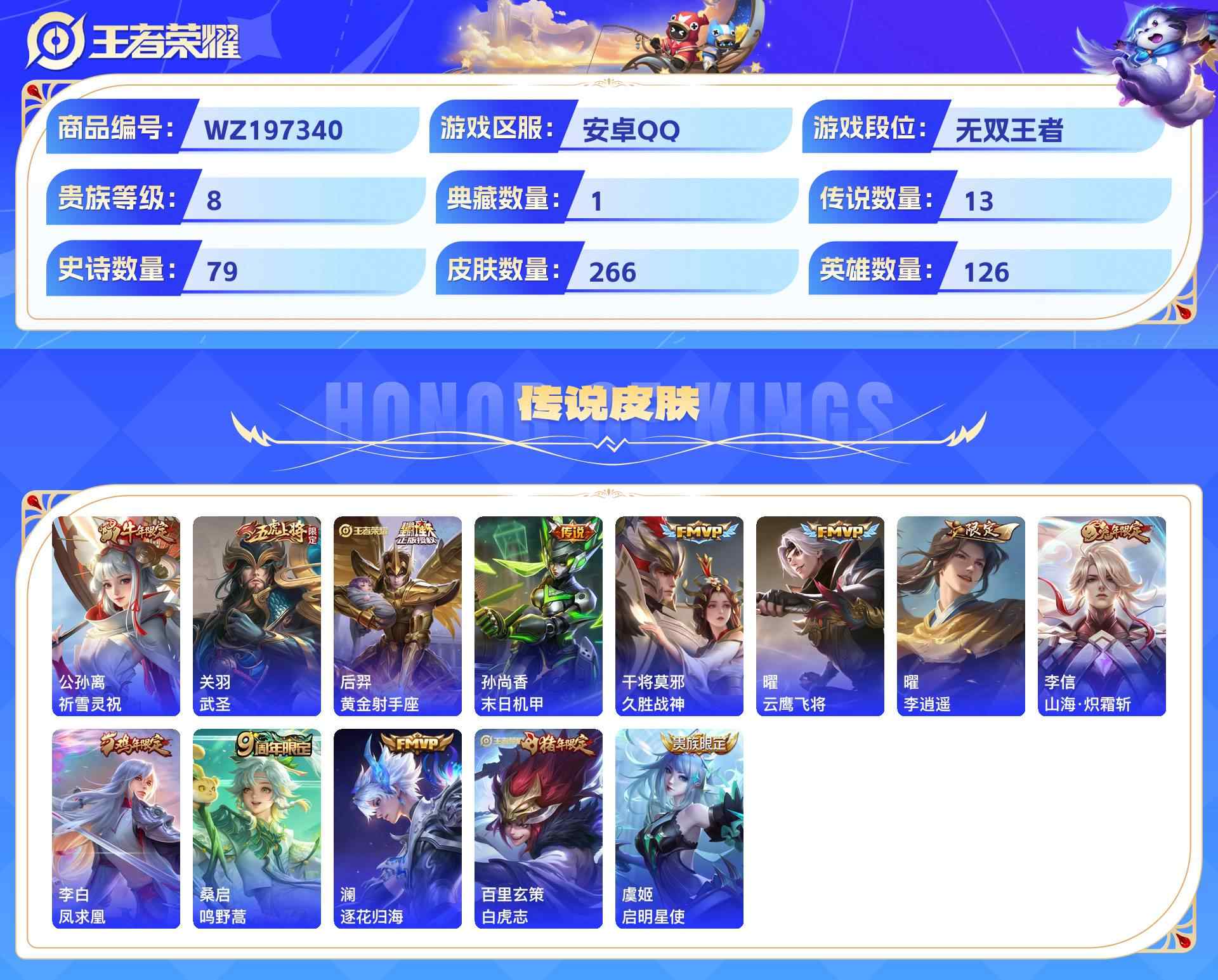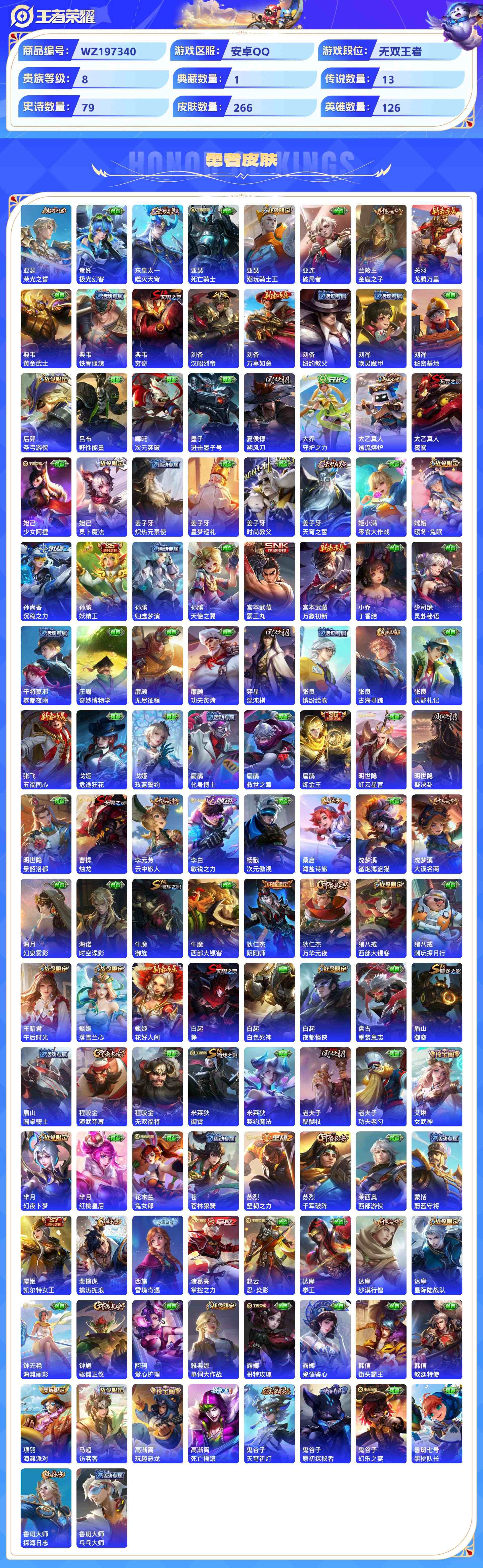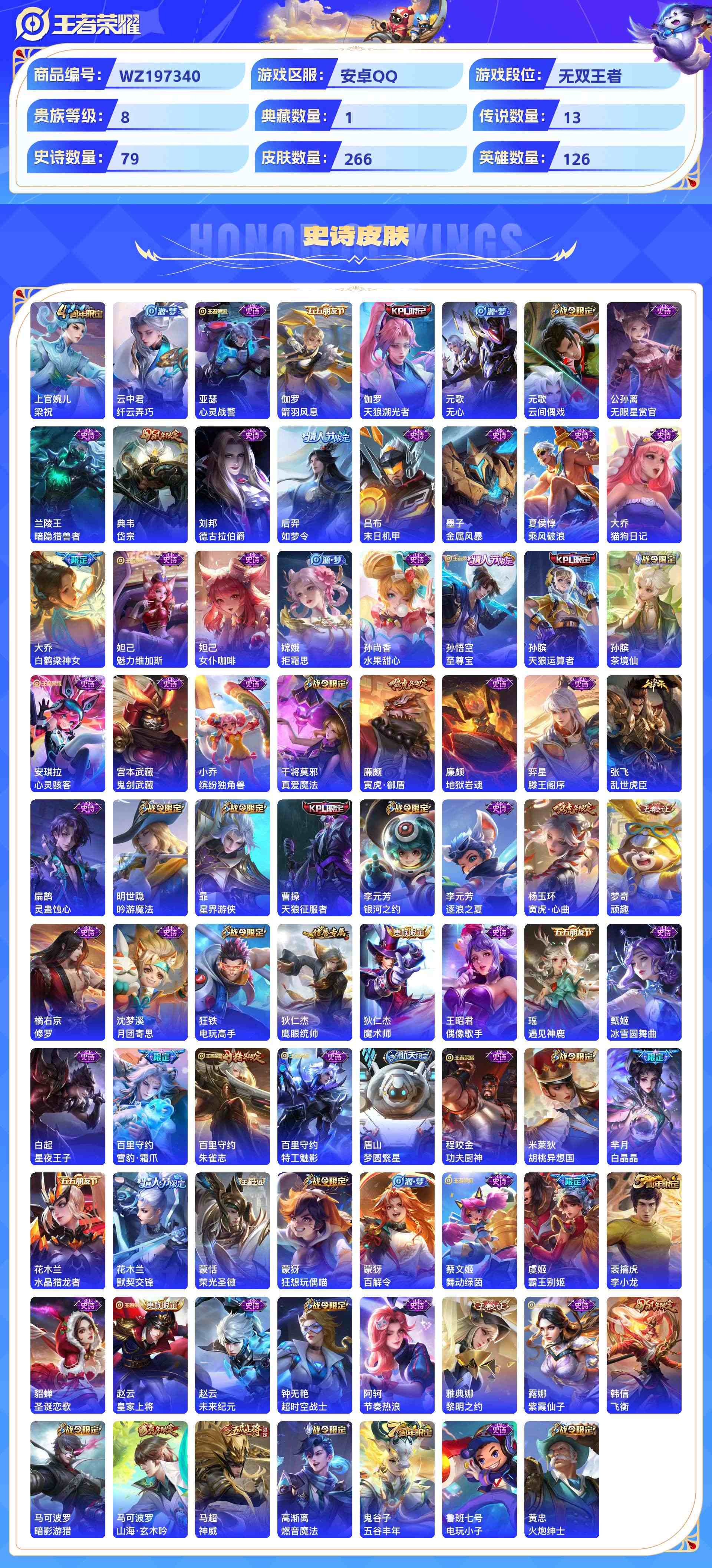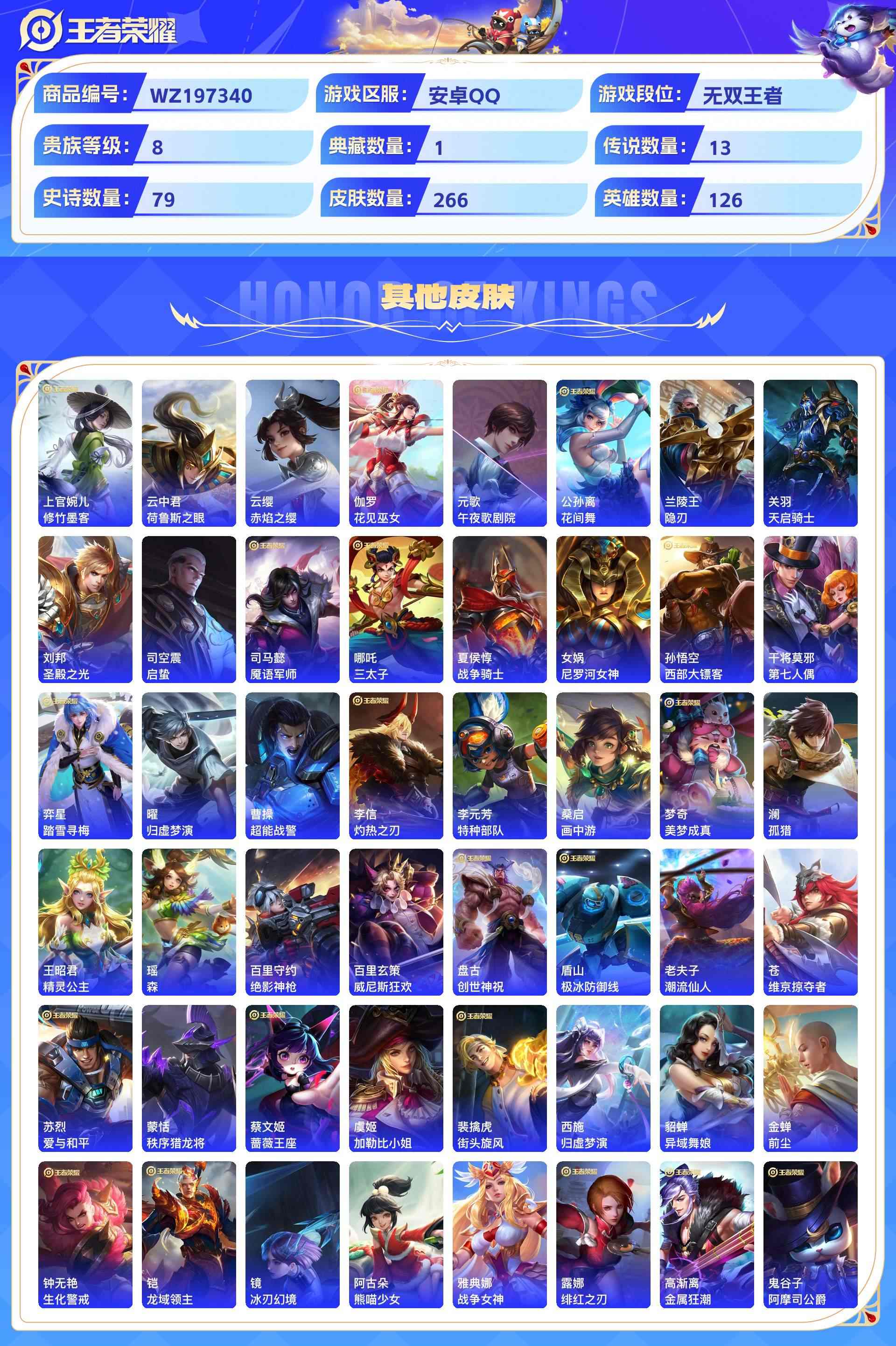 wz197340|精品号可二次安卓qq 贵族8级 266皮 1典藏 (幻阙歌)1珍品传说(器灵·落星盏)2无双(器灵·螭龙剑真我赫兹) 13传说(祈雪灵祝武圣黄金射手座末日机甲久胜战神云鹰飞将李)79史诗1星传说8个性按键1天幕