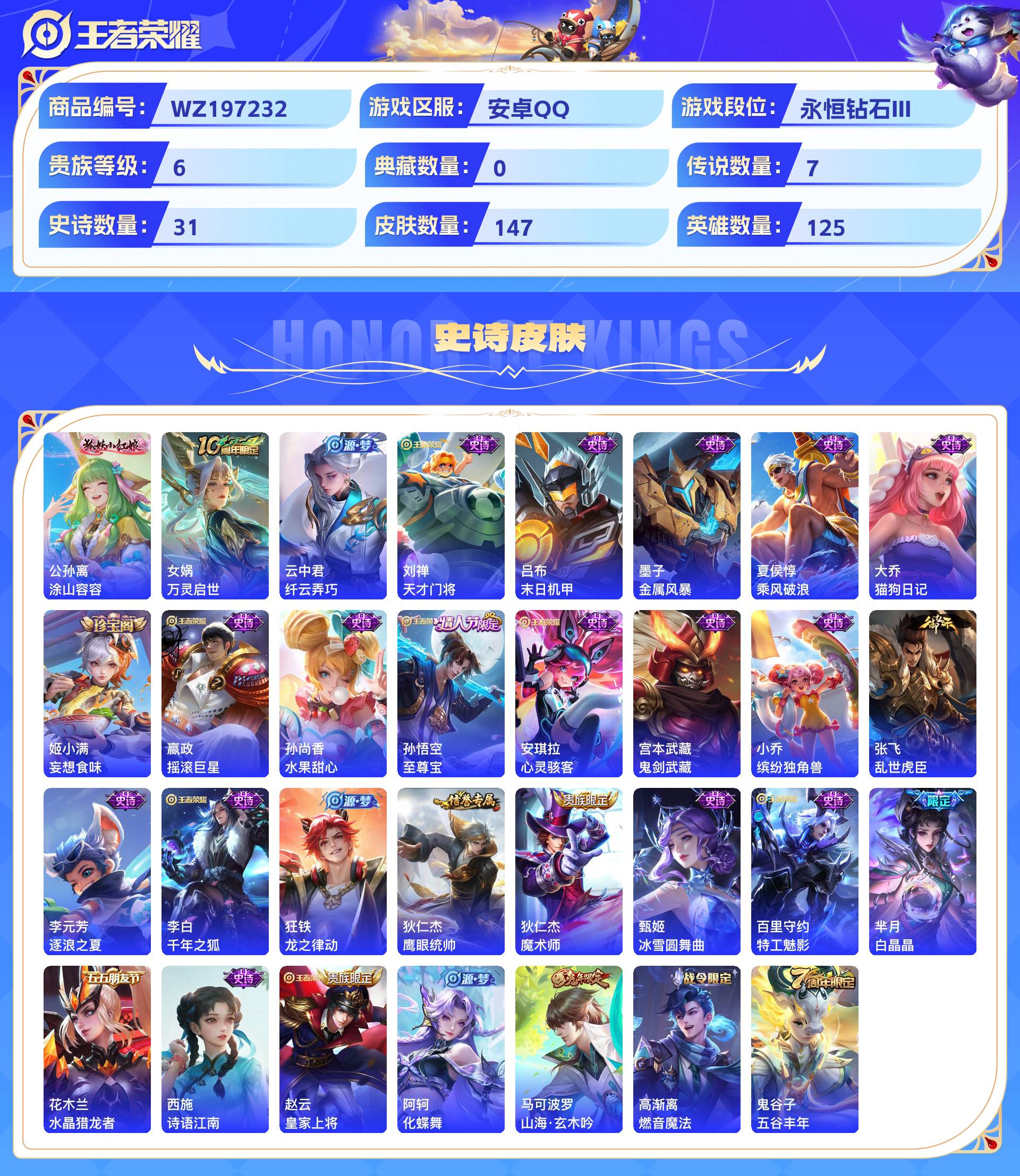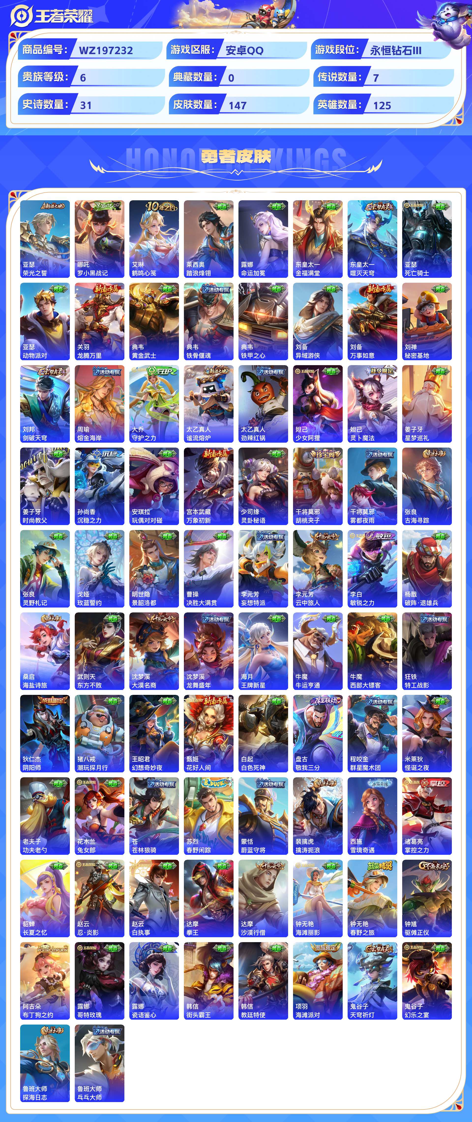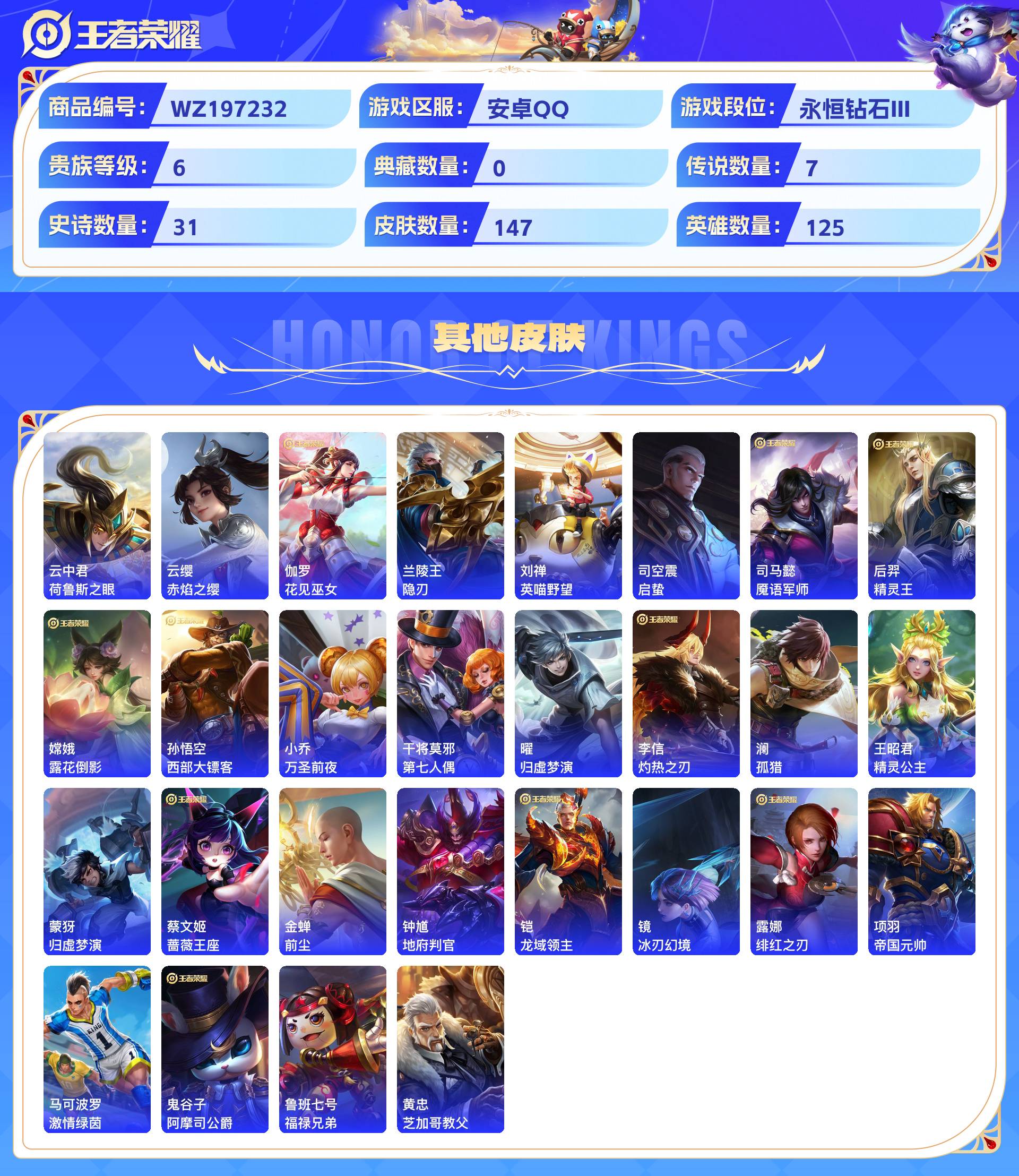 _2319298-安卓qq147皮贵族6级7传说31史诗【传说皮肤】千山共赴黄金射手座愿照·众生和乘龙·问璇玑地狱之眼鸣野蒿愿照·九州拓【史诗皮肤】涂山容容万灵启世纤云弄巧天才门将末日机甲金属风暴乘风破浪猫狗日记妄想食味摇滚巨星水果甜心至尊宝心灵骇客鬼剑武藏缤纷独角兽乱世虎臣逐浪之夏千年之狐龙之律动鹰眼统帅魔术师冰雪圆舞曲特工魅影白晶晶水晶猎龙者诗语江南皇家上将化蝶舞山海·玄木吟燃音魔法五谷丰年【勇者皮肤】荣光之誓罗小黑战记鹤鸣心笺踏浪烽翎命运加冕金福满堂噬灭天穹死亡骑士动物派对龙腾万里黄金武士铁骨偃魂铁甲之心异域游侠万事如意秘密基地剑破天穹熔金海岸守护之力谧流熔炉劲辣红锅少女阿狸灵卜魔法星梦巡礼时尚教父沉稳之力玩偶对对碰万象初新灵卦秘语胡桃夹子雾都夜雨古海寻踪灵野札记玫蓝誓约景韶洛都决胜大满贯妄想特派云中旅人敏锐之力破阵·退雄兵海盐诗旅东方不败大漠名商龙舞盛年王牌新星牛运亨通西部大镖客特工战影阴阳师潮玩探月行幻想奇妙夜花好人间白色死神敬我三分群星魔术团怪诞之夜功夫老勺兔女郎苍林狼骑春野闲踪蔚蓝守将擒涛扼浪雪境奇遇掌控之力长夏之忆忍·炎影白执事拳王沙漠行僧海滩丽影春野之旅驱傩正仪布丁狗之约哥特玫瑰瓷语鉴心街头霸王教廷特使海滩派对天穹祈灯幻乐之宴探海日志乓乓大师【其他皮肤】荷鲁斯之眼赤焰之缨花见巫女隐刃英喵野望启蛰魇语军师精灵王露花倒影西部大镖客万圣前夜第七人偶归虚梦演灼热之刃孤猎精灵公主归虚梦演蔷薇王座前尘地府判官龙域领主冰刃幻境绯红之刃帝国元帅激情绿茵阿摩司公爵福禄兄弟芝加哥教父
