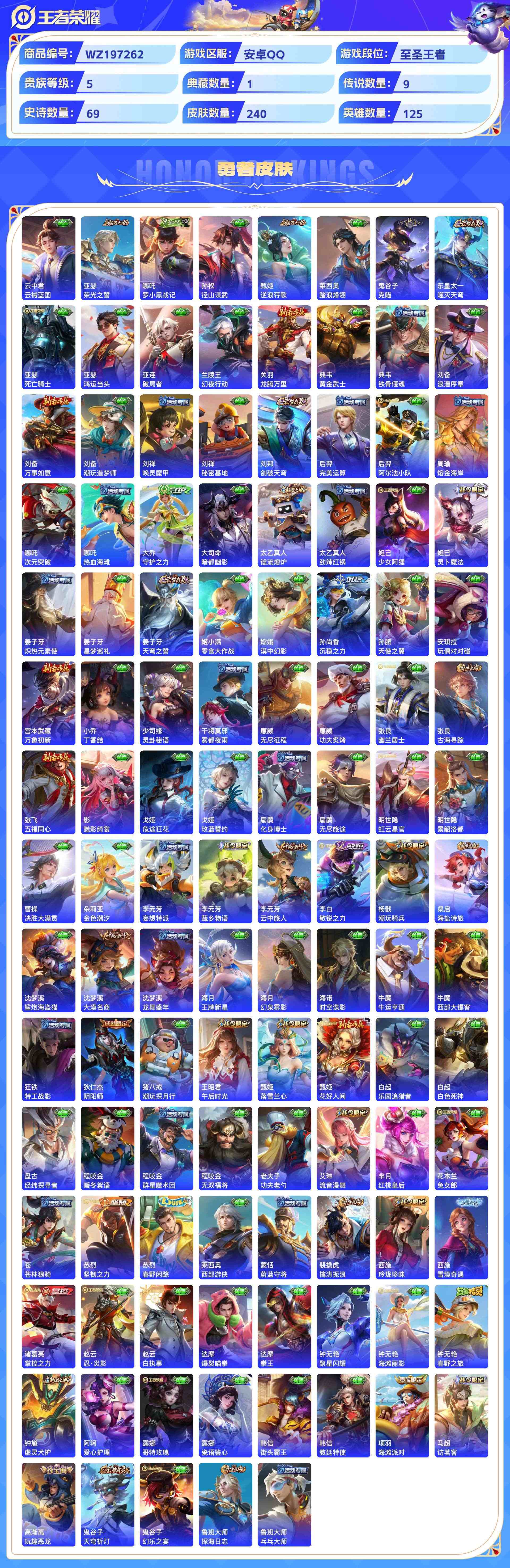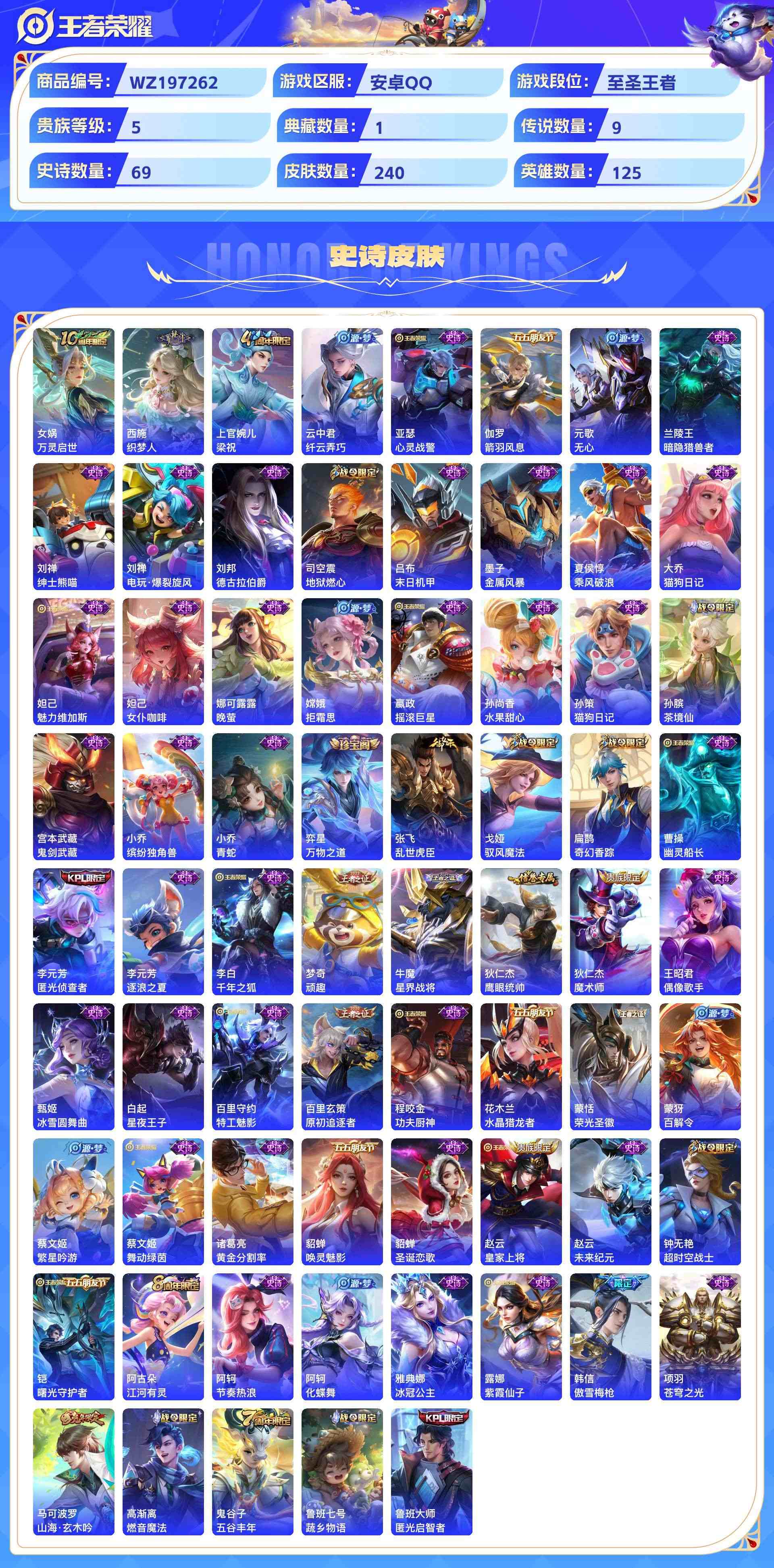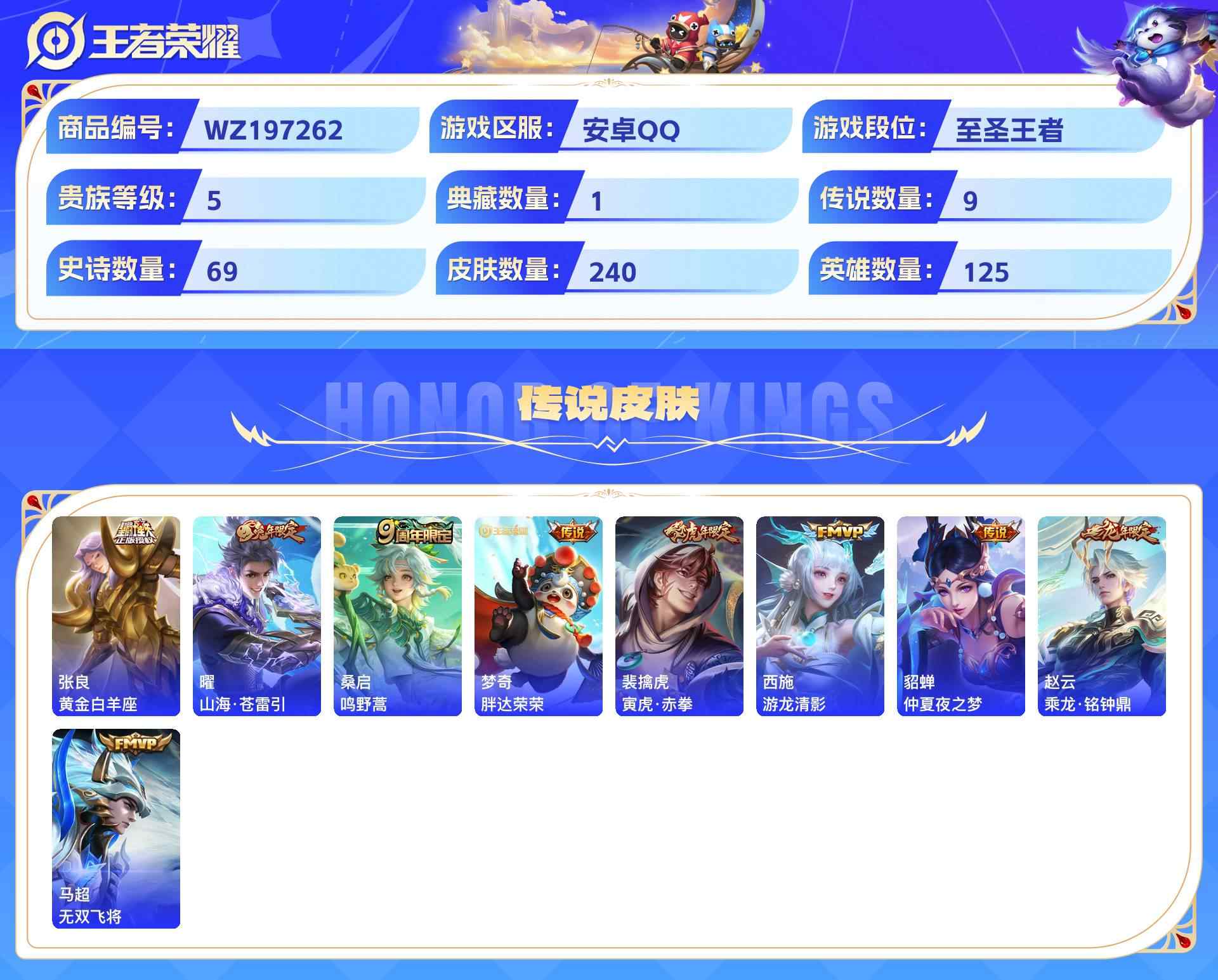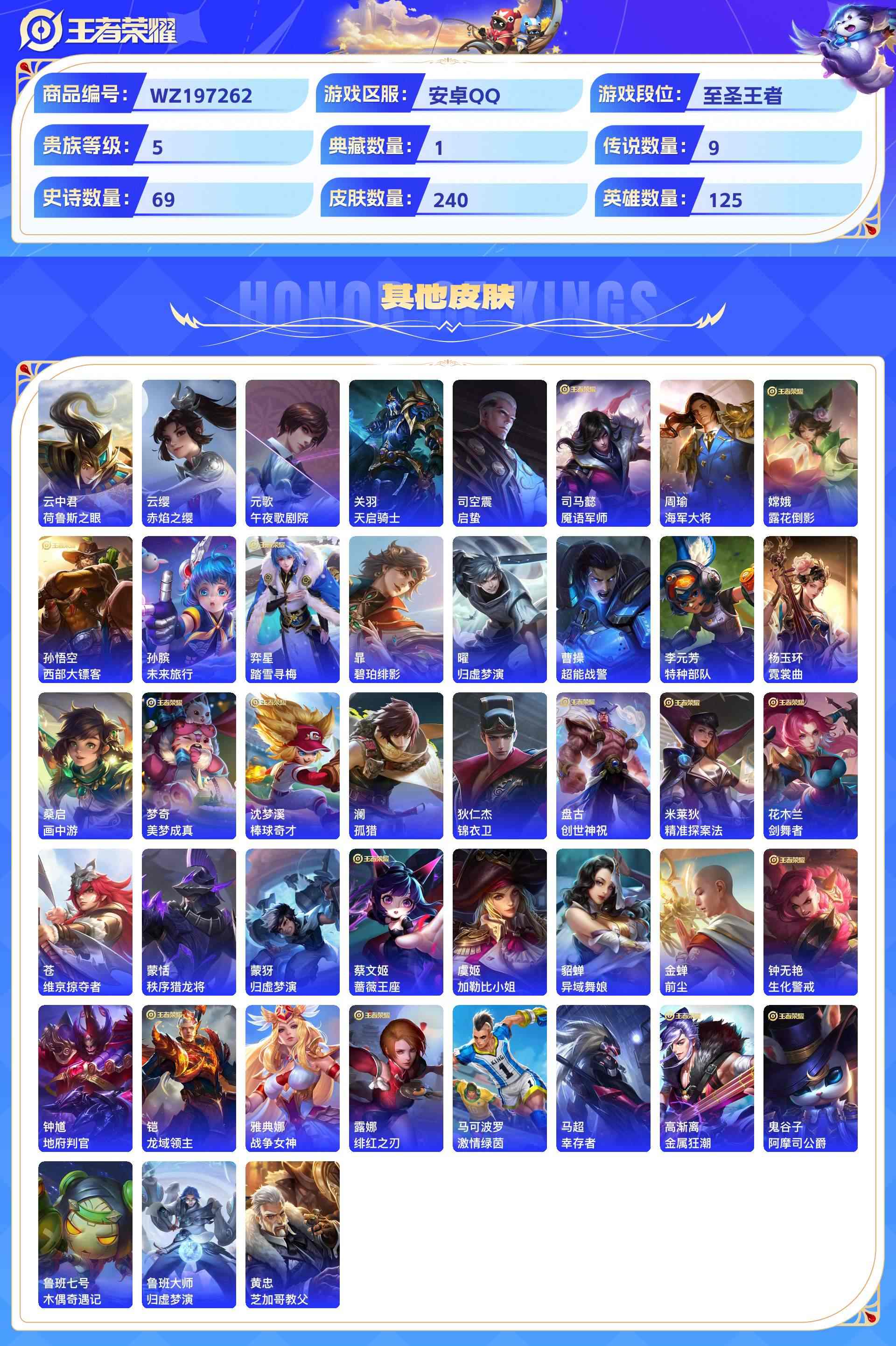 wz197262|精品金标号安卓qq 贵族7级 2金标(鲁班大师 狄仁杰)240皮 1典藏 (弑呛猎影)1无双(雪境奇遇) 9传说(黄金白羊座山海·苍雷引鸣野蒿胖达荣荣寅虎·赤拳游龙清影仲夏夜之梦乘龙·铭钟鼎无双飞将) 69史诗2星传说3个性按键