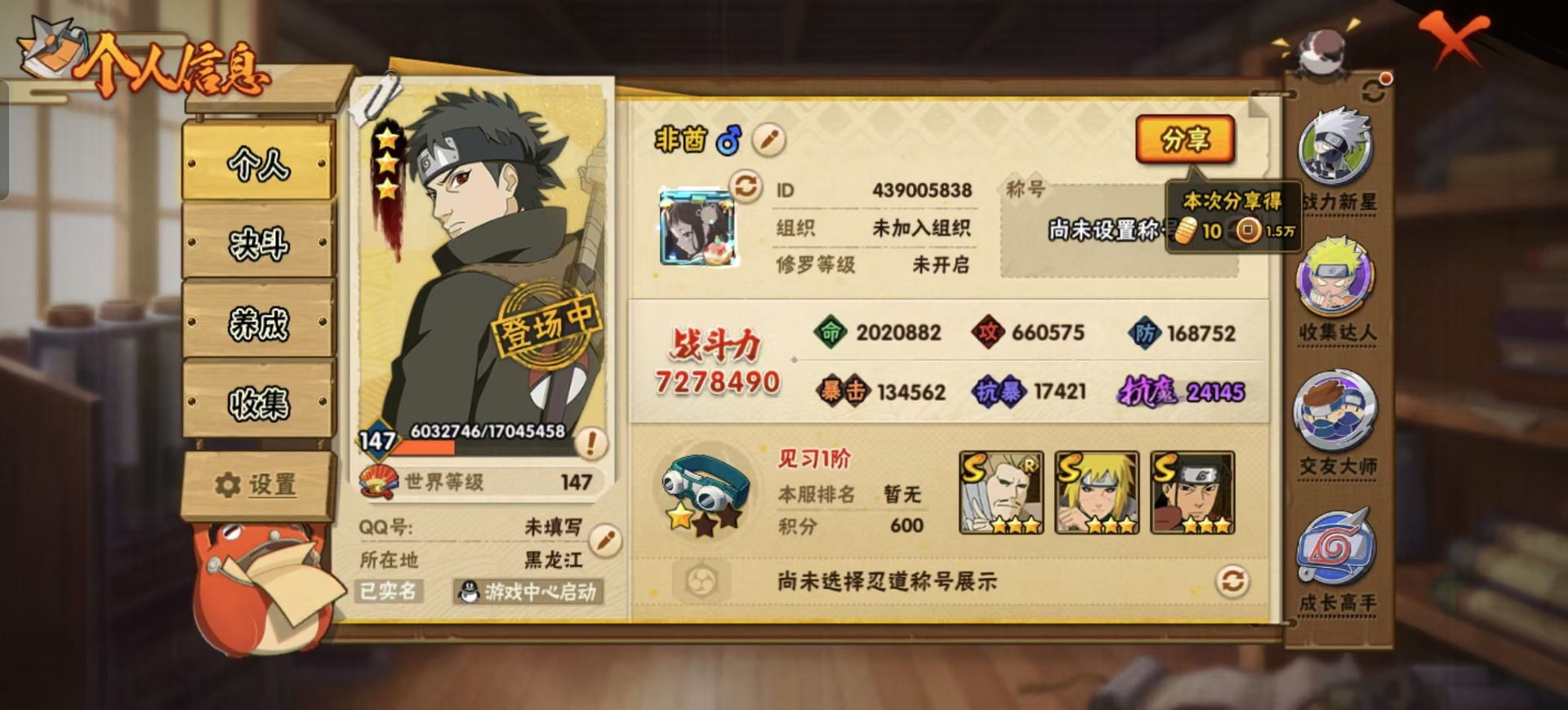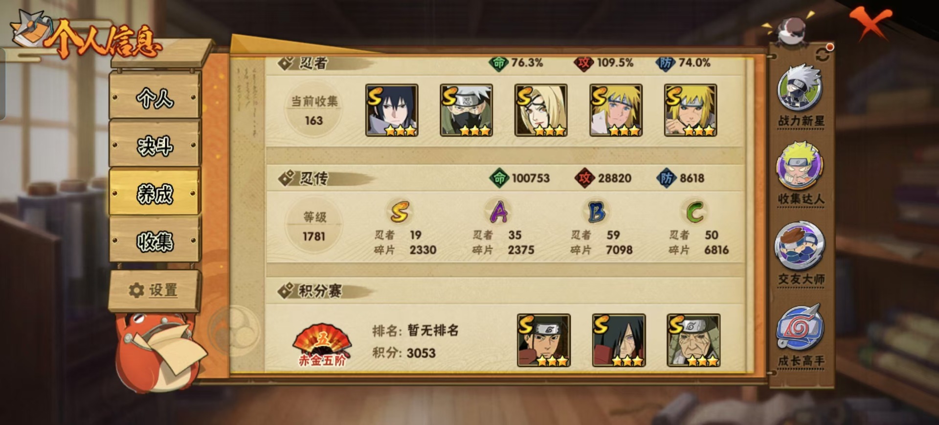 [9698042]v12 19s忍 727.8w战力 可二次 s级忍者:宇智波止水「须佐能乎」艾「忍界大战」宇智波斑「秽土转生·解」宇智波佐助「永恒万花筒」旗木卡卡西「须佐能乎」宇智波斑「秽土转生」艾「三代目雷影」“宇智波斑” 「白面具」纲手「百豪」波风水门「秽土转生」猿飞日斩「秽土转生」长门「秽土转生」鬼灯幻月「二代目水影」宇智波斑千手柱间艾「四代目雷影」神秘面具男佩恩「天道」波风水门