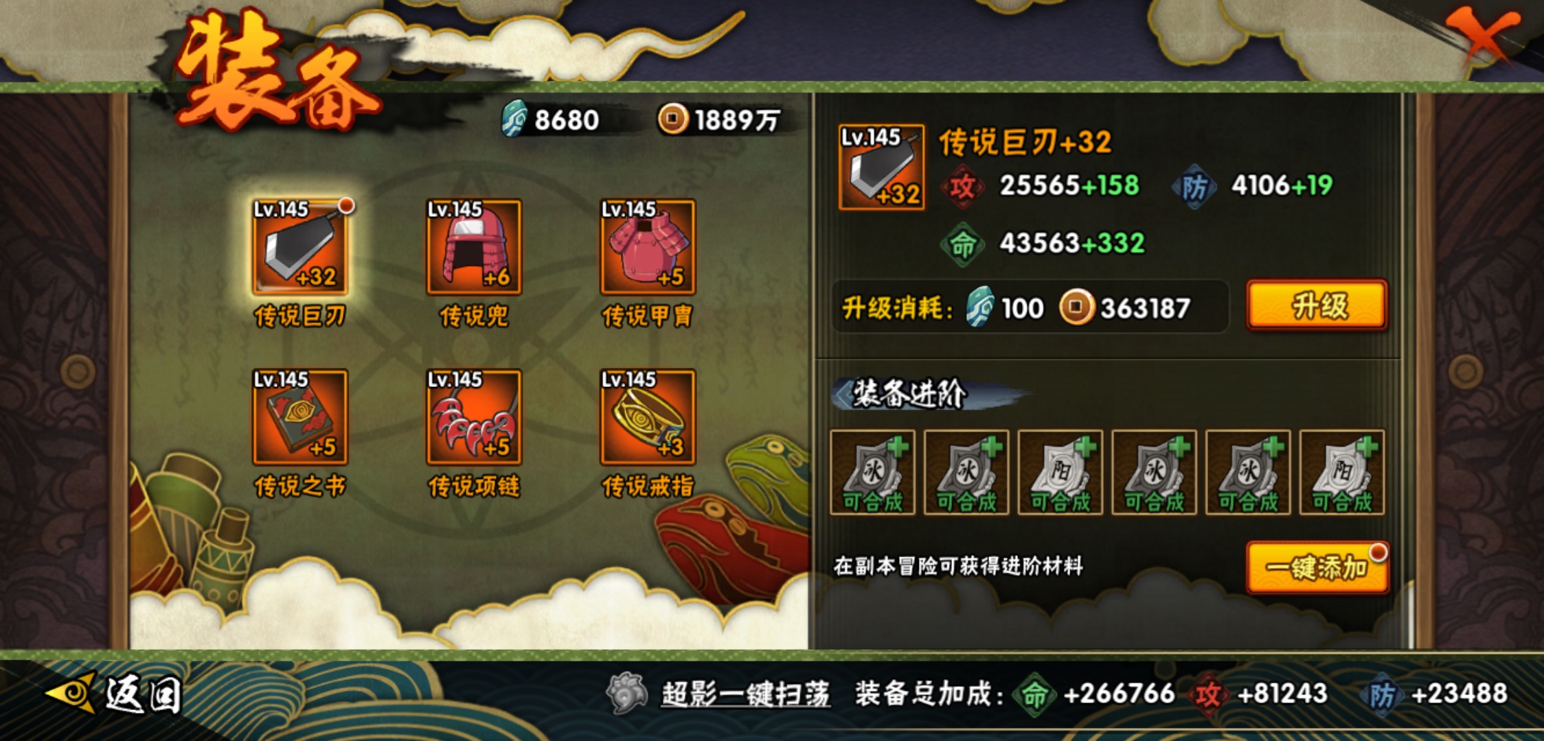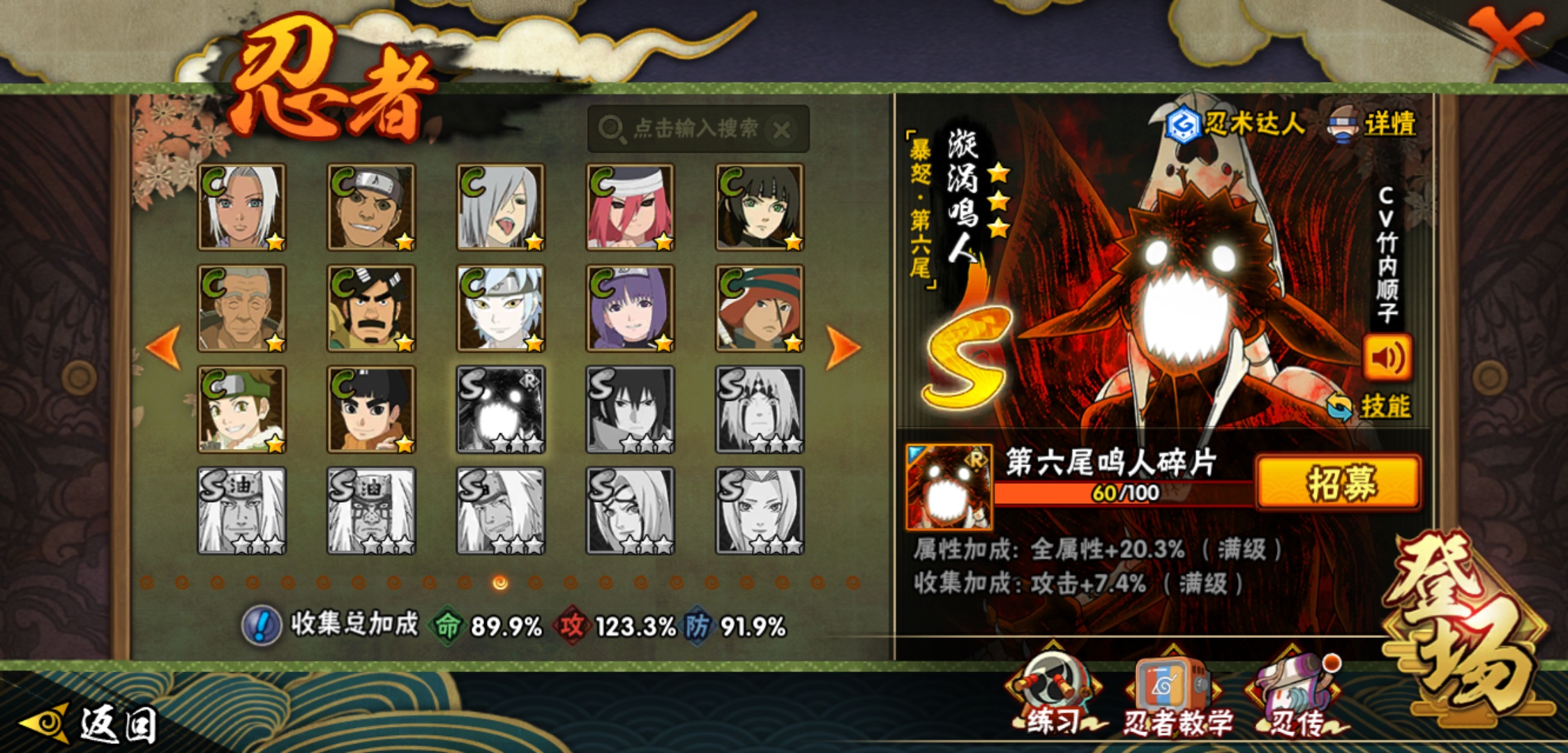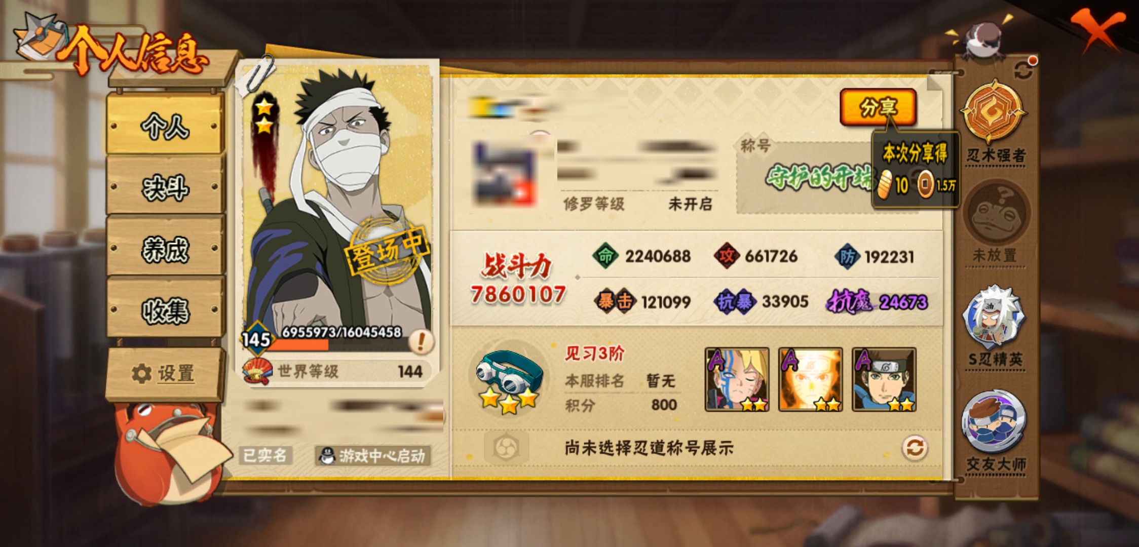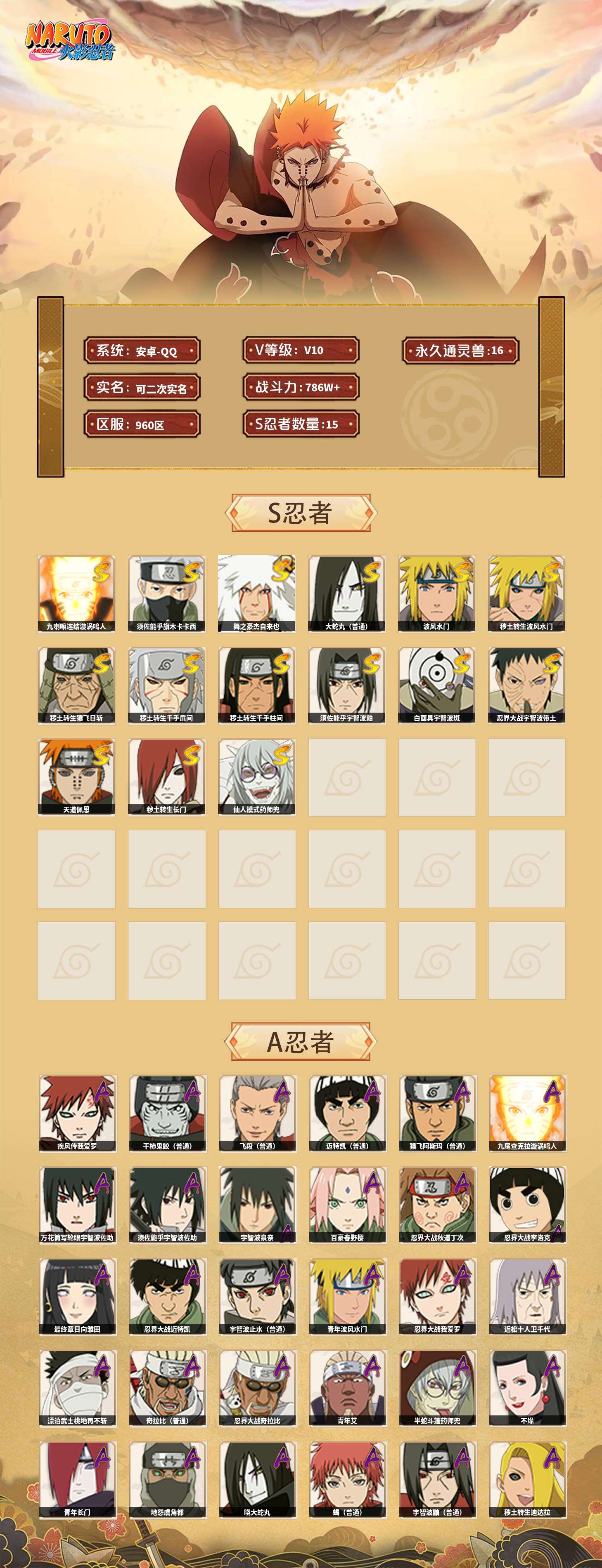 【火影忍者】【lyhy6043】战斗力:786w;段位:见习3阶;本服排名:848;vip:v10级;s忍:15个;a忍:36个;通灵兽:16个,s忍:九喇嘛连结漩涡鸣人|须佐能乎旗木卡卡西|舞之豪杰自来也|大蛇丸(普通)|波风水门|秽土转生波风水门|秽土转生猿飞日斩|秽土转生千手扉间|秽土转生千手柱间|须佐能乎宇智波鼬|白面具宇智波斑|忍界大战宇智波带土|天道佩恩|秽土转生长门|仙人模式药师兜__a忍:疾风传我爱罗 4星|干柿鬼鲛(普通) 4星|飞段(普通) 4星|迈特凯(普通) 3星|猿飞阿斯玛(普通) 3星|九尾查克拉漩涡鸣人|万花筒写轮眼宇智波佐助|须佐能乎宇智波佐助|宇智波泉奈|百豪春野樱|忍界大战秋道丁次|忍界大战李洛克|最终章日向雏田|忍界大战迈特凯|宇智波止水(普通)|青年波风水门|忍界大战我爱罗|近松十人卫千代|漂泊武士桃地再不斩|奇拉比(普通)|忍界大战奇拉比|青年艾|半蛇斗篷药师兜|不缘|青年长门|地怨虞角都|晓大蛇丸|蝎(普通)|宇智波鼬(普通)|秽土转生迪达拉|死司凭血飞段|火之意志继承者卑留呼|羁绊神农|木叶上忍猿飞木叶丸|桃式显现漩涡博人|四代目土影黑土__通灵兽:忍犬(普通)|蓝蛇|蛤蟆吉|忍龟|镰鼬|猿魔|山椒鱼|蜃|蛤蟆仙人|鲛鲨|蛤蟆健|乌鸦(普通)|砂之守鹤|蛤蟆龙|蛤蟆广|蛞蝓(普通)安卓可二次15-5