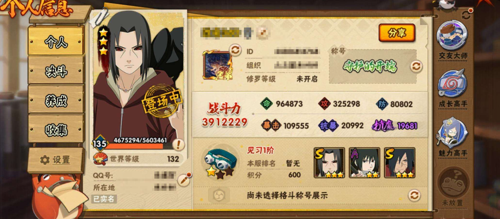 [10253011]hy027 【游戏区服】安卓qq 【vip等级】1 【战力值】3912229 【段位】见习1阶 【战力排名】本服排名:1949,战区排名:未上榜 【忍者星数】219 【s忍】舞之豪杰自来也,大蛇丸,波风水门,秽土转生·解宇智波斑,秽土转生宇智波鼬,天道佩恩 【a忍】迈特凯,疾风传我爱罗,蝎,须佐能乎宇智波佐助,忍界大战秋道丁次,忍界大战日向宁次,幻之真容旗木卡卡西,猿飞阿斯玛,地陆,近松十人卫千代,青年艾,青年长门,干柿鬼鲛,死司凭血飞段,桃式显现漩涡博人