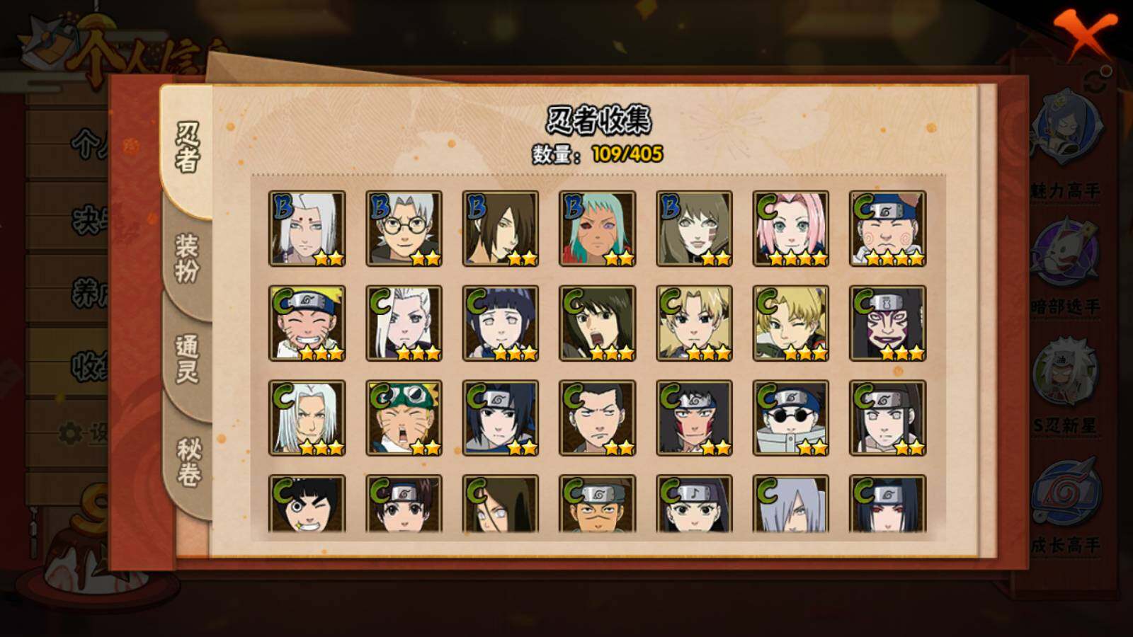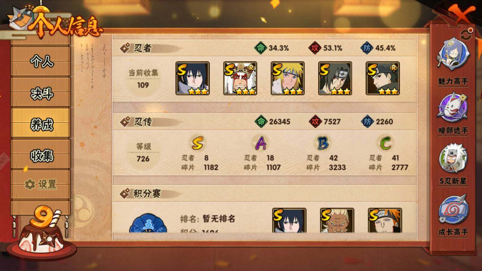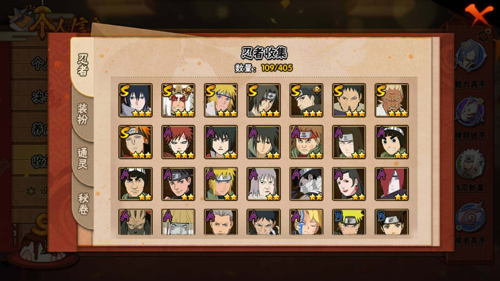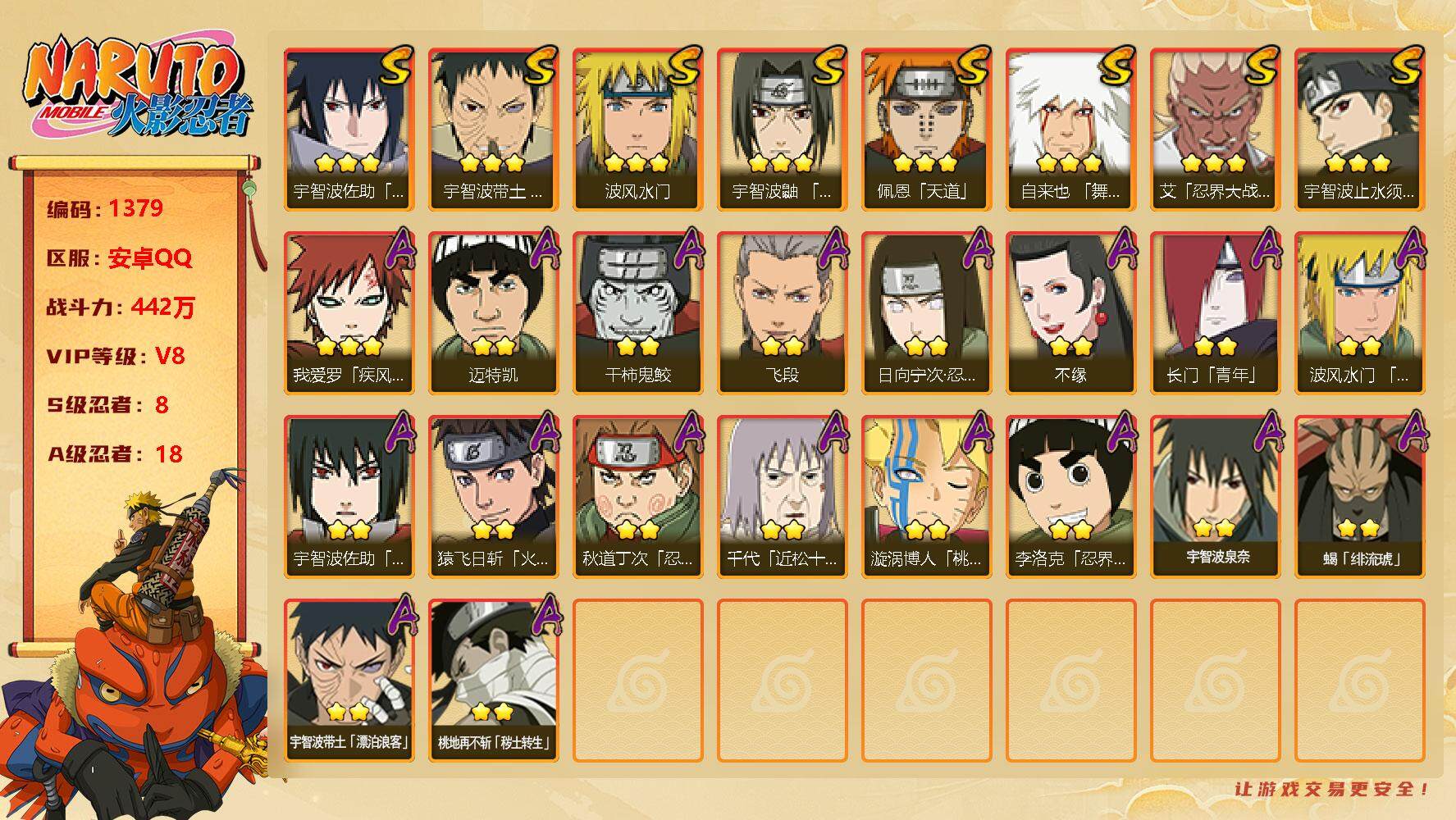[11977018]v8 442万战力 8s级忍者数-18a级忍者数 自来也68片 卡卡西72片 九喇嘛水门59片 sr4079 【s级忍者】:宇智波带土「忍界大战」3星,艾「忍界大战」3星,宇智波鼬「须佐能乎」3星,宇智波止水「须佐能乎」3星,自来也「舞之豪杰」3星,波风水门3星,佩恩「天道」3星,宇智波佐助「永恒万花筒」3星 【a级忍者】:长门「青年」2星,波风水门「青年」2星,飞段2星,干柿鬼鲛2星,漩涡博人「桃式显现」2星,迈特凯2星,桃地再不斩「秽土转生」2星,我爱罗「疾风传」3星,蝎「绯流琥」2星,猿飞日斩「火影继承人」2星,宇智波佐助「万花筒写轮眼」2星,日向宁次「忍界大战」2星,宇智波带土「漂泊浪客」2星,李洛克「忍界大战」2星,秋道丁次「忍界大战」2星,千代「近松十人卫」2星,不缘2星,宇智波泉奈2星