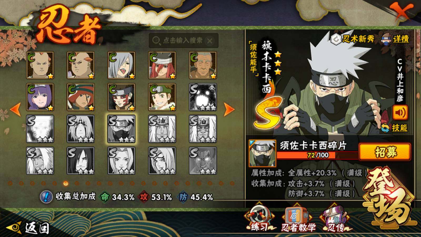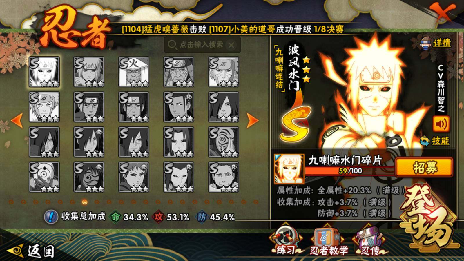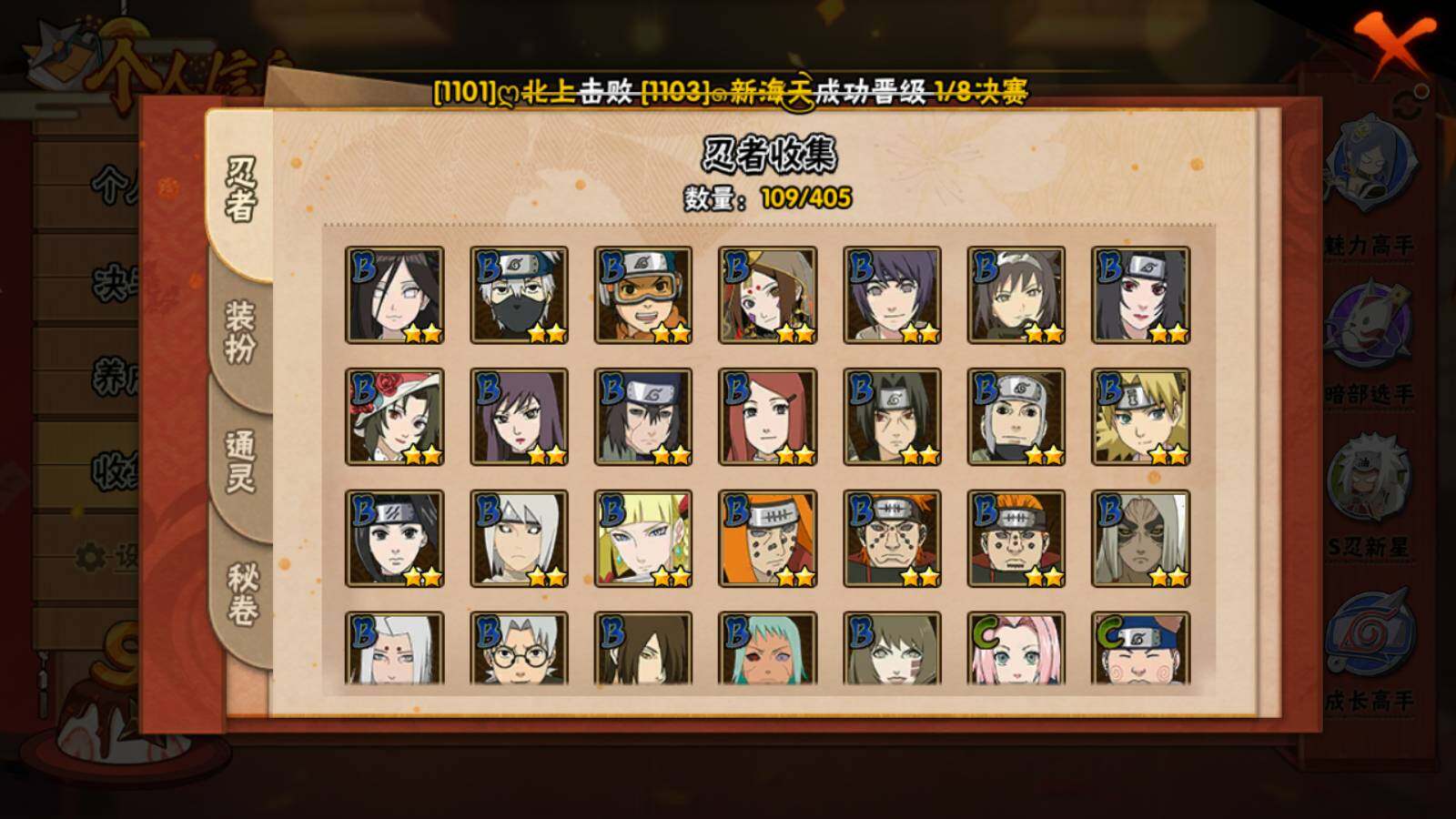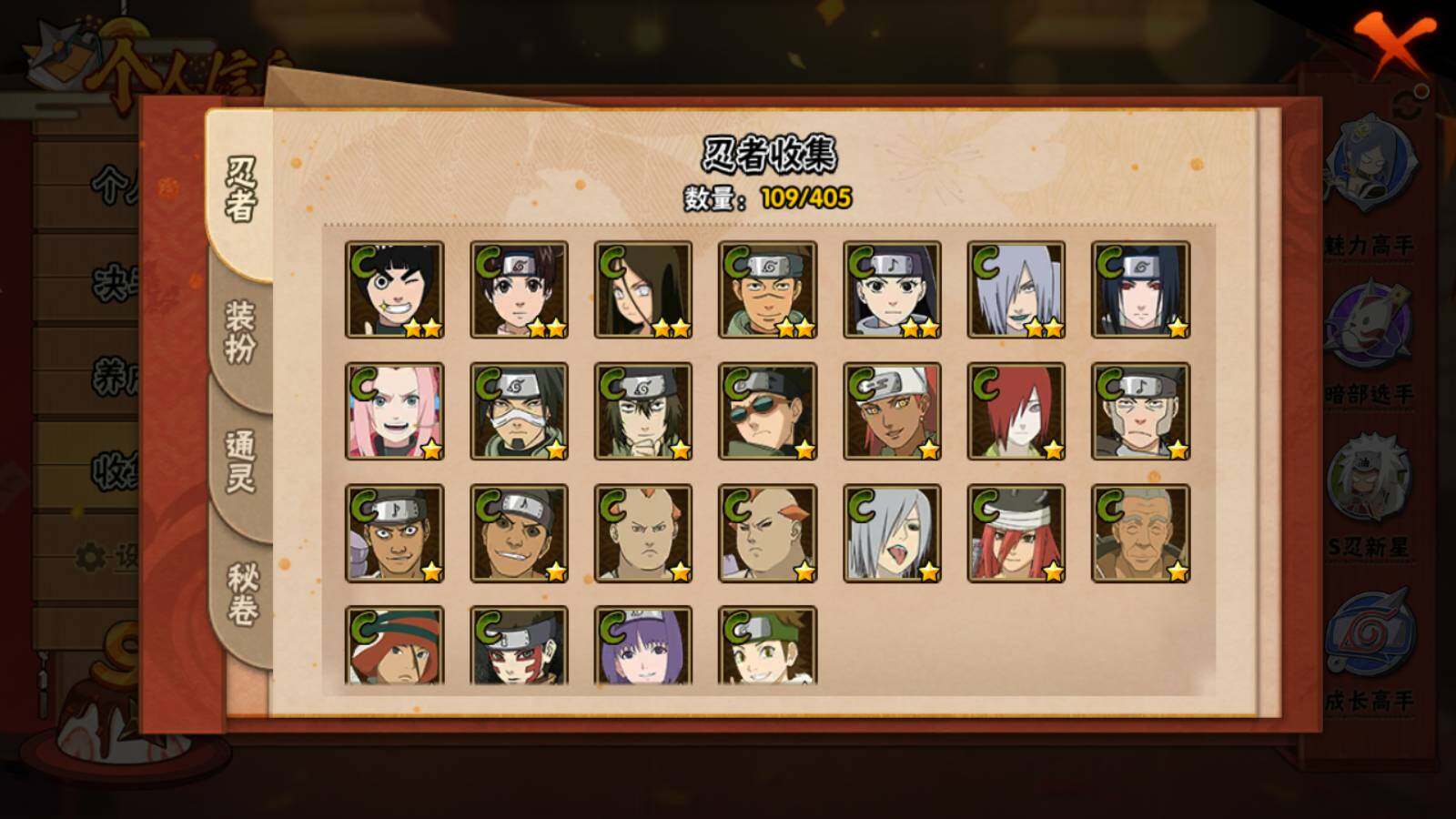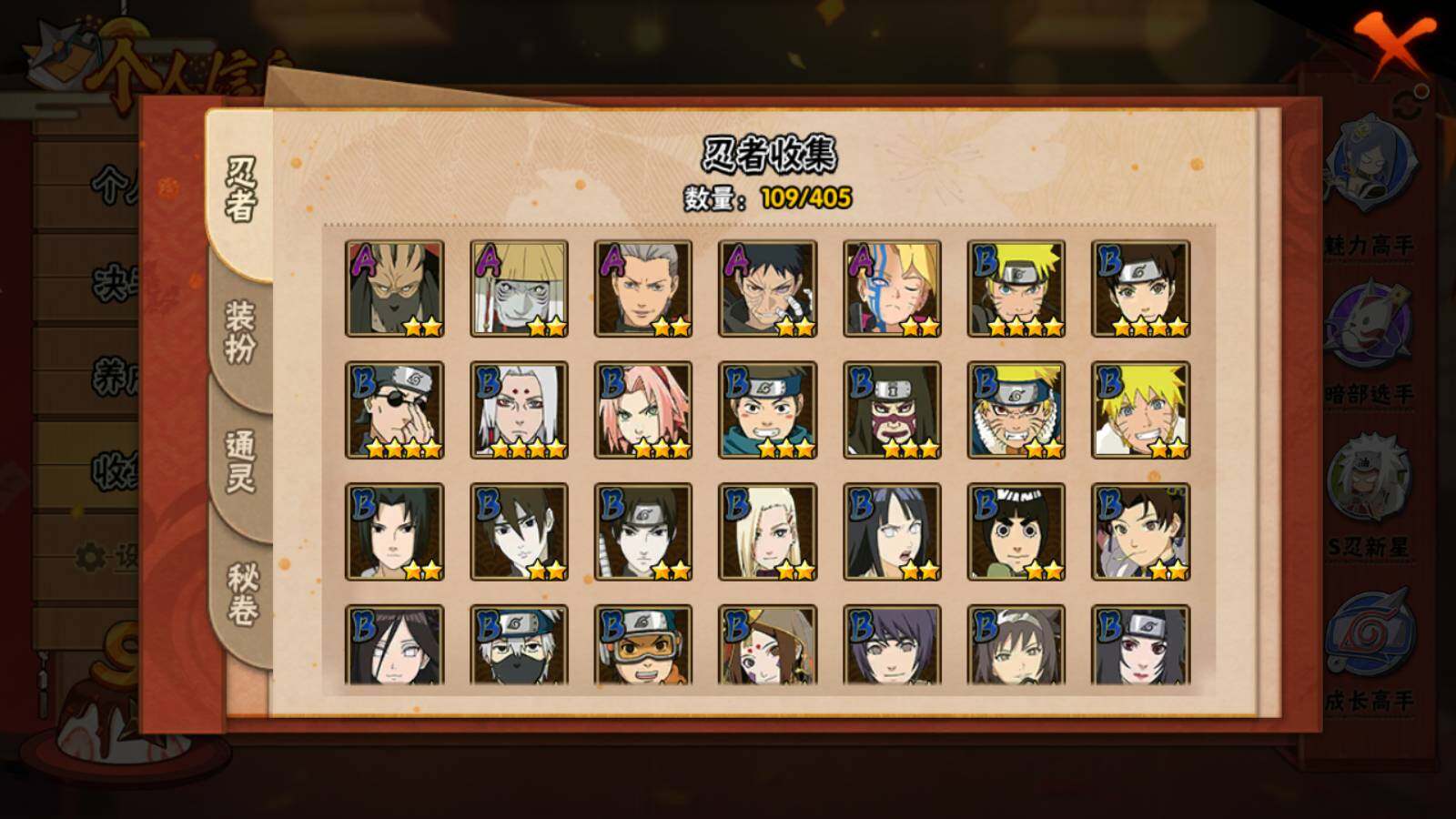[11977018]v8 442万战力 8s级忍者数-18a级忍者数 自来也68片 卡卡西72片 九喇嘛水门59片 sr4079 【s级忍者】:宇智波带土「忍界大战」3星,艾「忍界大战」3星,宇智波鼬「须佐能乎」3星,宇智波止水「须佐能乎」3星,自来也「舞之豪杰」3星,波风水门3星,佩恩「天道」3星,宇智波佐助「永恒万花筒」3星 【a级忍者】:长门「青年」2星,波风水门「青年」2星,飞段2星,干柿鬼鲛2星,漩涡博人「桃式显现」2星,迈特凯2星,桃地再不斩「秽土转生」2星,我爱罗「疾风传」3星,蝎「绯流琥」2星,猿飞日斩「火影继承人」2星,宇智波佐助「万花筒写轮眼」2星,日向宁次「忍界大战」2星,宇智波带土「漂泊浪客」2星,李洛克「忍界大战」2星,秋道丁次「忍界大战」2星,千代「近松十人卫」2星,不缘2星,宇智波泉奈2星