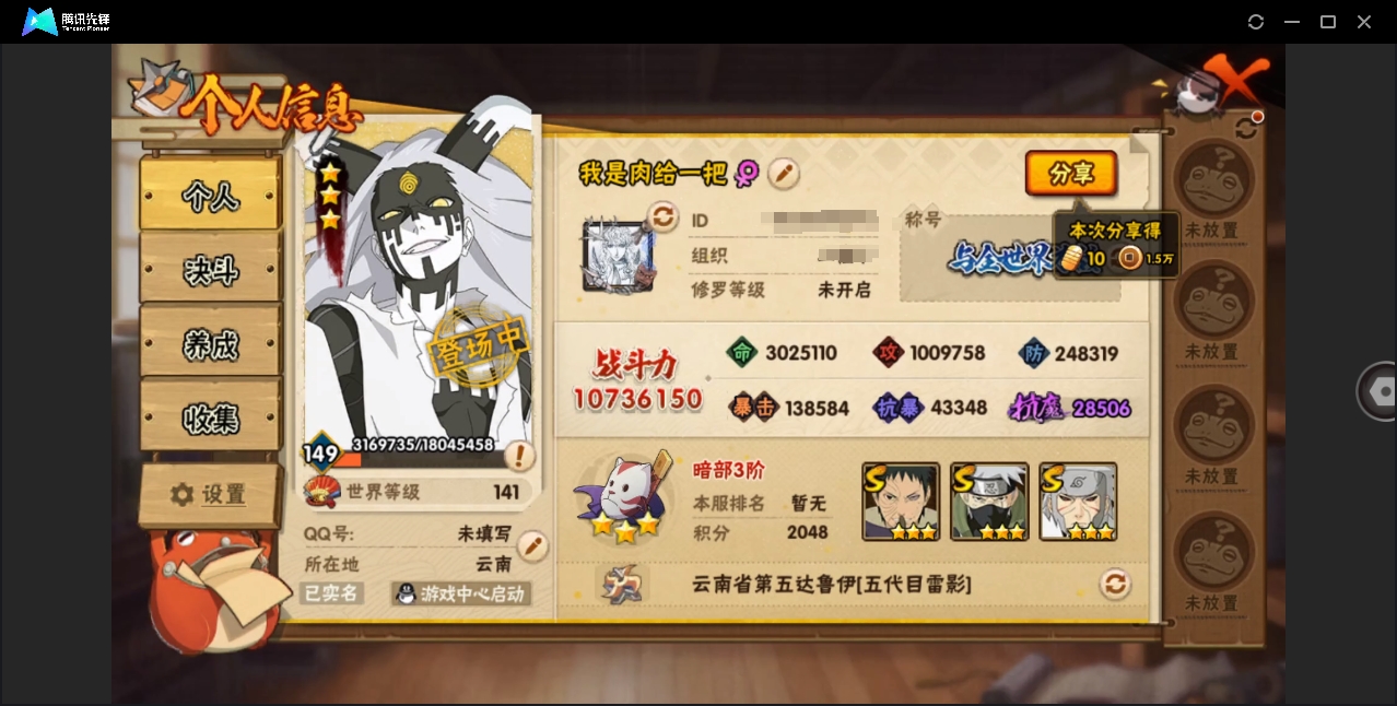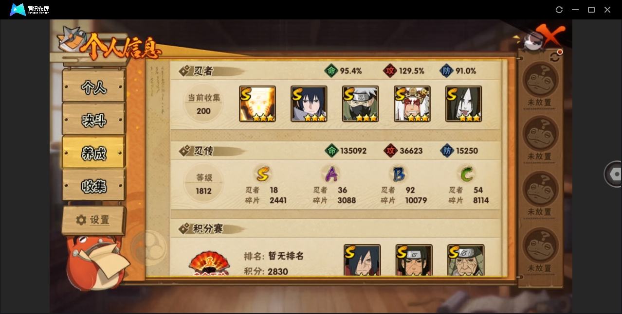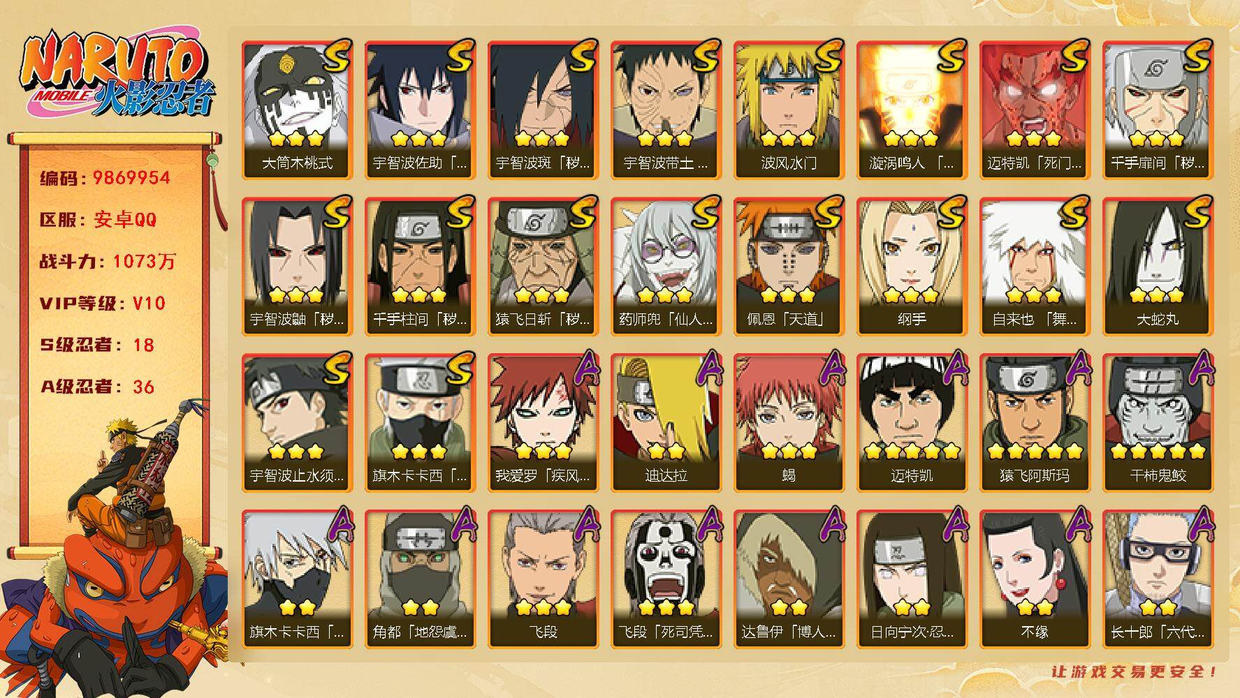 [14073442]【编号36908可秒换绑】【店长推荐精品号】18s级忍者数-36a级忍者数 【s级忍者】:猿飞日斩「秽土转生」3星,千手扉间「秽土转生」3星,千手柱间「秽土转生」3星,宇智波鼬「秽土转生」3星,宇智波斑「秽土转生·解」3星,宇智波带土「忍界大战」3星,宇智波止水「须佐能乎」3星,旗木卡卡西「须佐能乎」3星,自来也「舞之豪杰」3星,大蛇丸3星,纲手3星,波风水门3星,药师兜「仙人模式」3星,漩涡鸣人「九喇嘛连结」3星,迈特凯「死门」3星,佩恩「天道」3星,宇智波佐助「永恒万花筒」3星,大筒木桃式3星 【a级忍者】:艾「青年」2星,波风水门「青年」2星,达鲁伊「博人传」2星,迪达拉2星,迪达拉「秽土转生」2星,奇拉比2星,奇拉比「忍界大战」2星,飞段3星,飞段「死司凭血」3星,干柿鬼鲛5星,漩涡博人「桃式显现」2星,漩涡鸣人「九尾查克拉」2星,迈特凯5星,旗木卡卡西「万花筒写轮眼」2星,我爱罗「疾风传」3星,我爱罗「忍界大战」2星,蝎3星,蝎「绯流琥」2星,角都「地怨虞」2星,角都「秽土转生」2星,猿飞阿斯玛5星,宇智波止水「新春限定」2星,宇智波鼬2星,宇智波佐助「须佐能乎」2星,宇智波佐助「万花筒写轮眼」2星,药师兜「半蛇斗篷」2星,日向宁次「忍界大战」2星,长十郎「六代目水影」2星,李洛克「忍界大战」2星,猿飞木叶丸「博人传」2星,黑土「博人传」2星,春野樱「百豪」2星,秋道丁次「忍界大战」2星,千代「近松十人卫」2星,不缘2星,宇智波泉奈2星