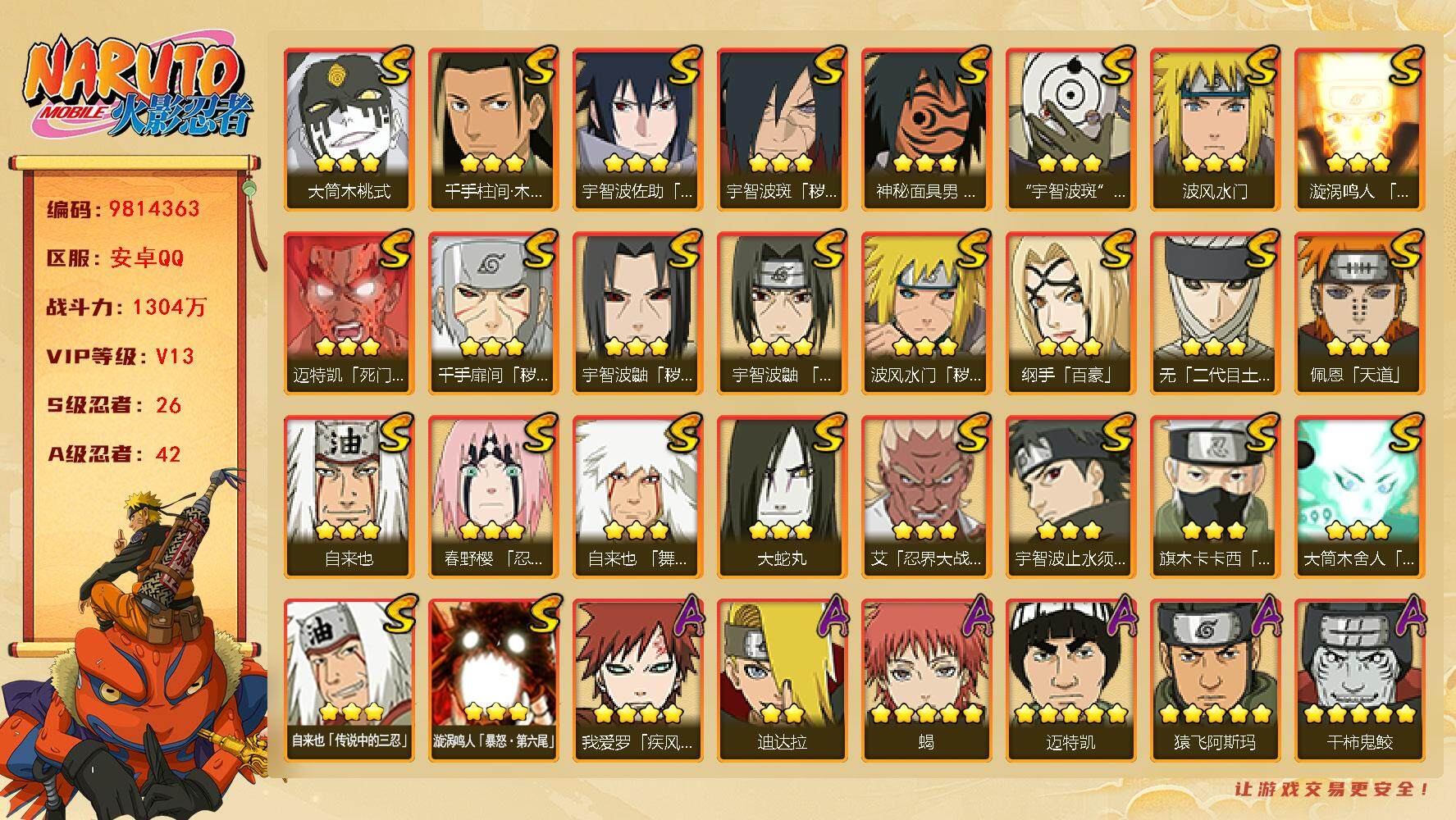 [14475327]【编号16086可秒换绑】【店长推荐精品号】26s级忍者数-42a级忍者数 【s级忍者】:波风水门「秽土转生」3星,千手扉间「秽土转生」3星,宇智波鼬「秽土转生」3星,宇智波斑「秽土转生·解」3星,春野樱「忍界大战」3星,艾「忍界大战」3星,宇智波鼬「须佐能乎」3星,宇智波止水「须佐能乎」3星,旗木卡卡西「须佐能乎」3星,千手柱间「木叶创立」3星,无「二代目土影」3星,自来也3星,自来也「舞之豪杰」3星,大蛇丸3星,自来也「传说中的三忍」3星,纲手「百豪」3星,波风水门3星,神秘面具男「红夜之刃」3星,漩涡鸣人「九喇嘛连结」3星,迈特凯「死门」3星,佩恩「天道」3星,宇智波佐助「永恒万花筒」3星,宇智波斑 「白面具」3星宇智波斑「白面具」,大筒木桃式3星,大筒木舍人「最终章」3星,漩涡鸣人「暴怒·第六尾」3星 【a级忍者】:艾「青年」2星,长门「青年」2星,波风水门「青年」2星,迪达拉2星,迪达拉「秽土转生」2星,奇拉比2星,奇拉比「忍界大战」2星,飞段3星,飞段「死司凭血」3星,干柿鬼鲛5星,漩涡博人「桃式显现」3星,漩涡鸣人「仙人模式」2星,漩涡鸣人「九尾查克拉」2星,迈特凯5星,旗木卡卡西「万花筒写轮眼」2星,旗木卡卡西「幻之真容」2星,我爱罗「疾风传」4星,我爱罗「新春限定」2星,我爱罗「忍界大战」2星,蝎5星,蝎「绯流琥」2星,小南2星,小南「漂泊浪客」2星,角都「秽土转生」2星,猿飞阿斯玛5星,宇智波止水2星,宇智波鼬2星,宇智波鼬「夏日限定」2星,宇智波佐助「须佐能乎」2星,宇智波佐助「万花筒写轮眼」2星,药师兜「半蛇斗篷」2星,日向宁次「忍界大战」3星,宇智波带土「漂泊浪客」2星,长十郎「六代目水影」2星,神秘面具男「忍者之路」2星,佩恩·六道「漂泊浪客」2星,李洛克「忍界大战」2星,猿飞木叶丸「博人传」2星,秋道丁次「忍界大战」2星,千代「近松十人卫」2星,神农「羁绊」2星,宇智波泉奈2星