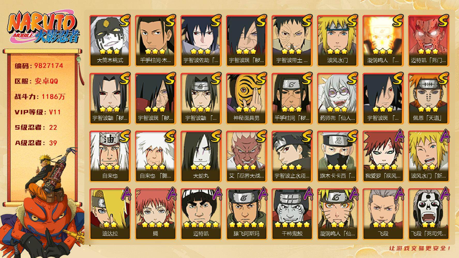 [14477118]【编号39795可秒换绑】店长推荐特价处理精品号22s级忍者数-39a级忍者数 【s级忍者】:千手柱间「秽土转生」3星,宇智波鼬「秽土转生」3星,宇智波斑「秽土转生」3星,宇智波斑「秽土转生·解」3星,宇智波带土「忍界大战」3星,艾「忍界大战」3星,宇智波鼬「须佐能乎」3星,宇智波止水「须佐能乎」3星,旗木卡卡西「须佐能乎」3星,宇智波斑「木叶创立」3星,千手柱间「木叶创立」3星,自来也3星,自来也「舞之豪杰」3星,大蛇丸3星,波风水门3星,药师兜「仙人模式」3星,神秘面具男3星,漩涡鸣人「九喇嘛连结」3星,迈特凯「死门」3星,佩恩「天道」3星,宇智波佐助「永恒万花筒」3星,大筒木桃式3星 【a级忍者】:艾「青年」2星,长门「青年」2星,波风水门「青年」2星,波风水门「新春限定」2星,达鲁伊「博人传」2星,迪达拉2星,大蛇丸「晓」2星,奇拉比「忍界大战」2星,飞段3星,飞段「死司凭血」2星,干柿鬼鲛5星,漩涡博人「桃式显现」2星,漩涡鸣人「仙人模式」2星,漩涡鸣人「九尾查克拉」2星,迈特凯5星,旗木卡卡西「幻之真容」2星,我爱罗「疾风传」4星,蝎4星,角都「秽土转生」2星,猿飞阿斯玛5星,宇智波止水「新春限定」2星,宇智波鼬2星,宇智波鼬「新春限定」2星,宇智波佐助「须佐能乎」2星,宇智波佐助「疾风传咒印」2星,宇智波佐助「万花筒写轮眼」2星,照美冥「五代目水影」2星,日向宁次「忍界大战」2星,日向雏田「最终章」2星,宇智波带土「暴怒」2星,长十郎「六代目水影」2星,佩恩·六道「漂泊浪客」2星,李洛克「忍界大战」2星,猿飞木叶丸「博人传」2星,黑土「博人传」2星,千手扉间「漂泊武士」2星,秋道丁次「忍界大战」2星,千代「近松十人卫」2星,宇智波泉奈2星