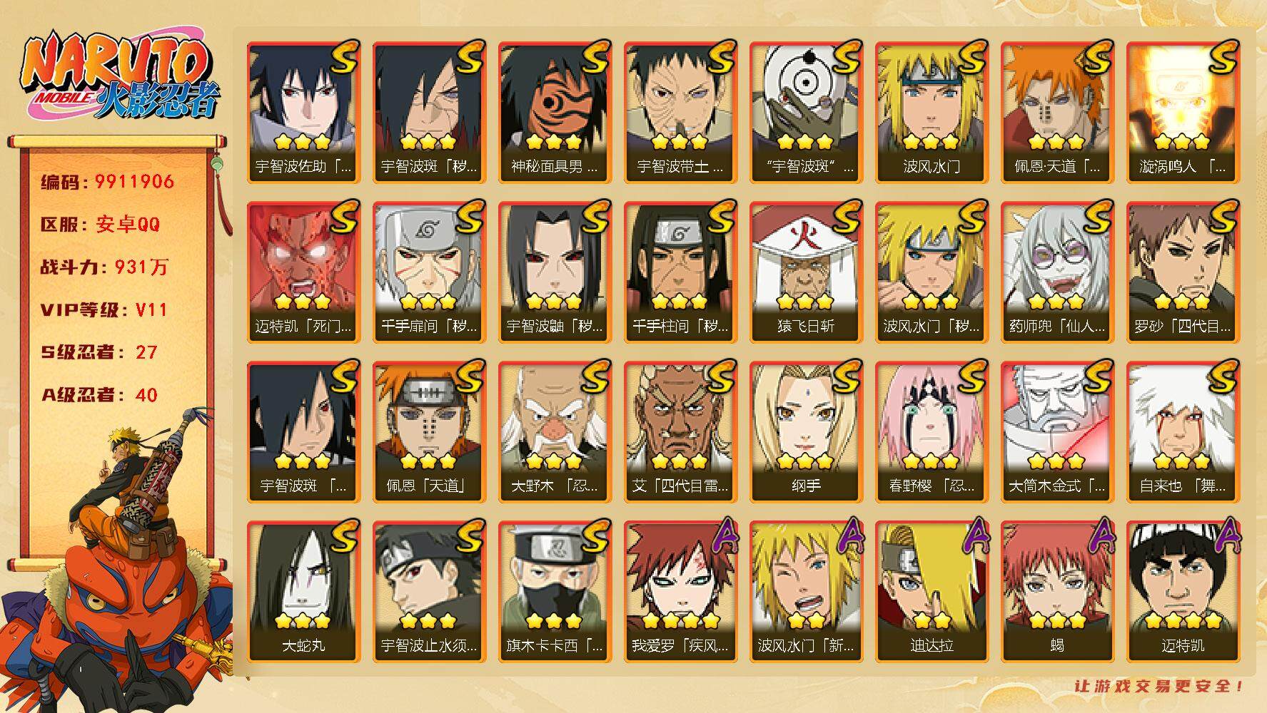 [14497775]【编号69454可秒换绑】【店长推荐捡漏号】27s级忍者数-40a级忍者数 【s级忍者】:波风水门「秽土转生」3星,千手扉间「秽土转生」3星,千手柱间「秽土转生」3星,宇智波鼬「秽土转生」3星,宇智波斑「秽土转生·解」3星,大野木「忍界大战」3星,春野樱「忍界大战」3星,宇智波带土「忍界大战」3星,宇智波止水「须佐能乎」3星,旗木卡卡西「须佐能乎」3星,宇智波斑「木叶创立」3星,艾「四代目雷影」3星,罗砂「四代目风影」3星,自来也「舞之豪杰」3星,大蛇丸3星,纲手3星,猿飞日斩3星,波风水门3星,药师兜「仙人模式」3星,神秘面具男「红夜之刃」3星,漩涡鸣人「九喇嘛连结」3星,迈特凯「死门」3星,佩恩「天道」3星,佩恩·天道「超」3星,宇智波佐助「永恒万花筒」3星,宇智波斑 「白面具」3星宇智波斑「白面具」,大筒木金式3星 【a级忍者】:艾「青年」2星,长门「青年」2星,波风水门「青年」2星,波风水门「新春限定」2星,达鲁伊「博人传」2星,迪达拉2星,迪达拉「秽土转生」2星,大蛇丸「晓」2星,奇拉比2星,奇拉比「忍界大战」2星,飞段3星,飞段「死司凭血」3星,干柿鬼鲛4星,漩涡博人「桃式显现」2星,漩涡鸣人「九尾查克拉」2星,迈特凯4星,旗木卡卡西「幻之真容」2星,我爱罗「疾风传」4星,蝎3星,小南2星,小南「漂泊浪客」2星,猿飞阿斯玛4星,宇智波止水「新春限定」2星,宇智波鼬2星,宇智波佐助「须佐能乎」2星,宇智波佐助「万花筒写轮眼」2星,照美冥「侠隐江湖」2星,照美冥「夏日泳装」2星,照美冥「五代目水影」2星,日向宁次「忍界大战」2星,日向雏田「最终章」2星,长十郎「六代目水影」2星,纲手「侠隐江湖」2星,佩恩·六道「漂泊浪客」2星,李洛克「忍界大战」2星,黑土「博人传」2星,千手扉间「漂泊武士」2星,秋道丁次「忍界大战」2星,千代「近松十人卫」2星,志村团藏2星